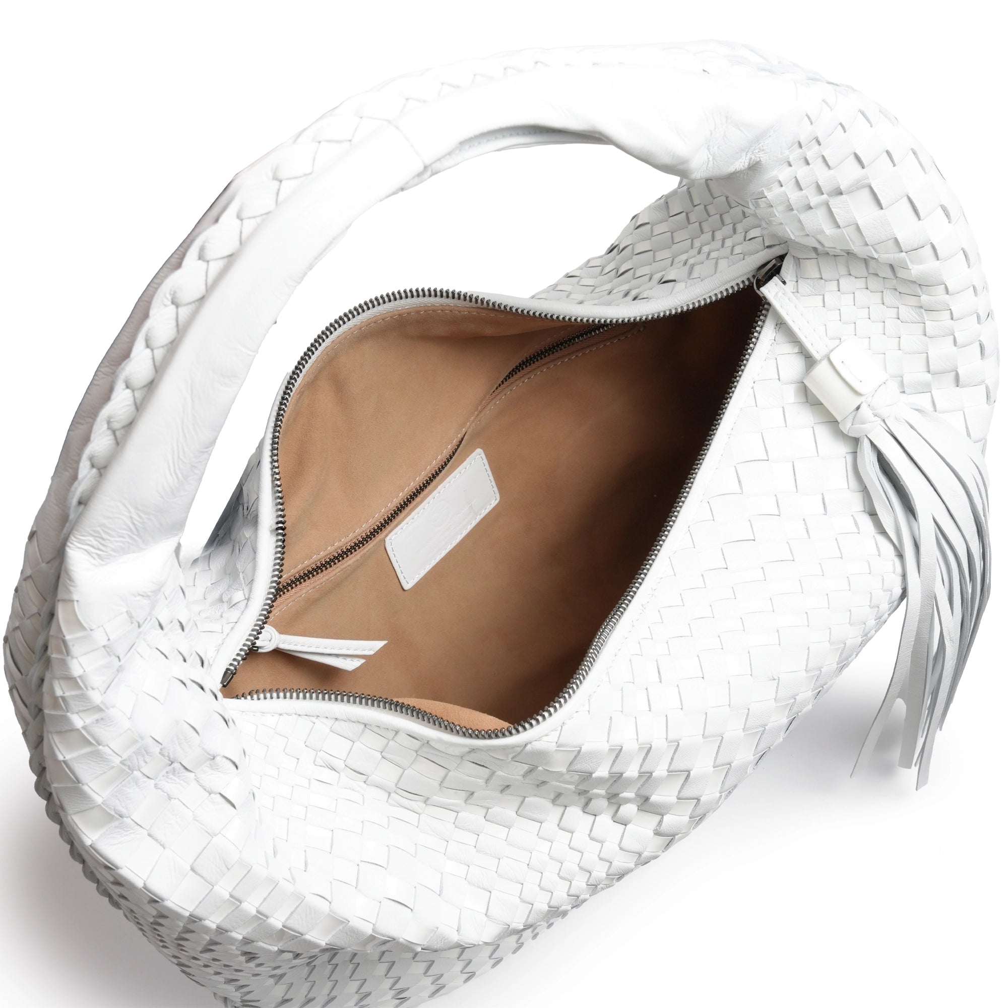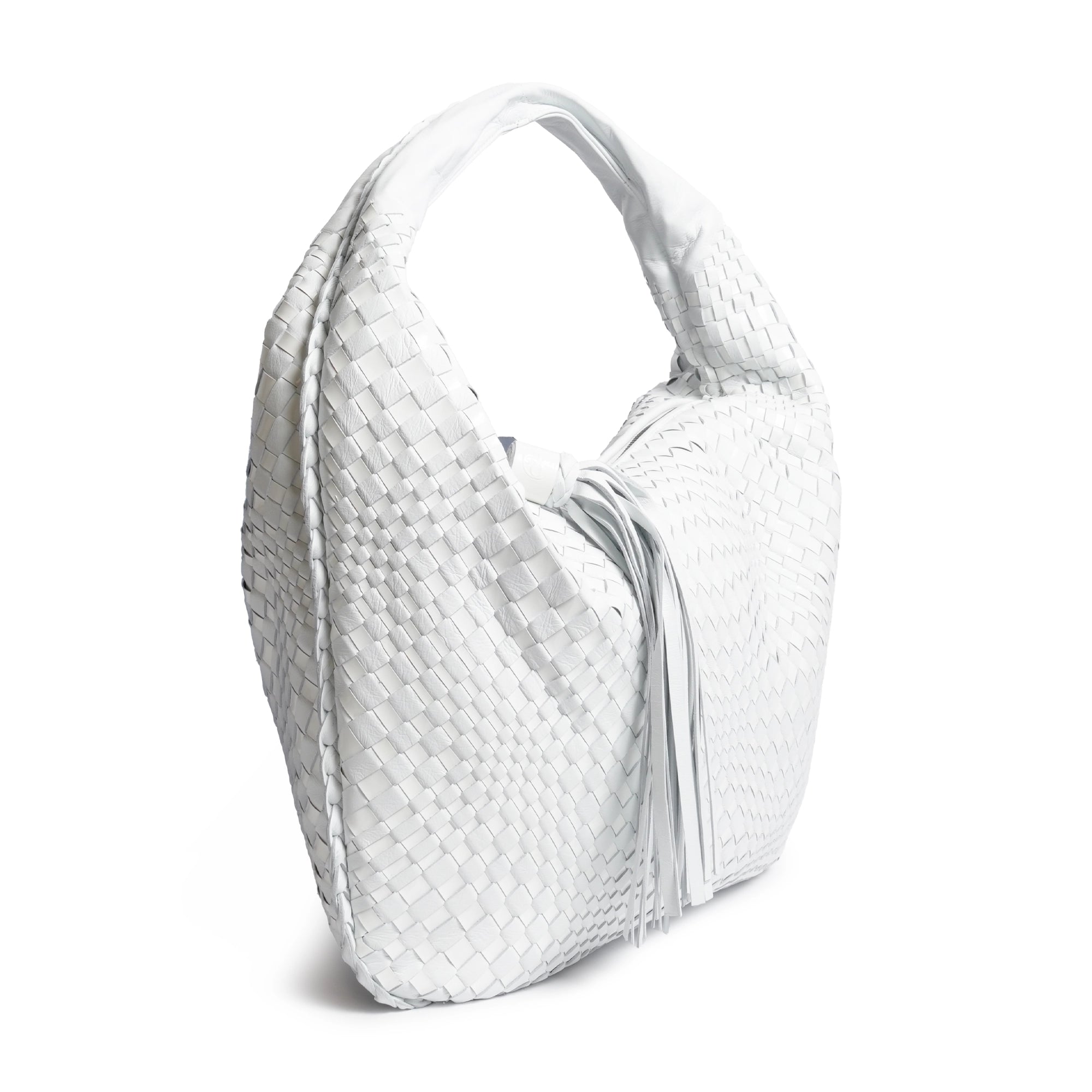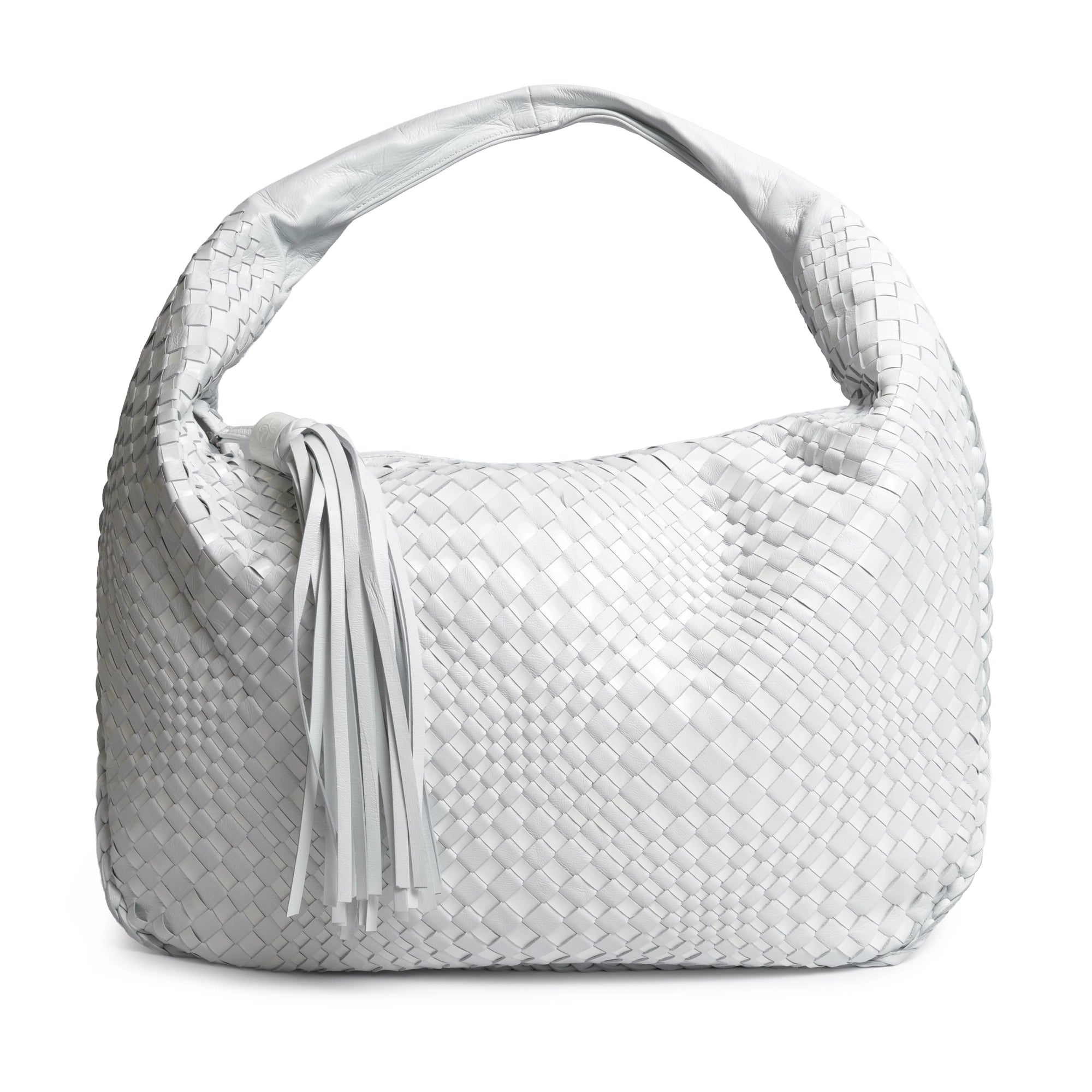 Inspired by the shape of the timeless hobo bags, the "Brigitte Is" features as an intrecciato optical Nappa and Patent Leather Hobo Bag in White and a signature part of our collection.