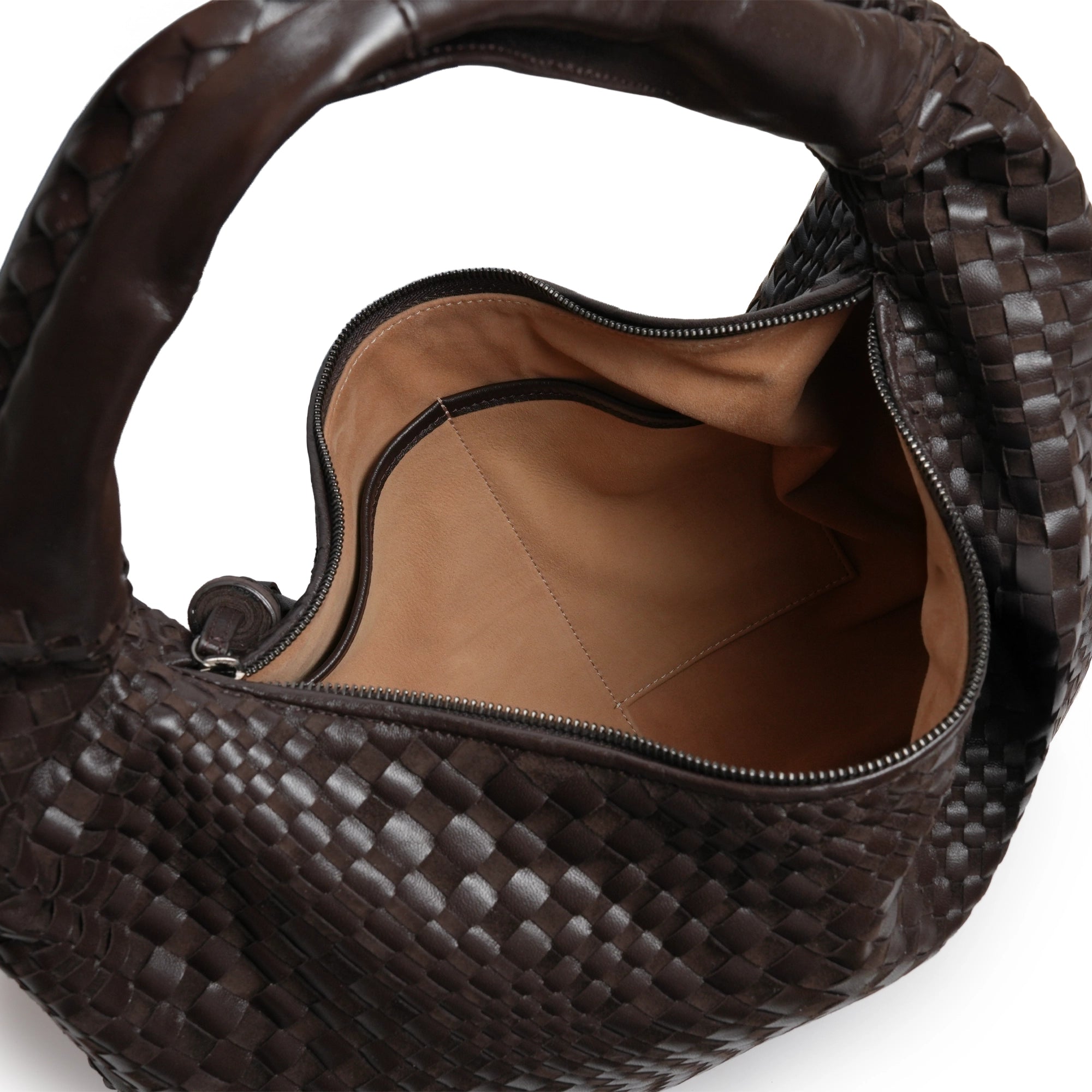 Inspired by the shape of the timeless hobo bags, the "Brigitte Is" features as an intrecciato optical Nappa and Suede Leather Hobo Bag in Testa di Moro (Dark Brown) and a signature part of our collection.