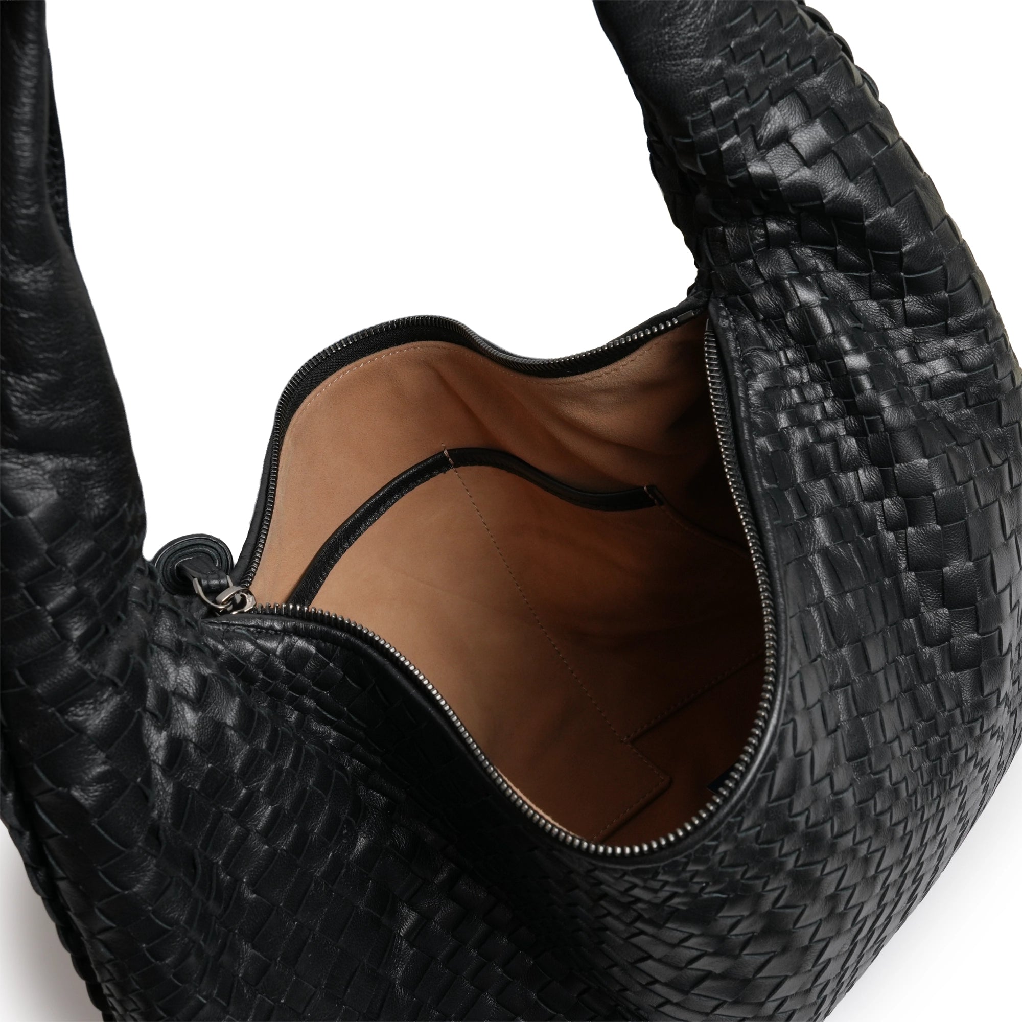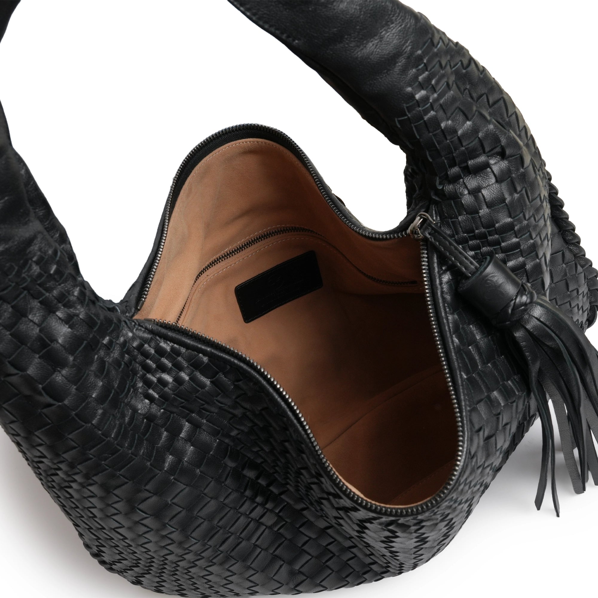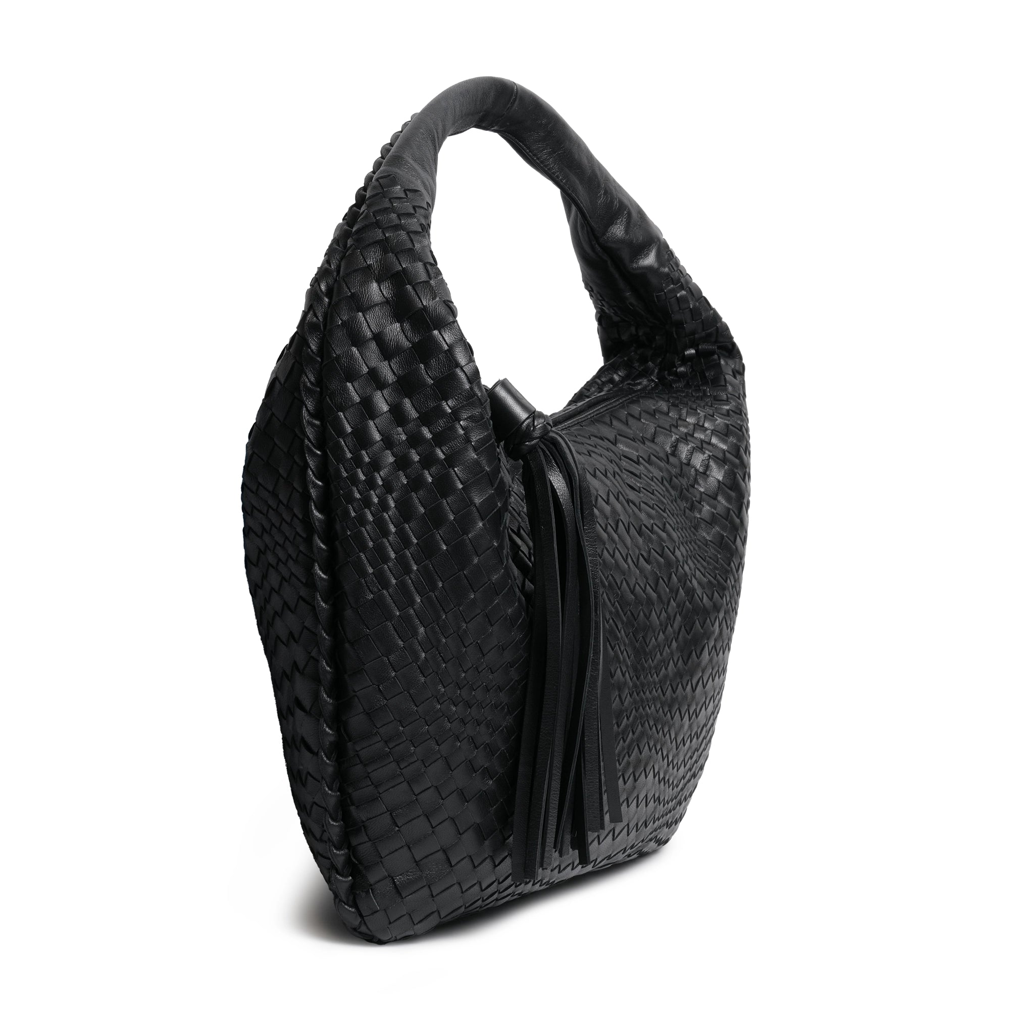 Inspired by the shape of the timeless hobo bags, the "Brigitte Is" features as an intrecciato optical Nappa Leather Hobo Bag in Black and a signature part of our collection.