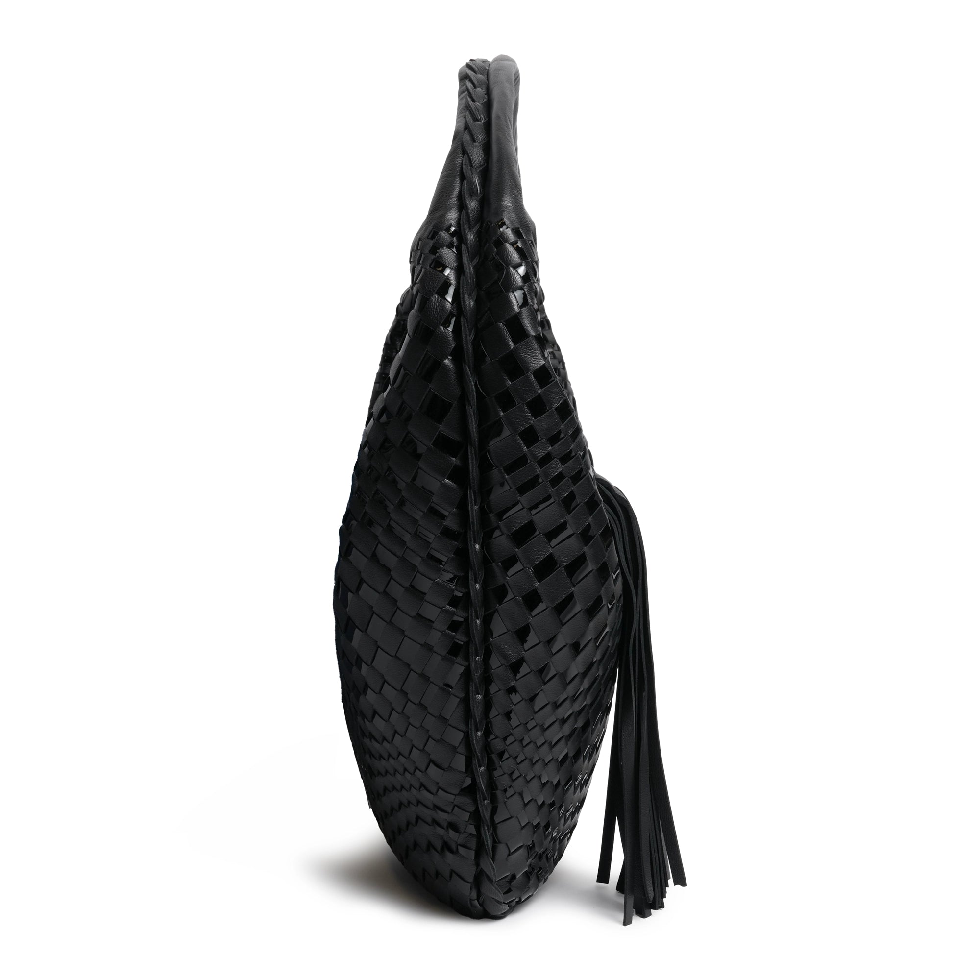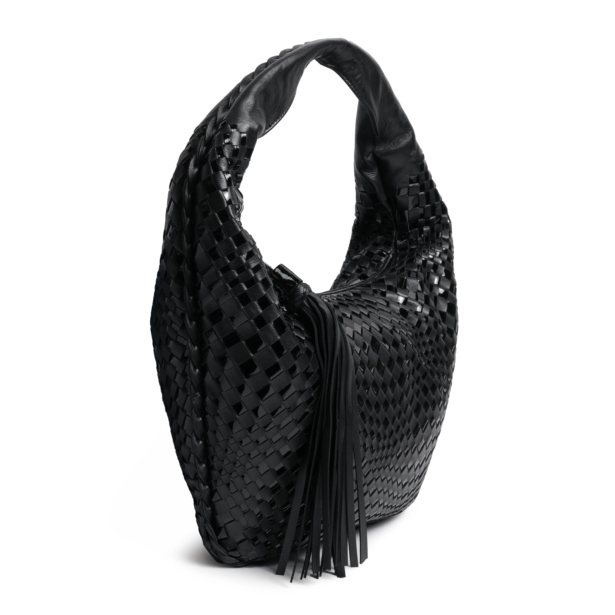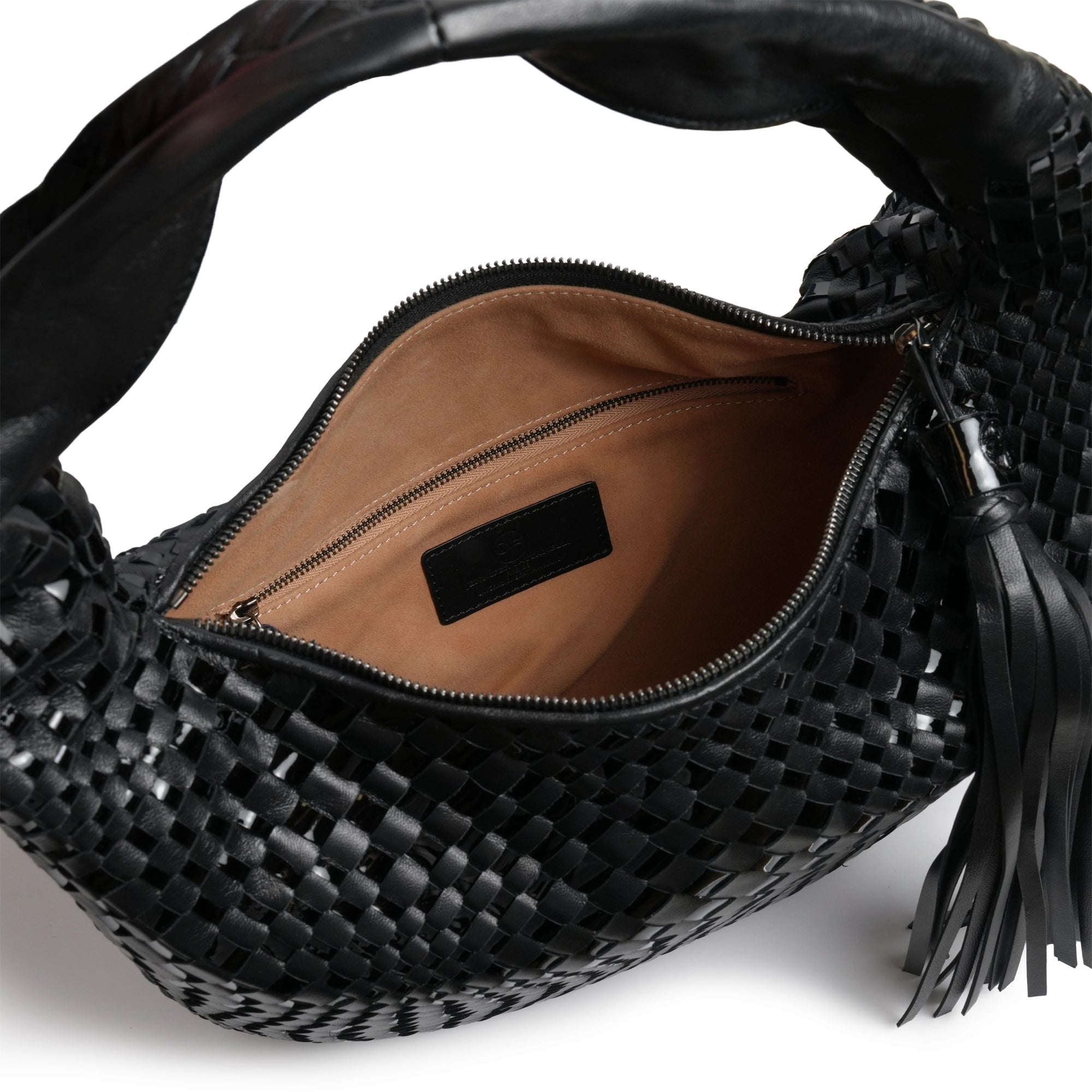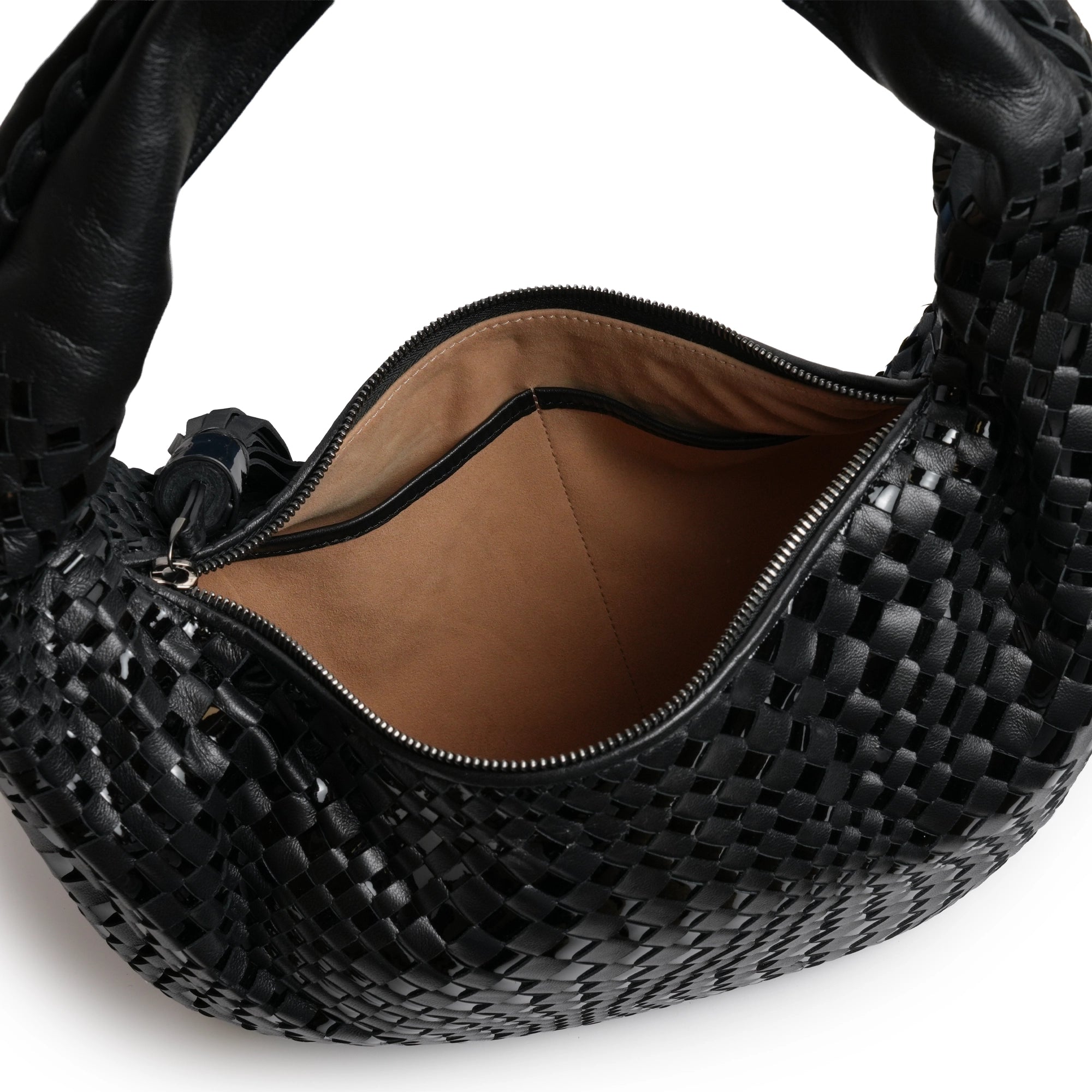 Inspired by the shape of the timeless hobo bags, the "Brigitte Petite" in Nappa and Patent Leather Black features the intrecciato optical techniques, a signature part of our collection in a tiny version!