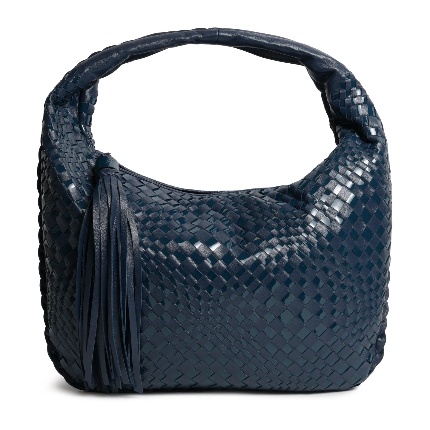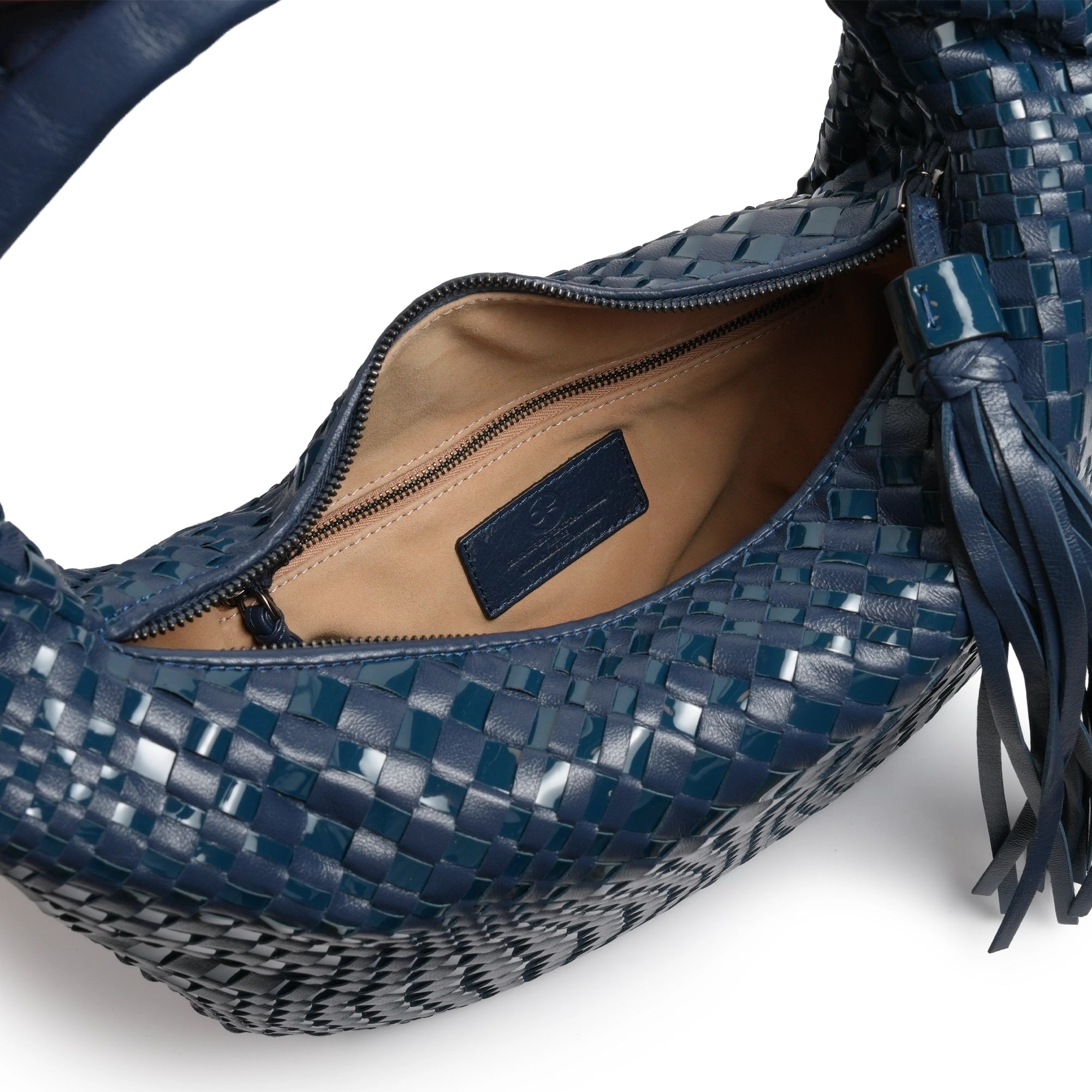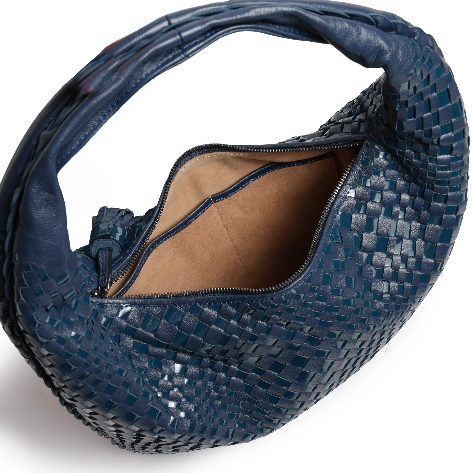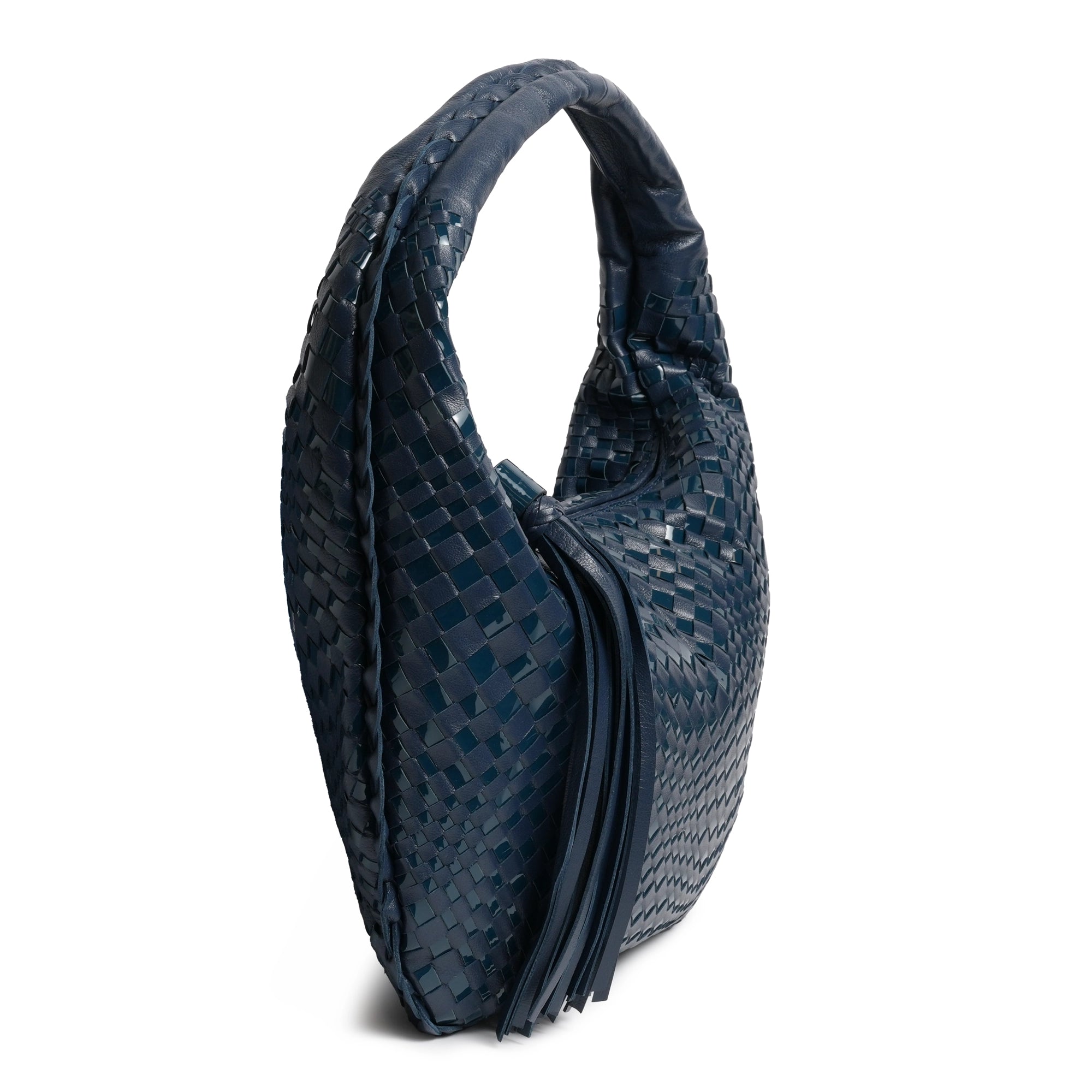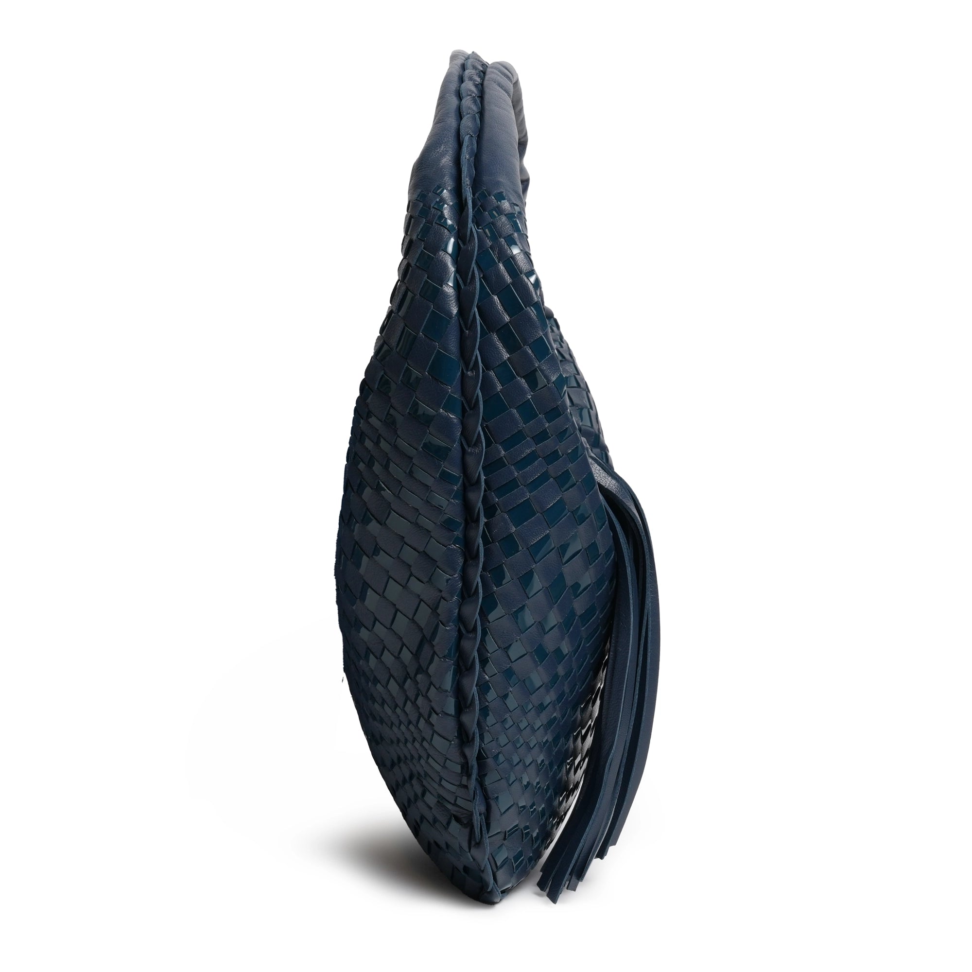 Inspired by the shape of the timeless hobo bags, the "Brigitte Petite" in Nappa and Patent Carta da Zucchero (Deep Blue) features the intrecciato optical techniques, a signature part of our collection in a tiny version!