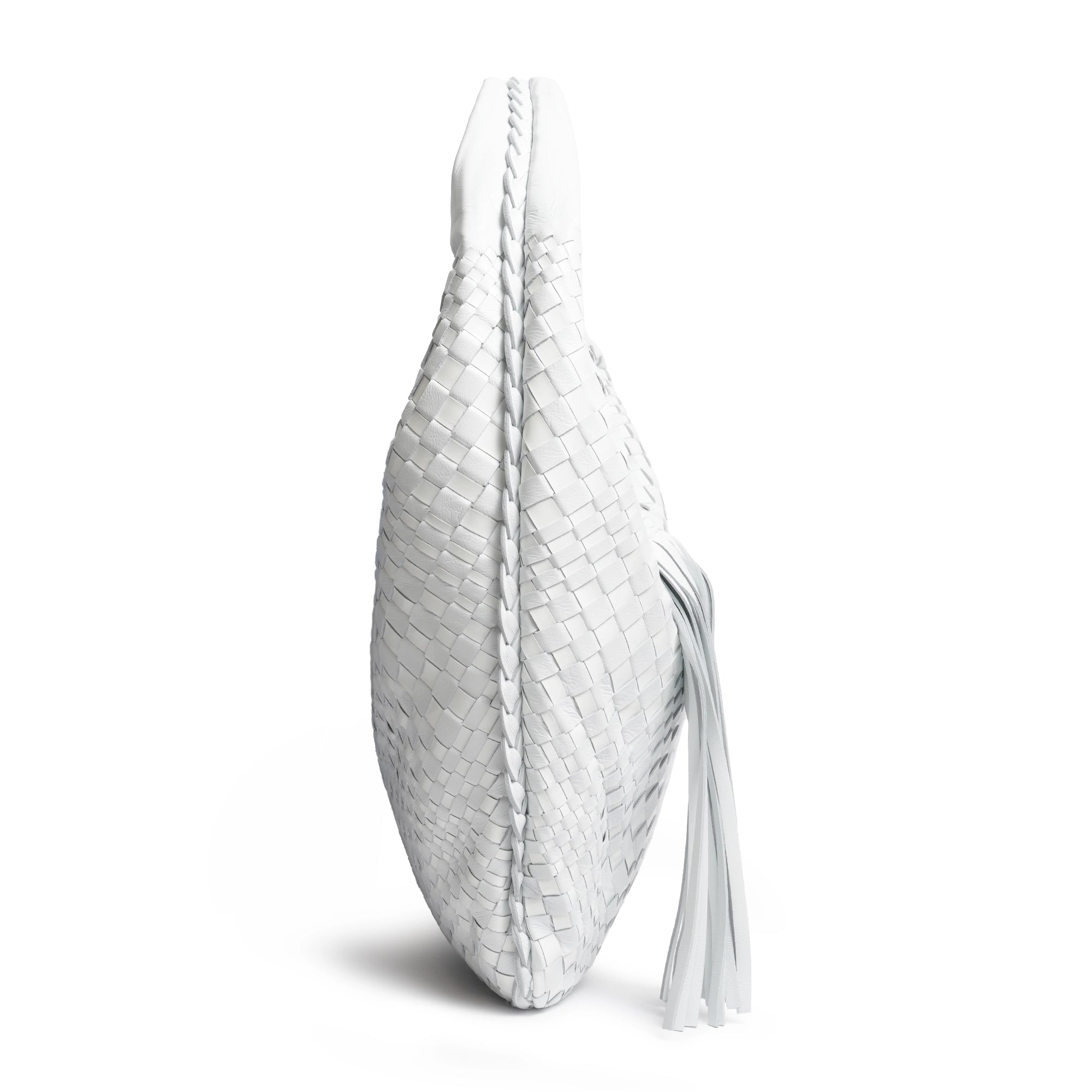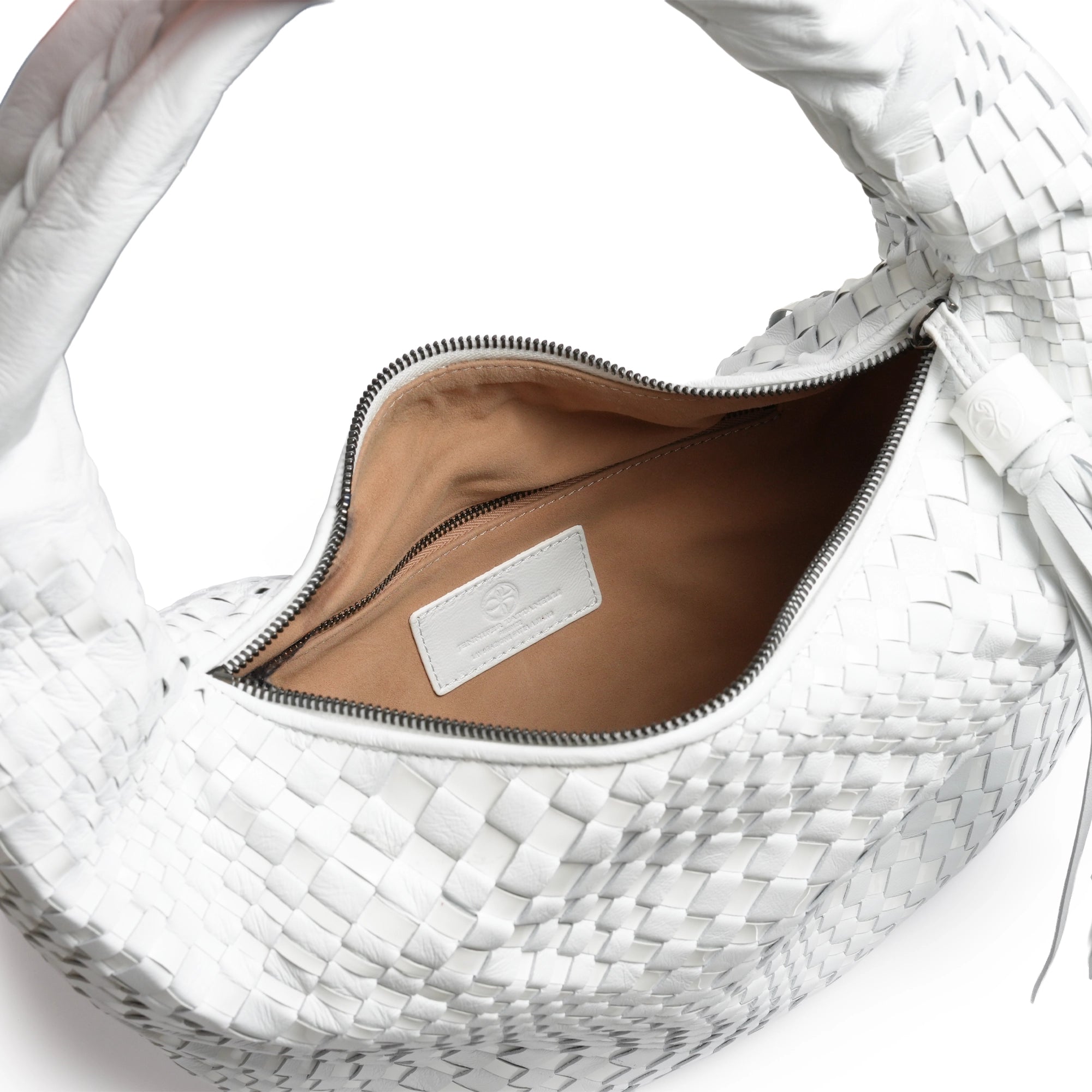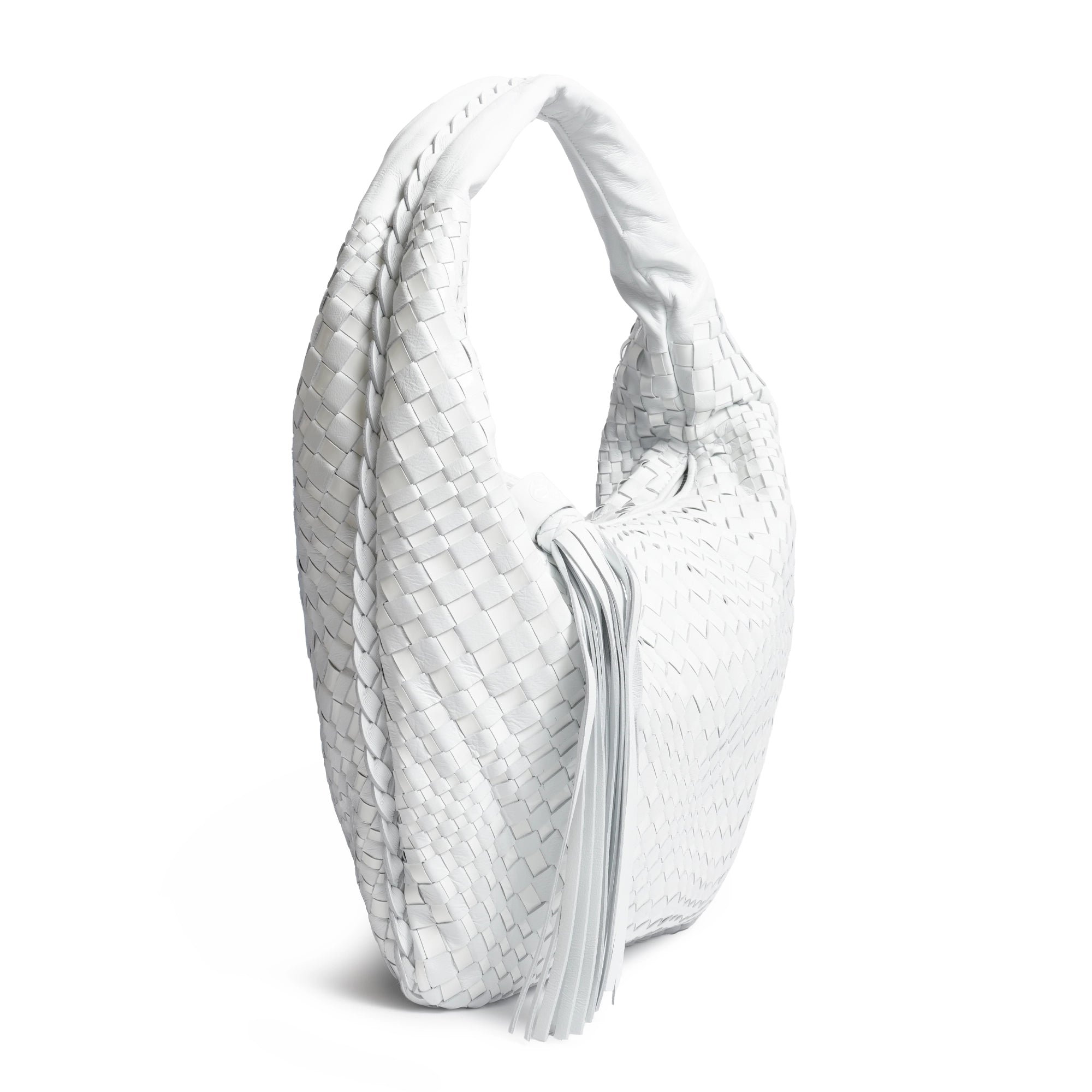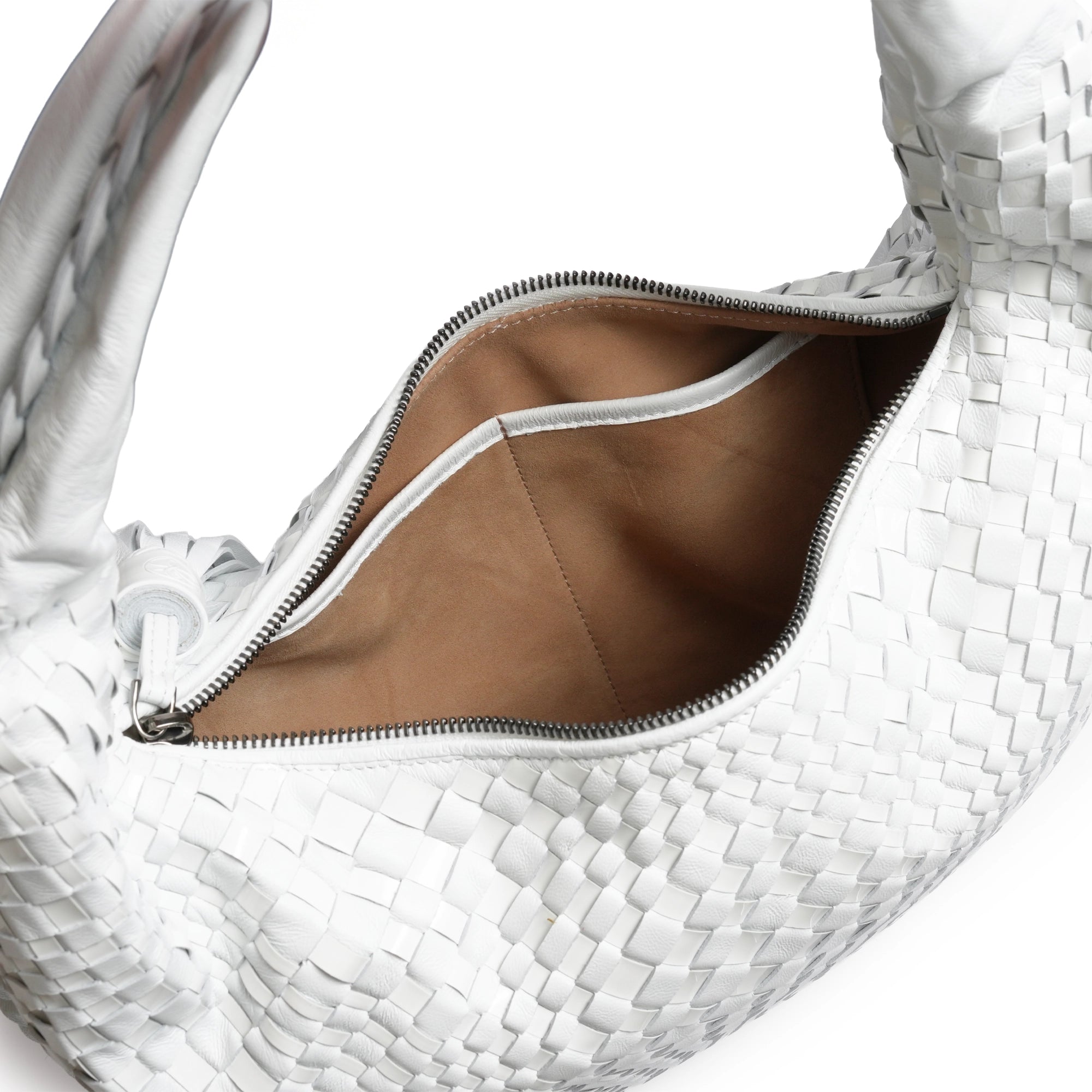 Inspired by the shape of the timeless hobo bags, the "Brigitte Petite" in Nappa and Patent White features the intrecciato optical techniques, a signature part of our collection in a tiny version!