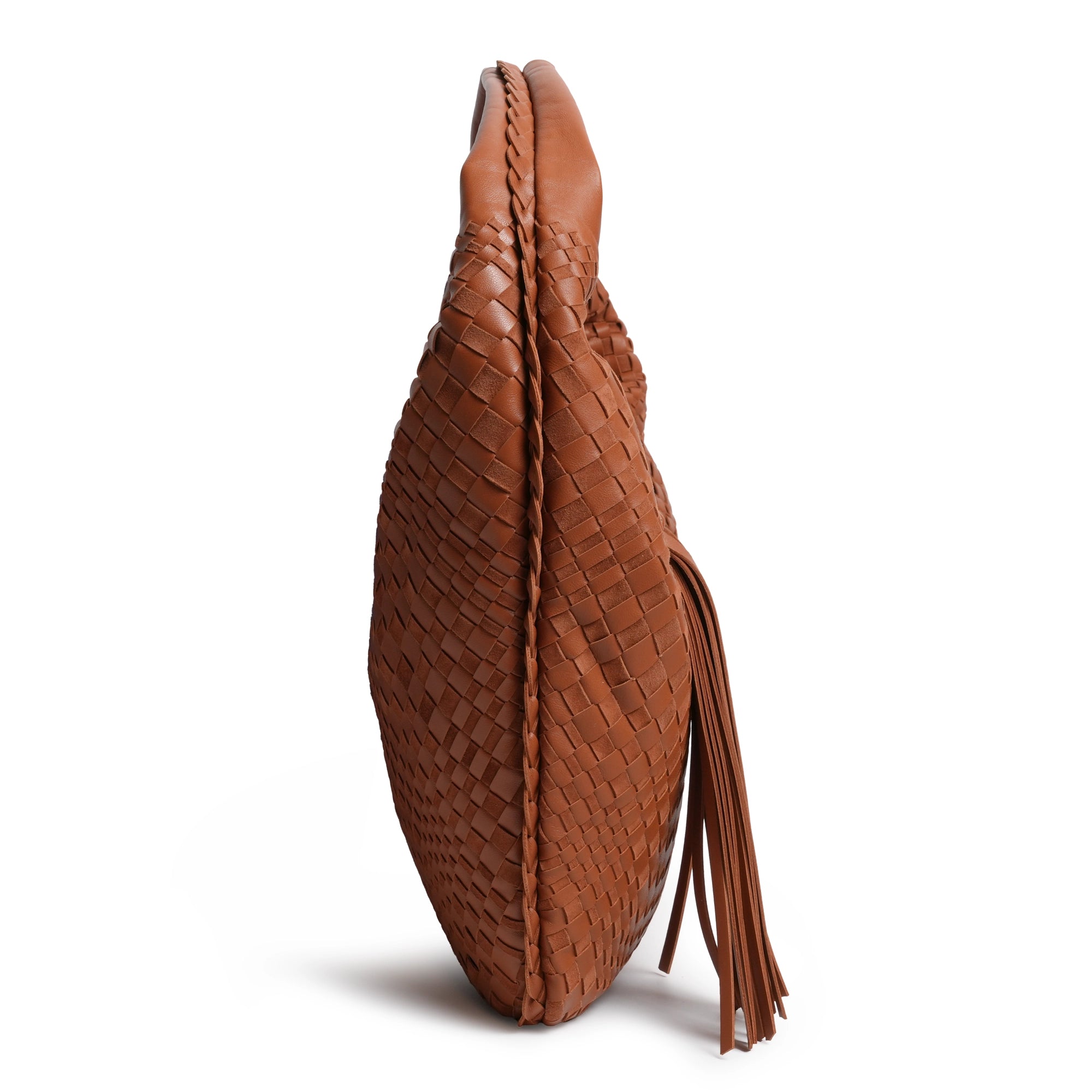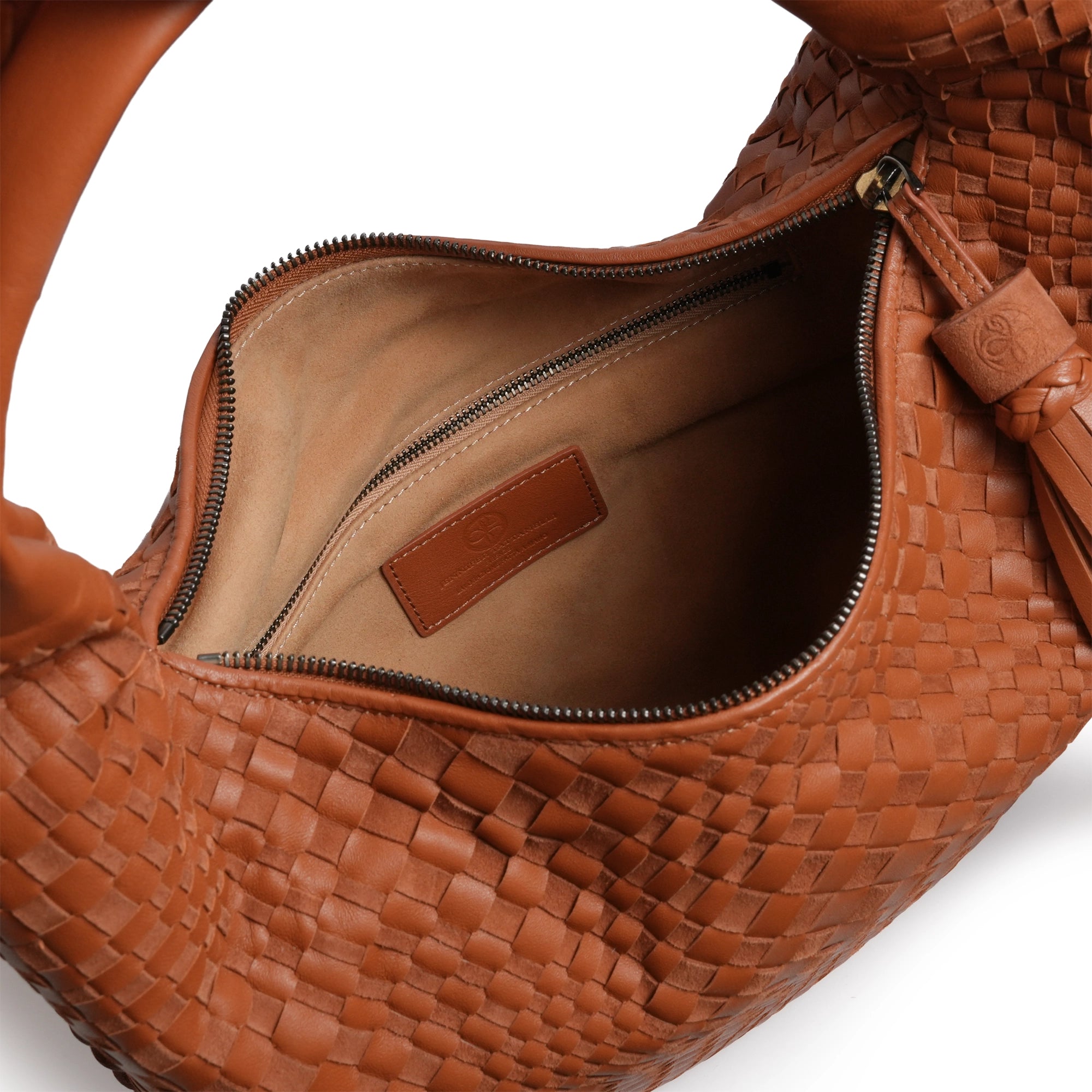 Inspired by the shape of the timeless hobo bags, the "Brigitte Petite" in Nappa and Suede Leather Cuoio (Luggage Color) features the intrecciato optical techniques, a signature part of our collection in a tiny version!