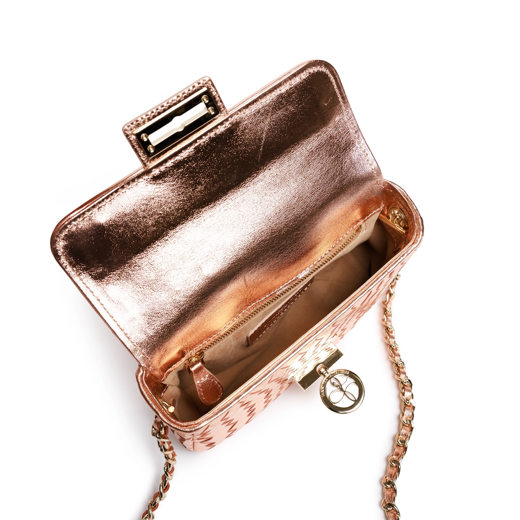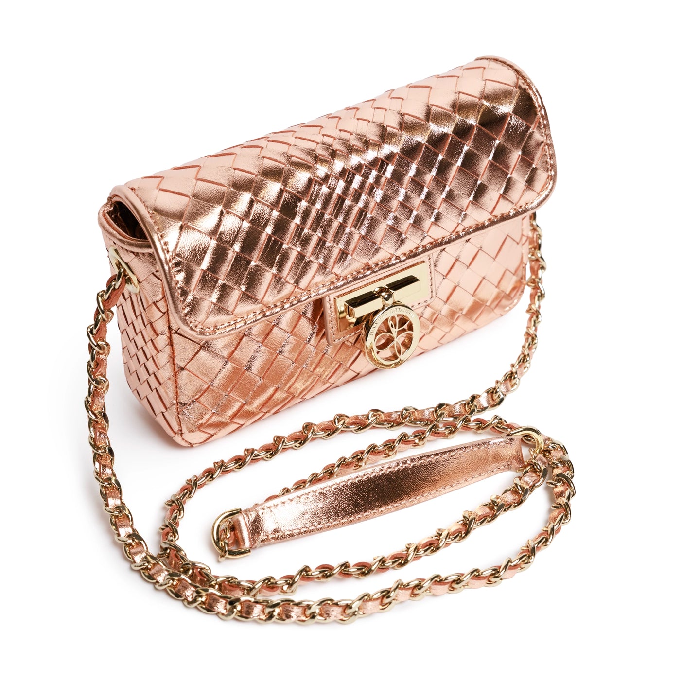 The New Chicca is a stylish mini bag, meticulously handmade in Florence, Italy. This Laminated Rose Gold color is simply elegant and vibrant at the same time.