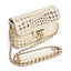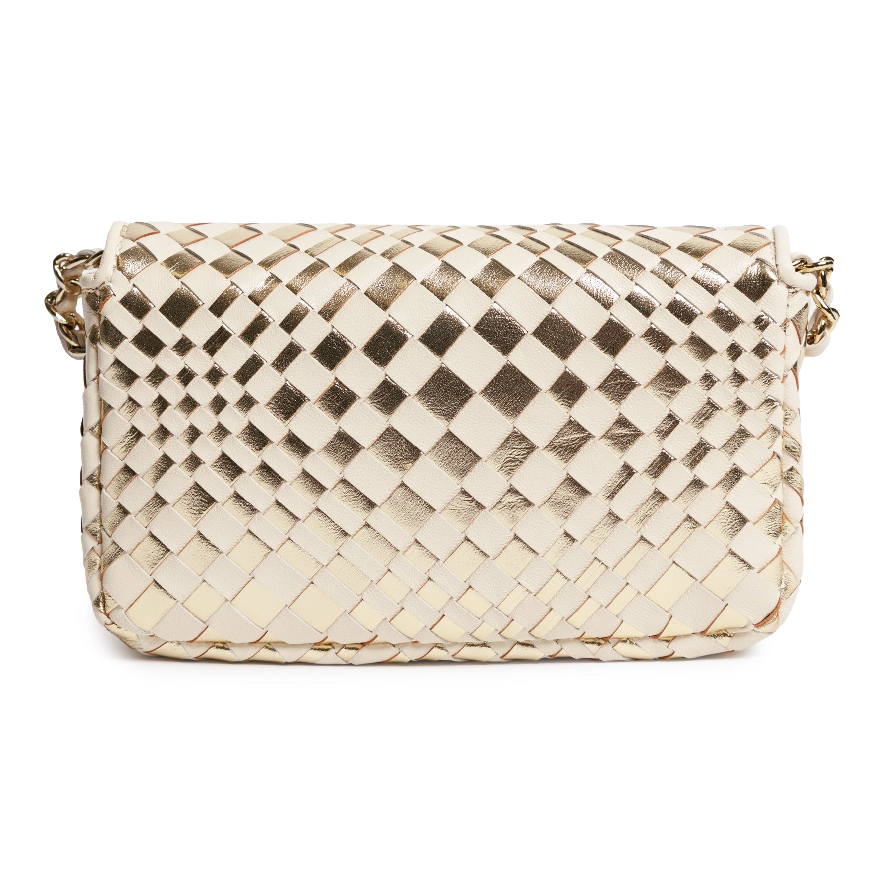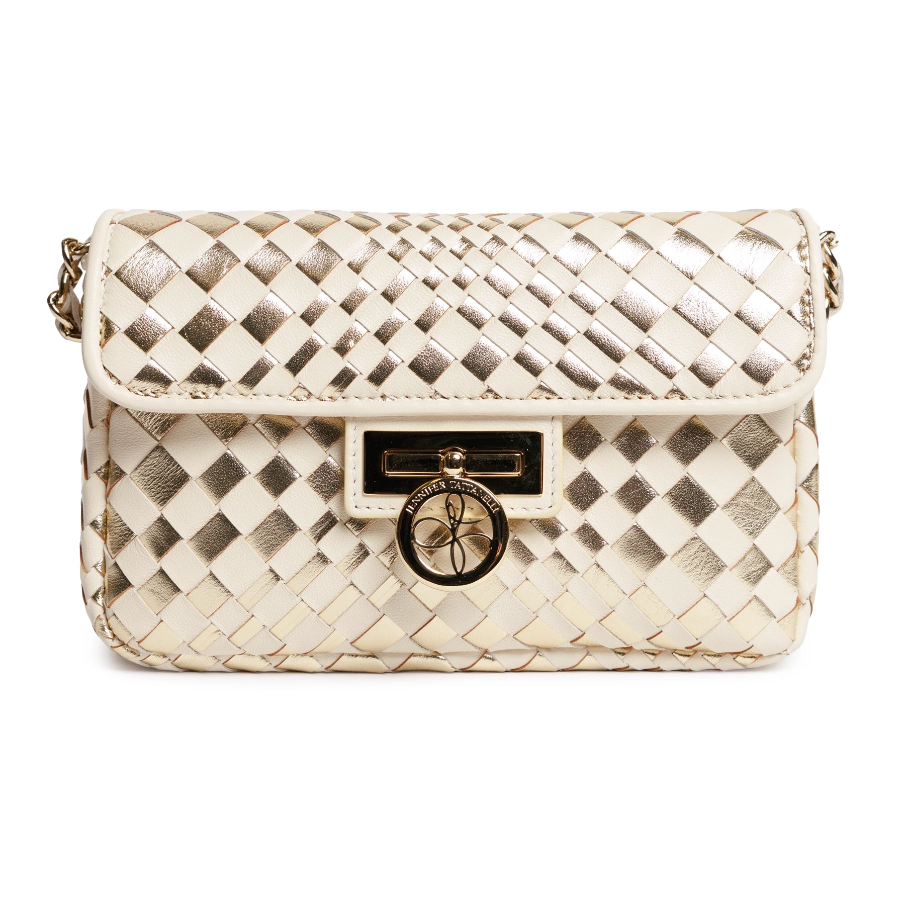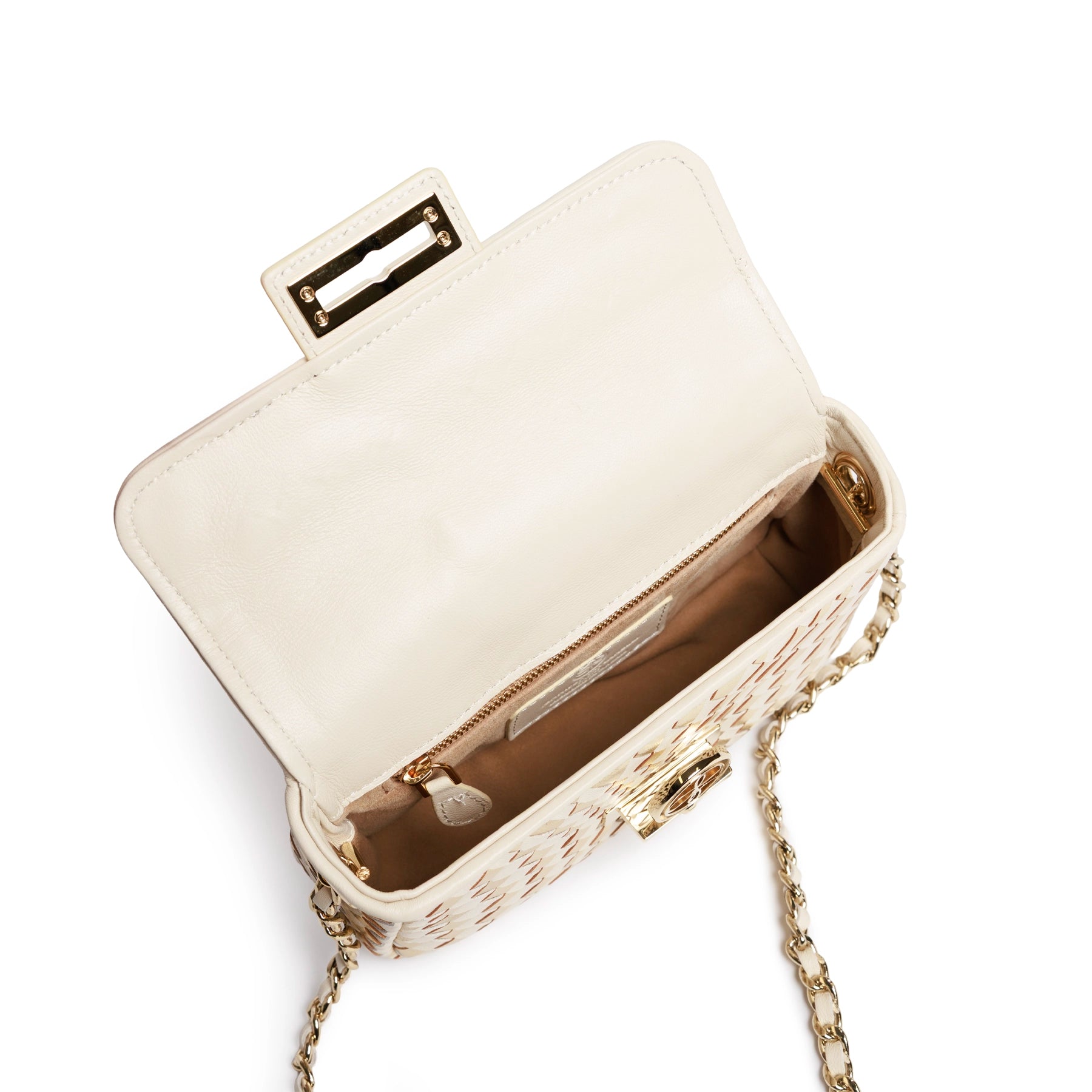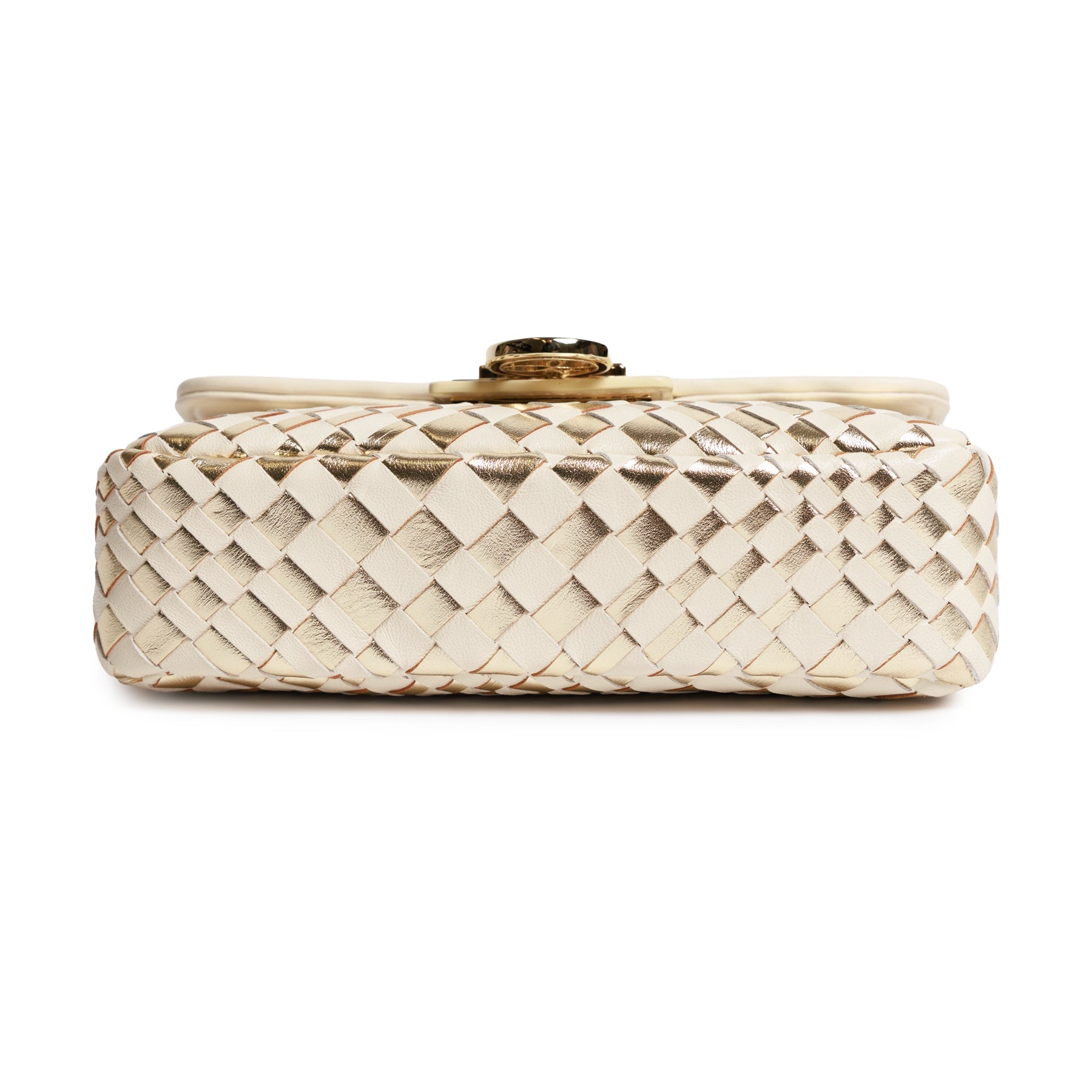 The interplay between warm ivory tones and radiant gold inserts gives the bag a distinctive depth, offering both elegance and a contemporary edge. Its compact, structured silhouette is enhanced by a softly curved flap and a polished closure detail, adding a touch of jewelry-like refinement to the design. The result is a piece that feels both sophisticated and effortlessly wearable.