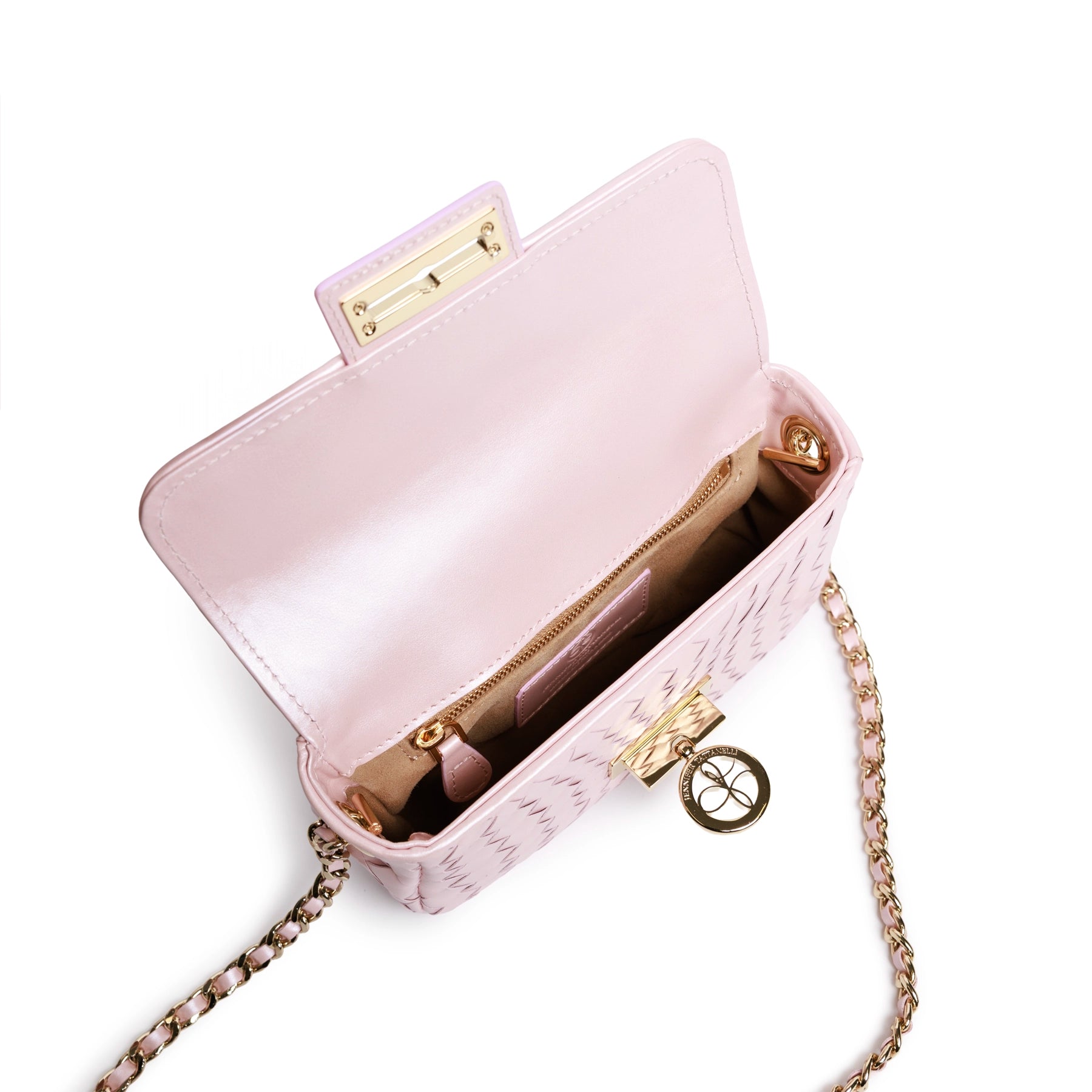 The interior is lined in a soft neutral fabric and includes a secure zip pocket to keep essentials organized. The chain strap, interwoven with matching leather, offers versatility—allowing the bag to be worn crossbody or over the shoulder. Designed to transition effortlessly from day to evening, this piece reflects the brand’s heritage of craftsmanship, also showcased in its boutiques in Palm Beach and the Hamptons.