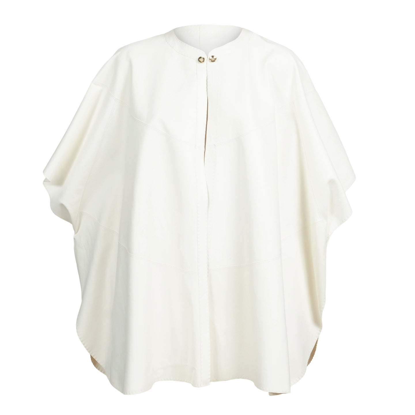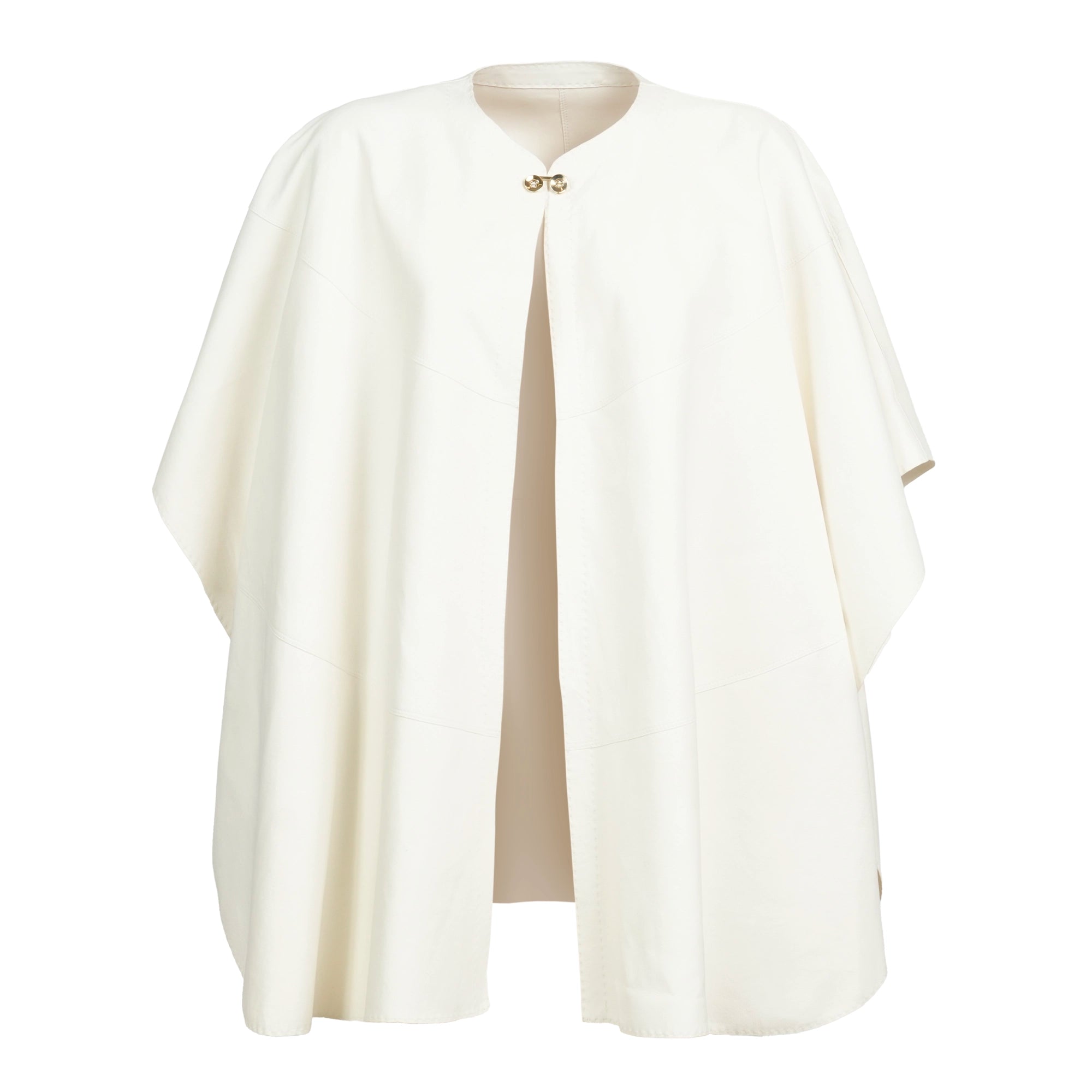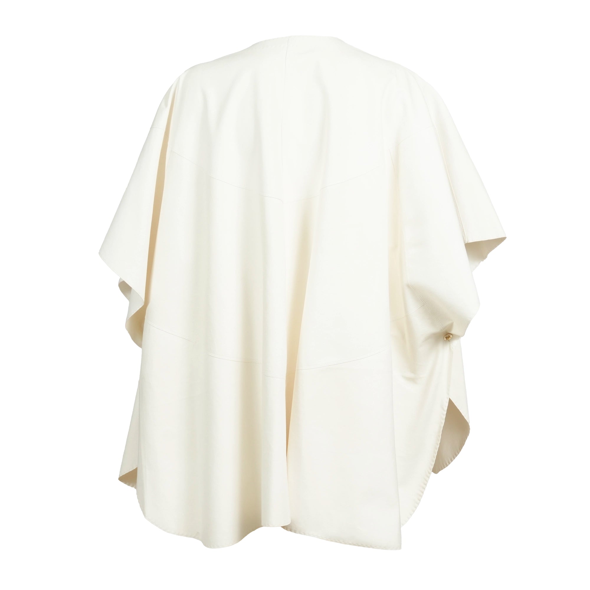 Layer this white leather cape over a silk blouse and tailored trousers for a refined daytime look, or drape it over an evening dress for an elevated statement of quiet luxury. Its light hue and fluid lines evoke a sense of timeless grace, ideal for year-round elegance.