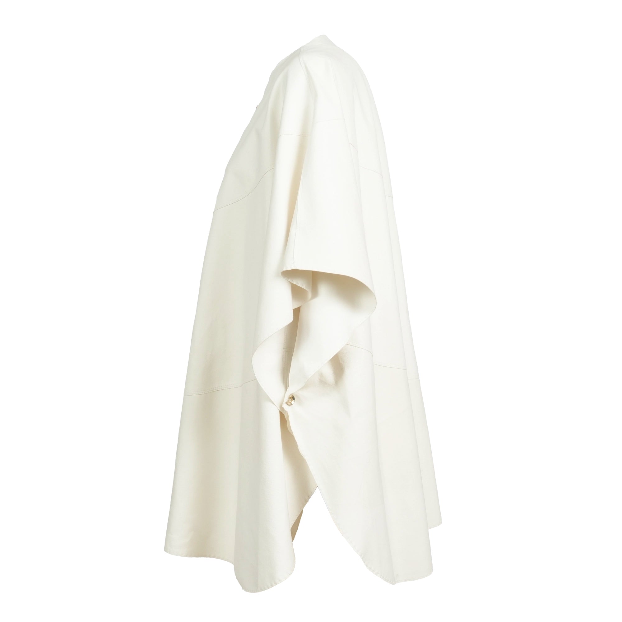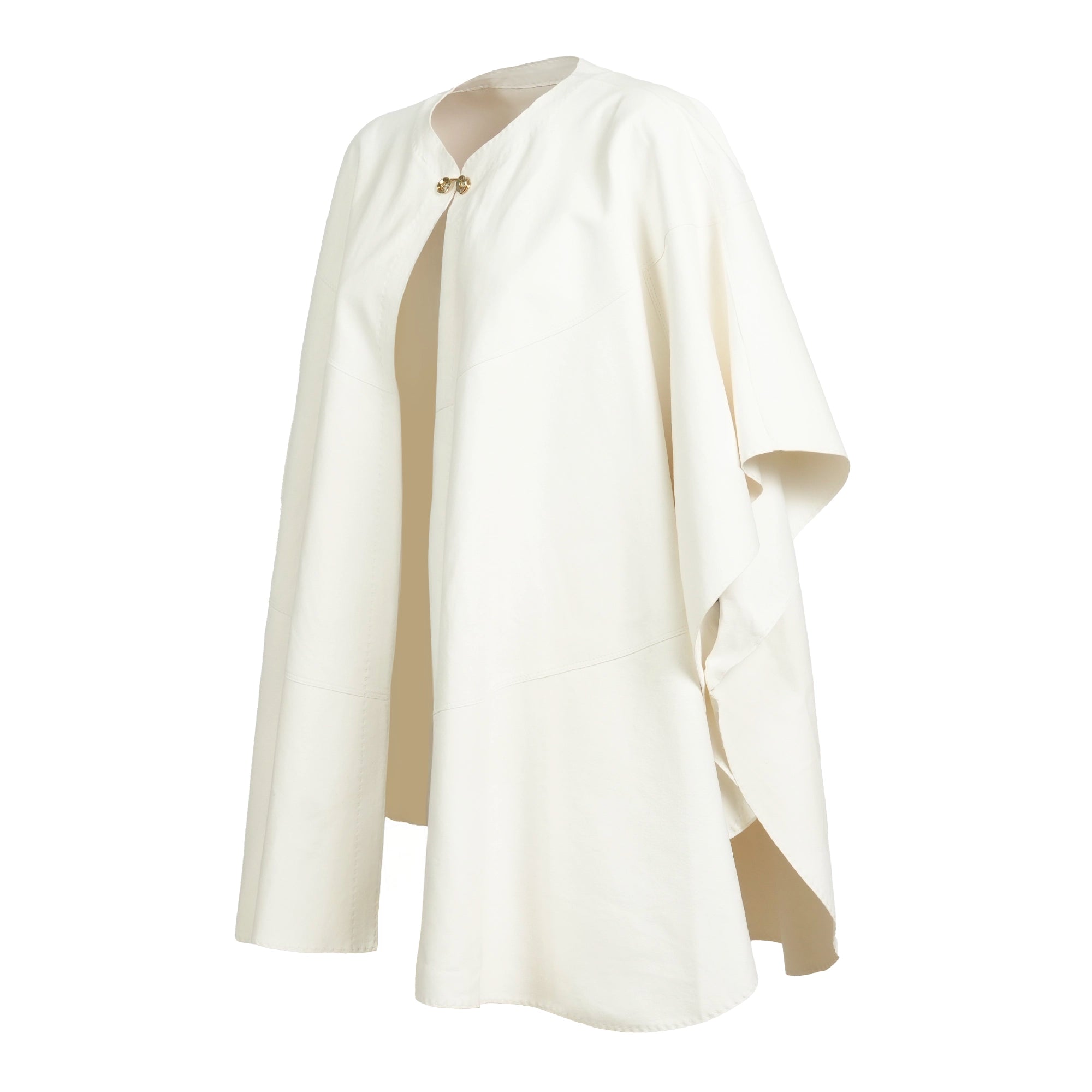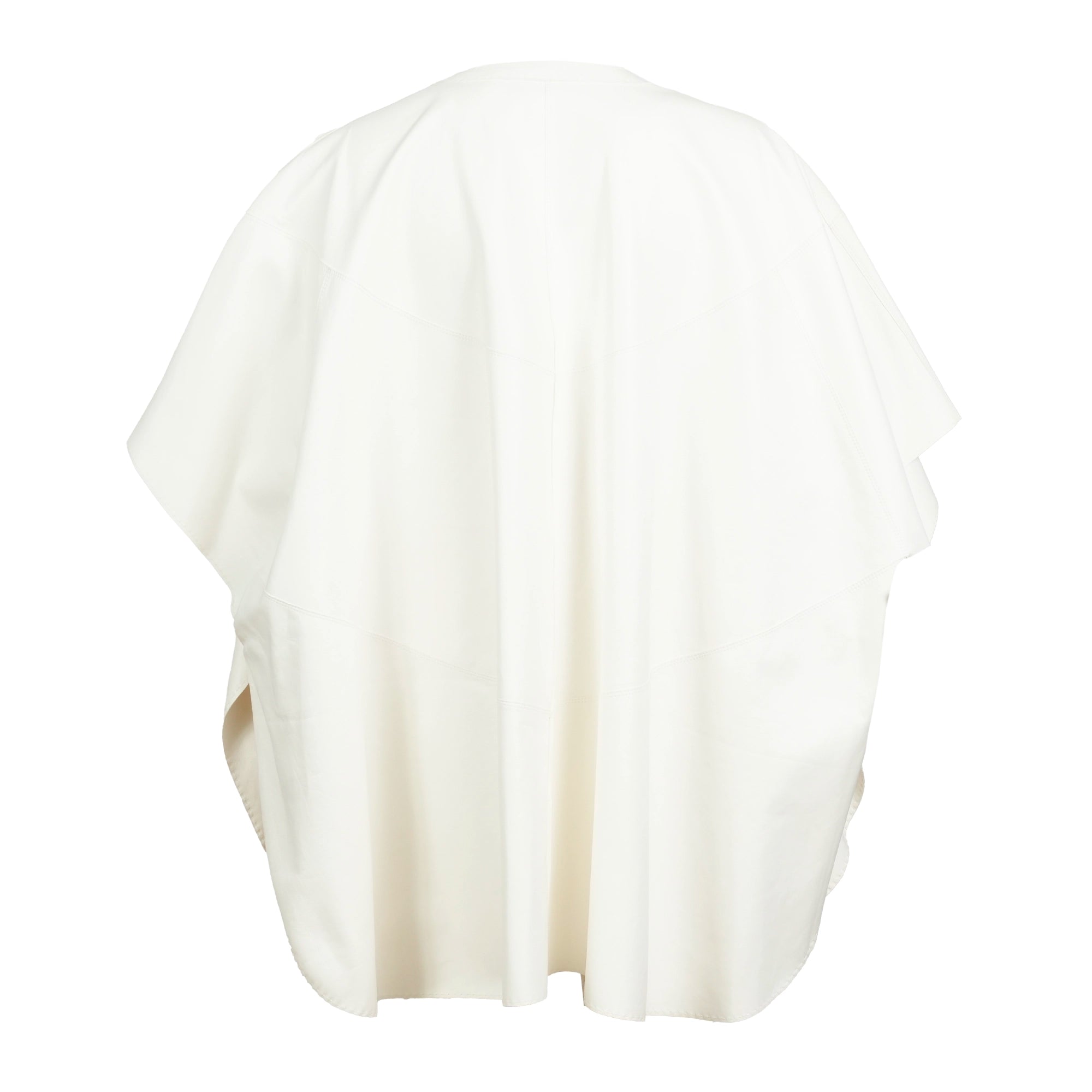 Layer this white leather cape over a silk blouse and tailored trousers for a refined daytime look, or drape it over an evening dress for an elevated statement of quiet luxury. Its light hue and fluid lines evoke a sense of timeless grace, ideal for year-round elegance.