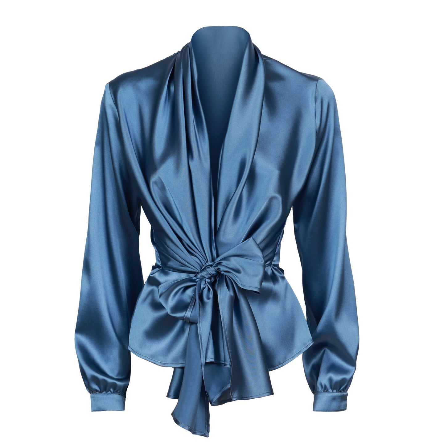 Long Sleeve Silk Blouse with Sash in Denim