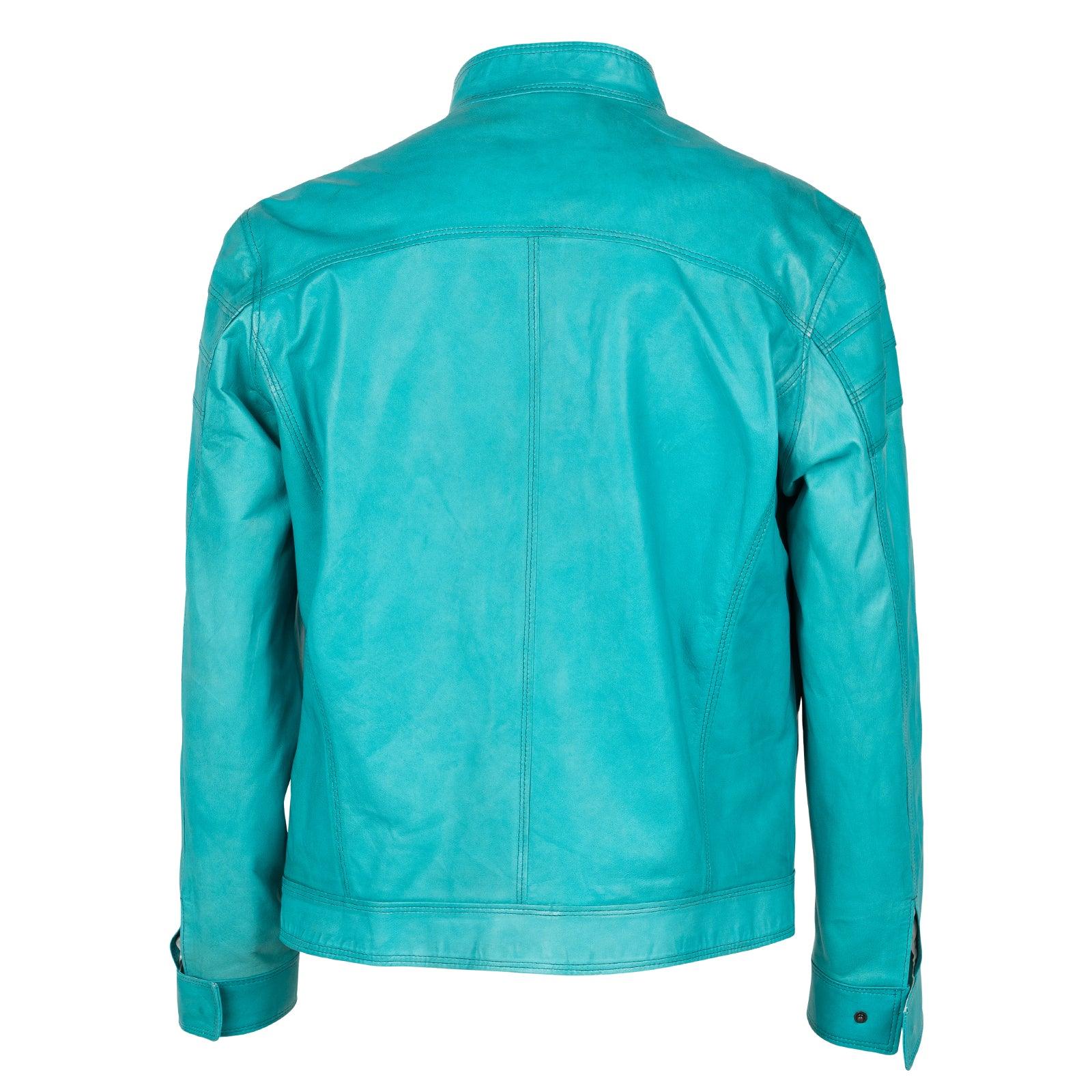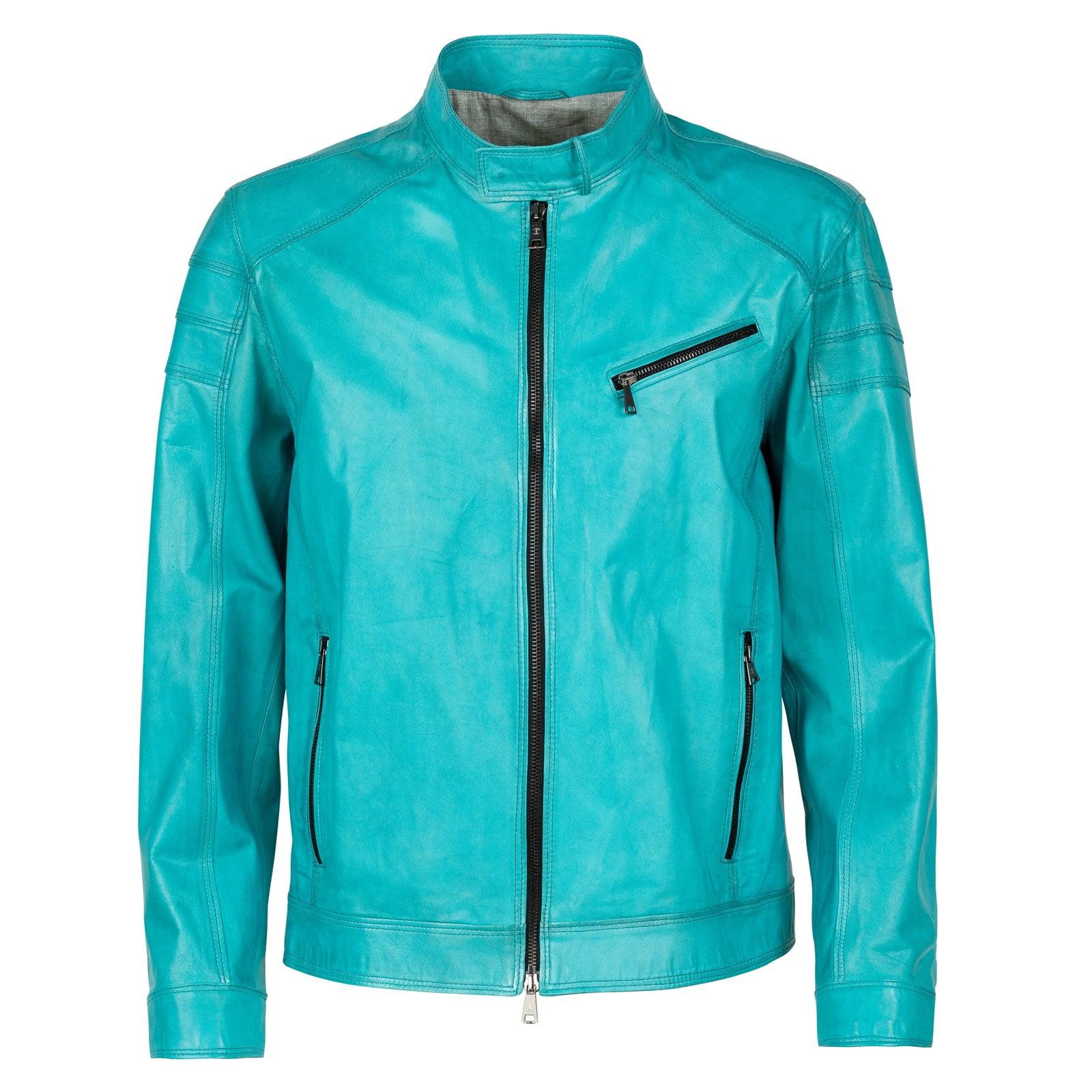 The Men’s Short Biker Jacket is handcrafted in Florence from supple Nappa Leather in a Topazio (Turquoise) tone. Treated through a vegetable tanning process, the leather develops a natural patina over time, emphasizing both sustainability and craftsmanship.