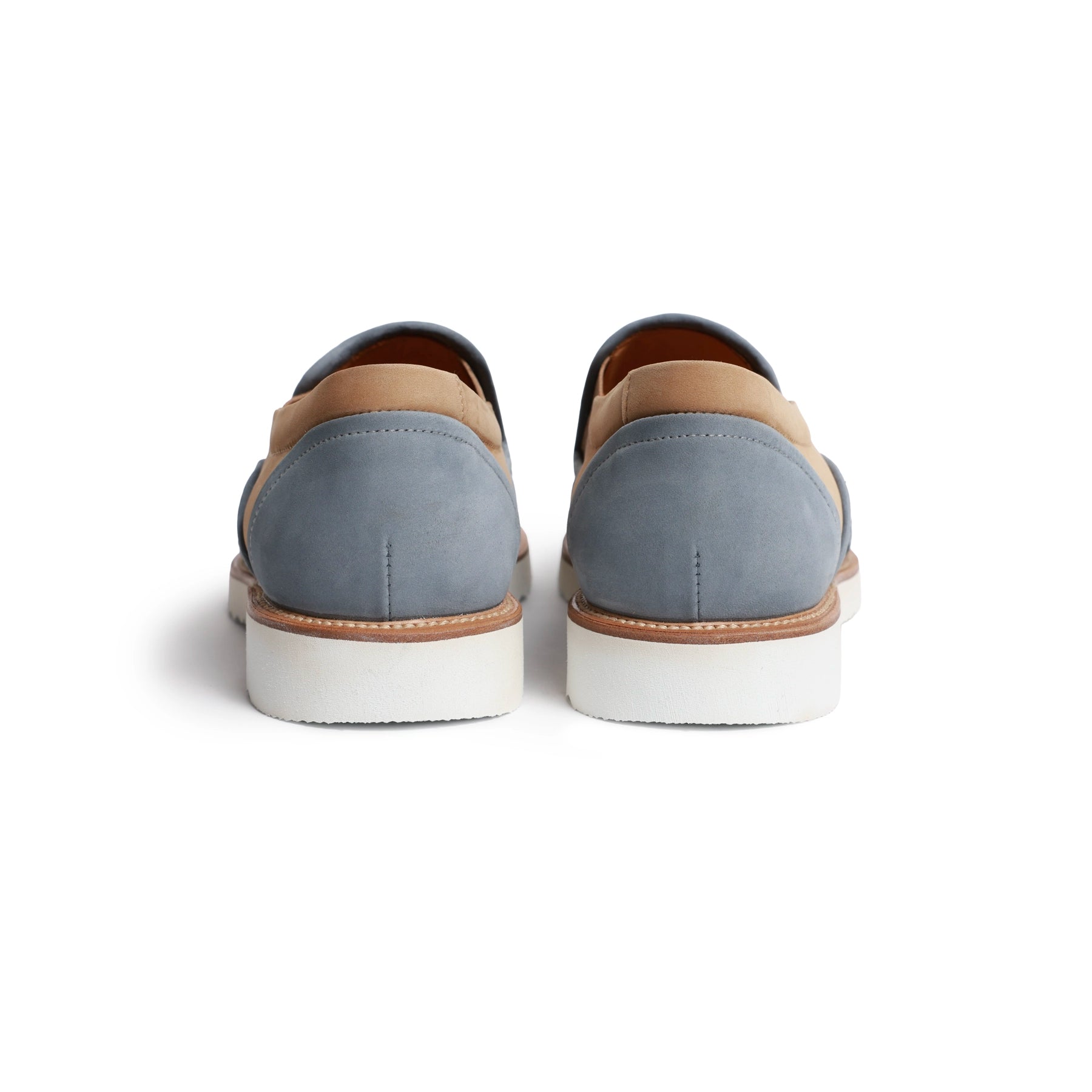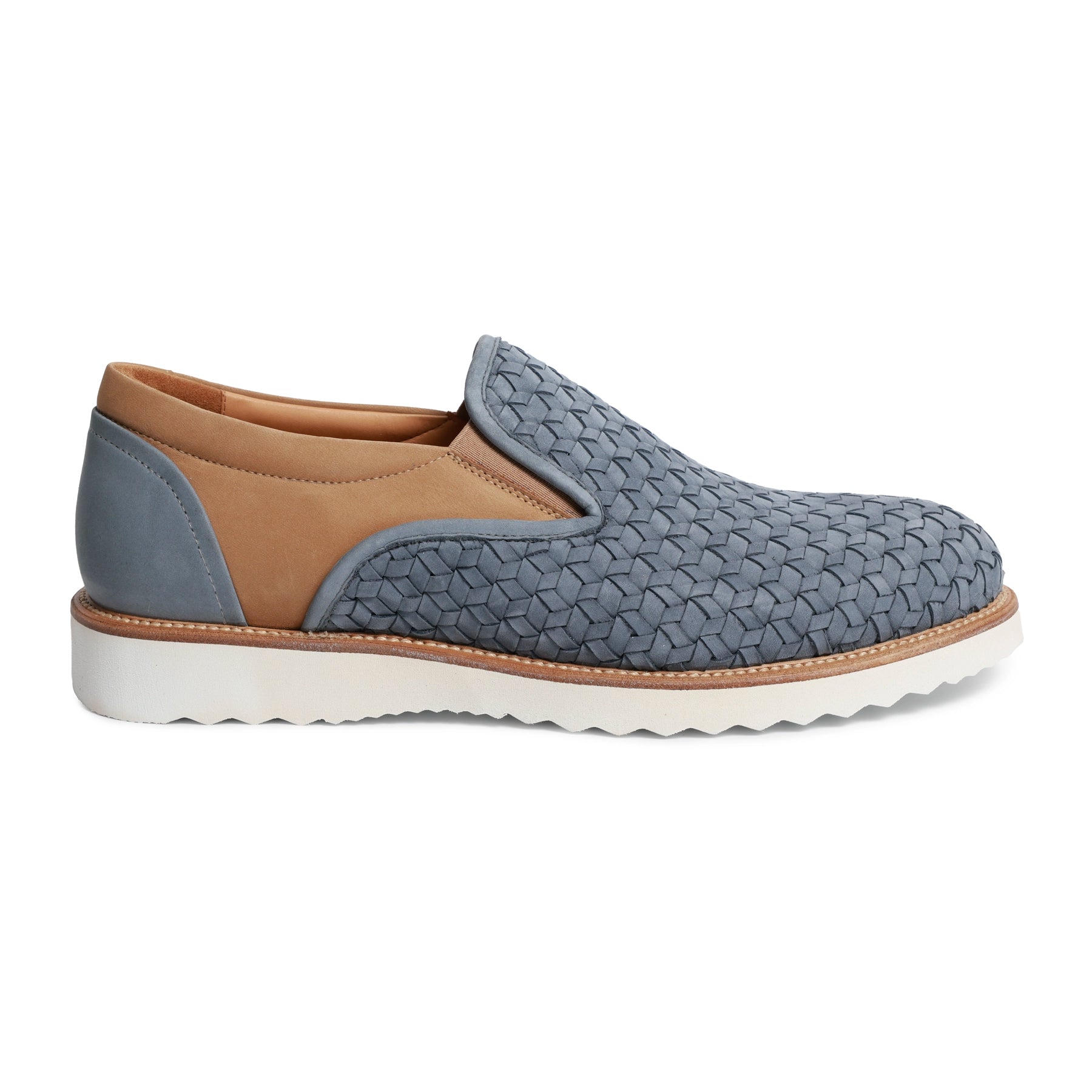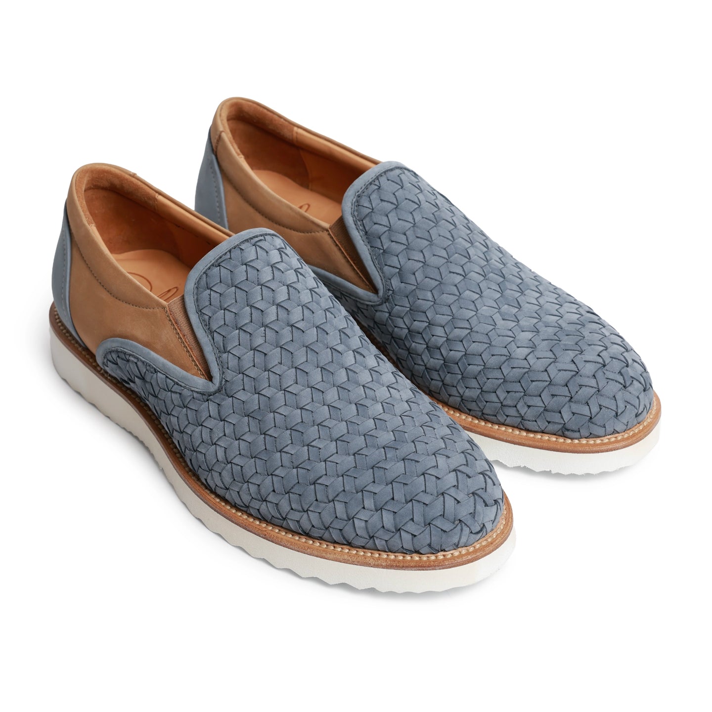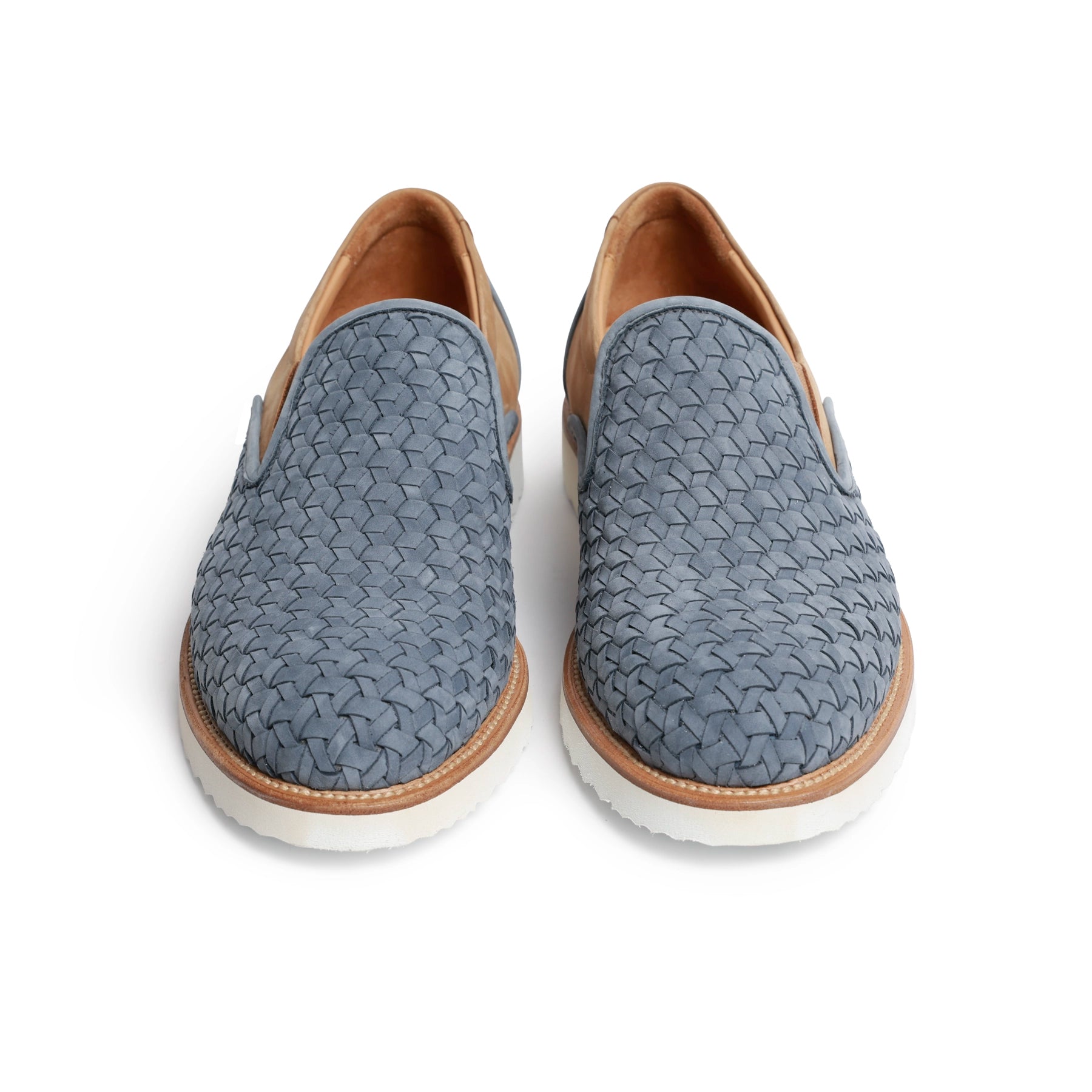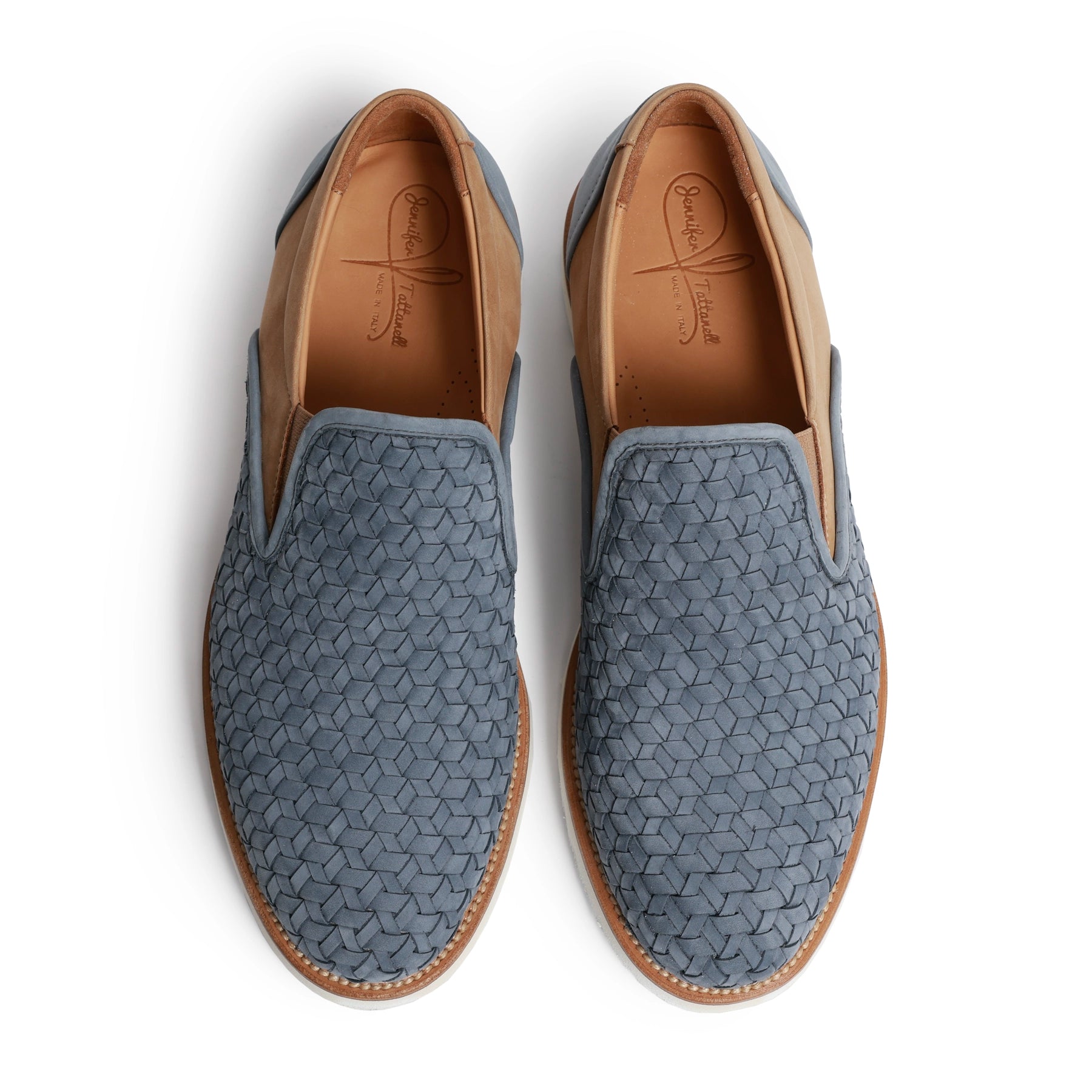 Crafted from soft intrecciato nabuk leather, these slip-on shoes are designed for warm days and relaxed elegance. The handwoven upper showcases subtle texture and depth, while the pearl blue shade brings a fresh, understated tone that feels both modern and timeless. Smooth leather accents at the collar add contrast and structure, enhancing comfort without disrupting the clean silhouette.