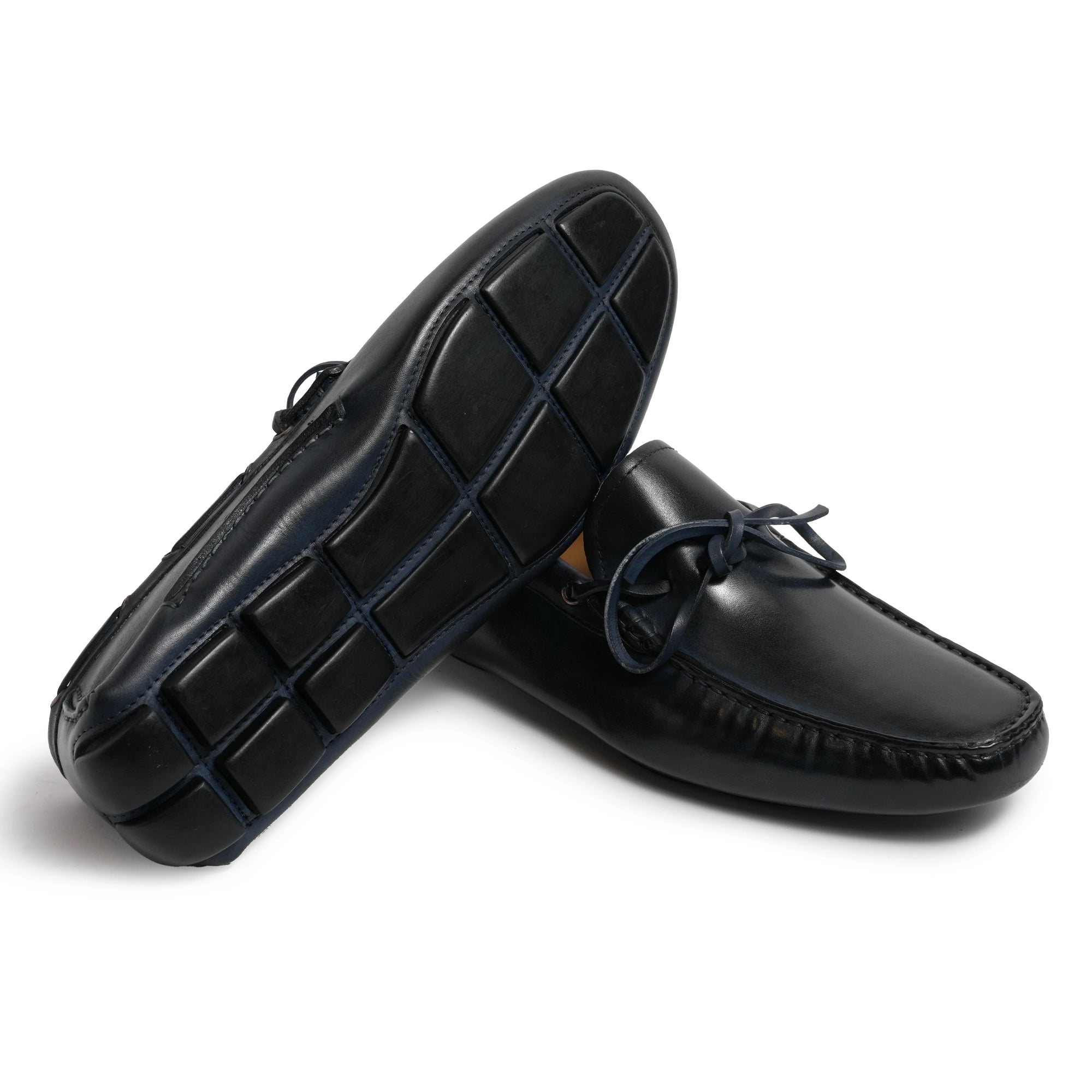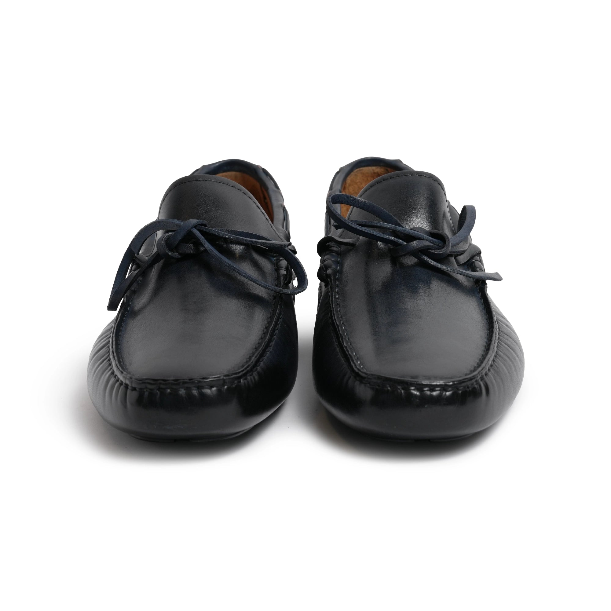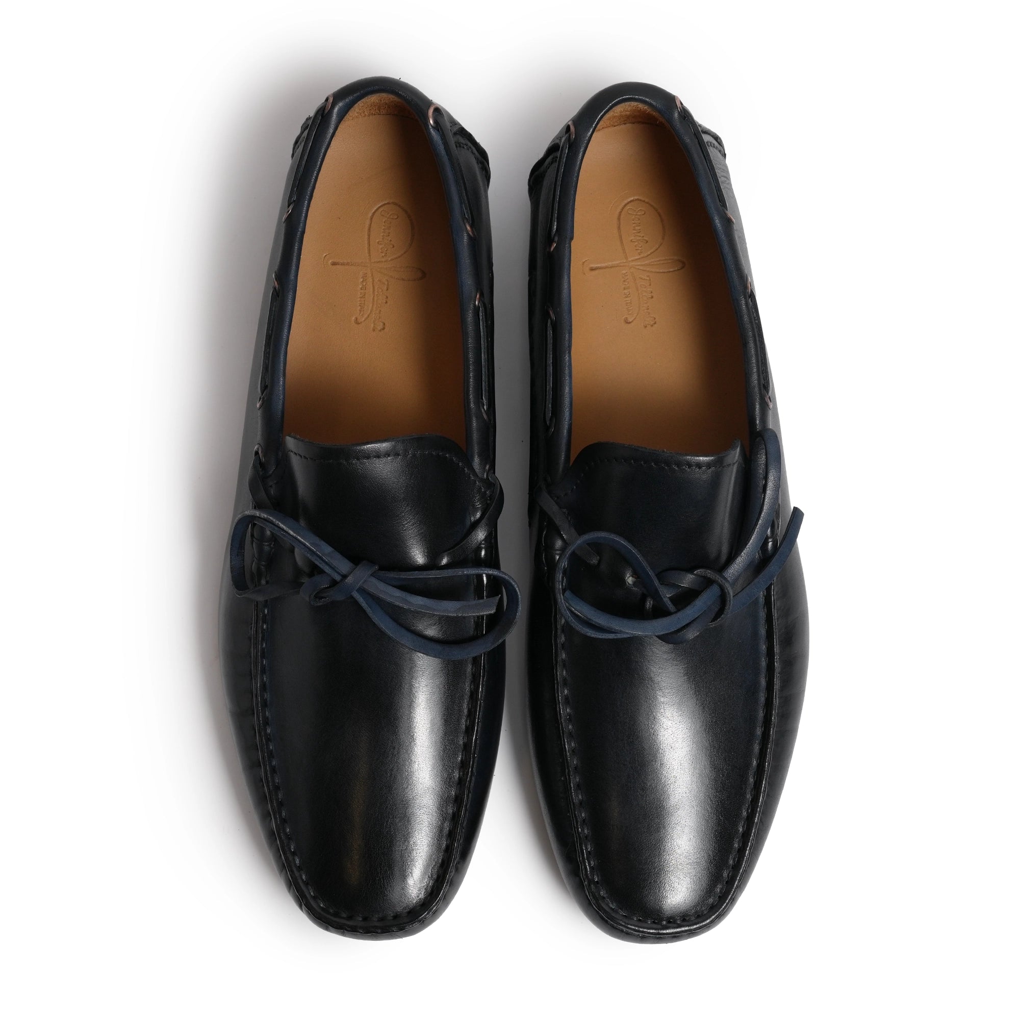 The signature lace-through design enhances flexibility while adding a subtle touch of elegance. A rubber driver sole, divided into hand-cut squares, provides traction and lightness, ideal for both driving and city wear. The Dark Blue tone — sleek, modern, and quietly luxurious — highlights the natural sheen of the leather, making this design equally at home with tailored trousers or casual ensembles.