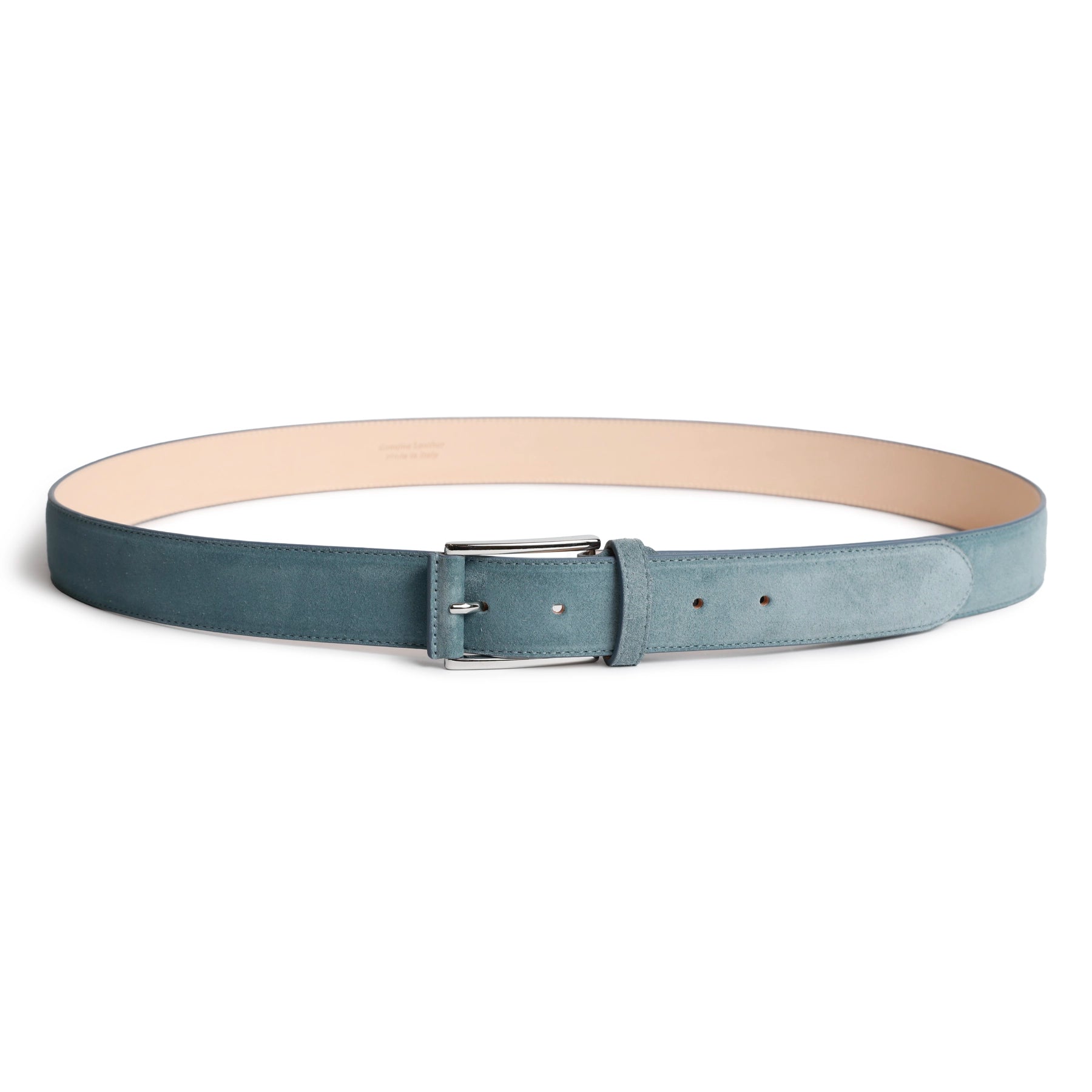 The Men’s Rovesciato Leather Belt in Jeans is crafted from supple reversed leather, showcasing a soft, matte texture that feels relaxed yet intentional. The rovesciato finish gives the belt a subtle depth and a lived-in character, while the muted denim-blue shade adds a contemporary twist to a timeless accessory. Finished with clean stitching, smooth edges, and a polished metal buckle, it balances craftsmanship with everyday versatility.