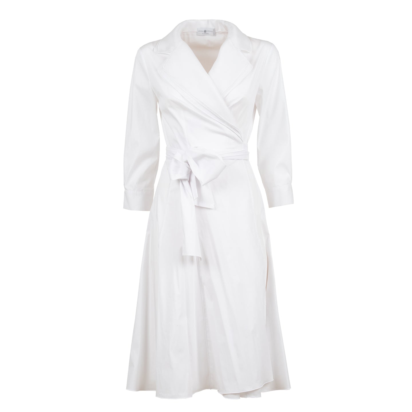 Wrap yourself up comfortably and stylishly in the Women's Roosevelt Dress - a stretch cotton garment handmade in Italy with expert techniques. The collar features double material, leading down to a belted waist and 3/4 length sleeves.