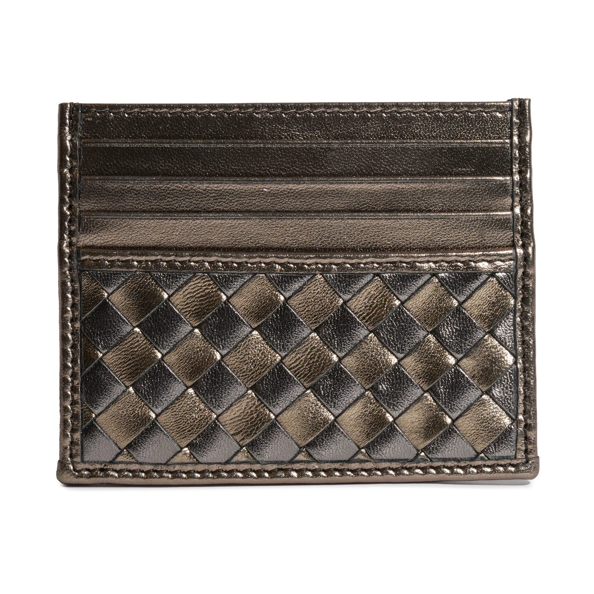 Sophisticated and streamlined, this slim credit card holder is expertly crafted in supple Bronze and Gunmetal Nappa Leather, enriched by the signature Intrecciato weave and finished in a striking hue. The iconic woven texture is not just a symbol of timeless Italian craftsmanship—it also enhances the leather’s durability and flexibility, giving the piece a tactile richness and visual depth that stands out in subtle luxury.