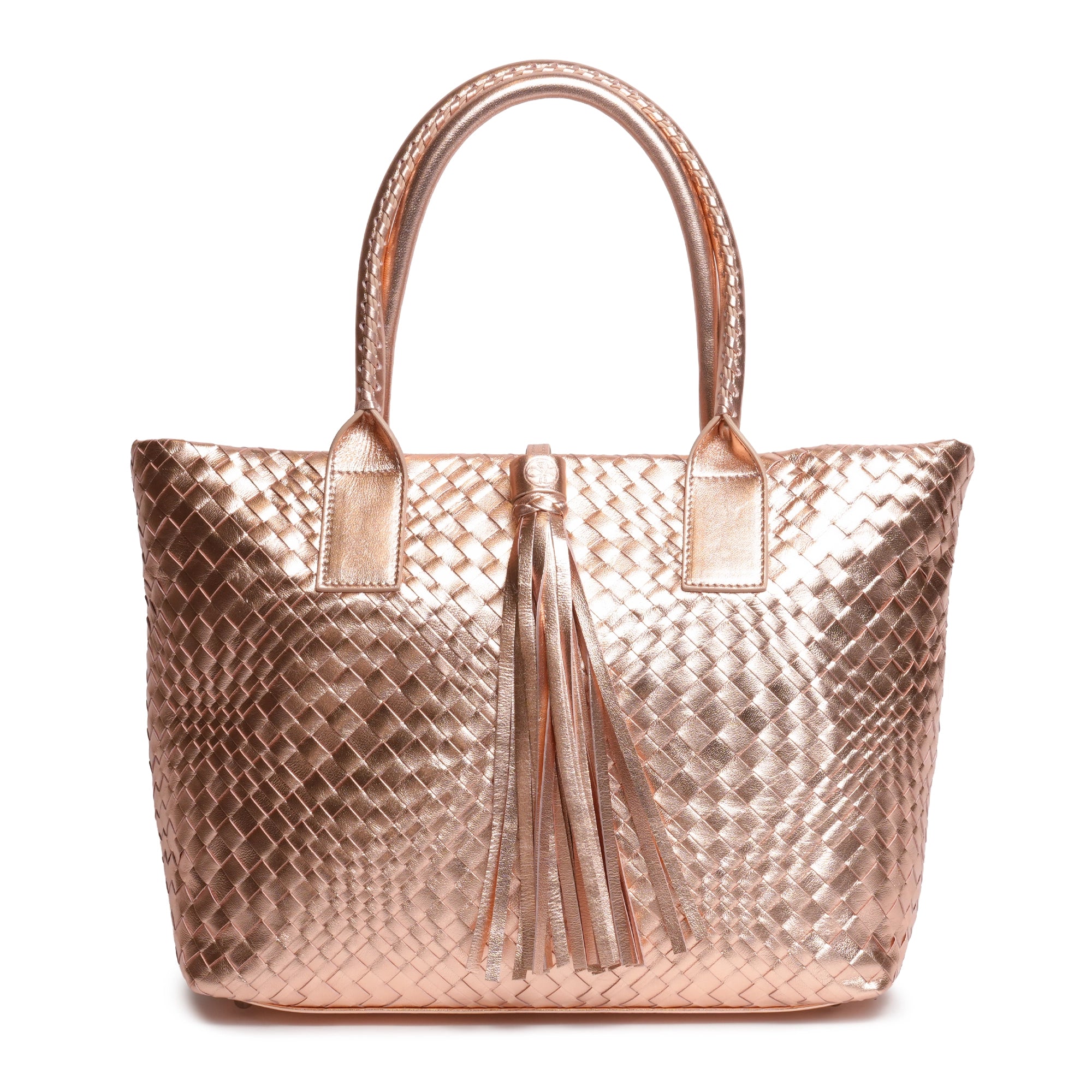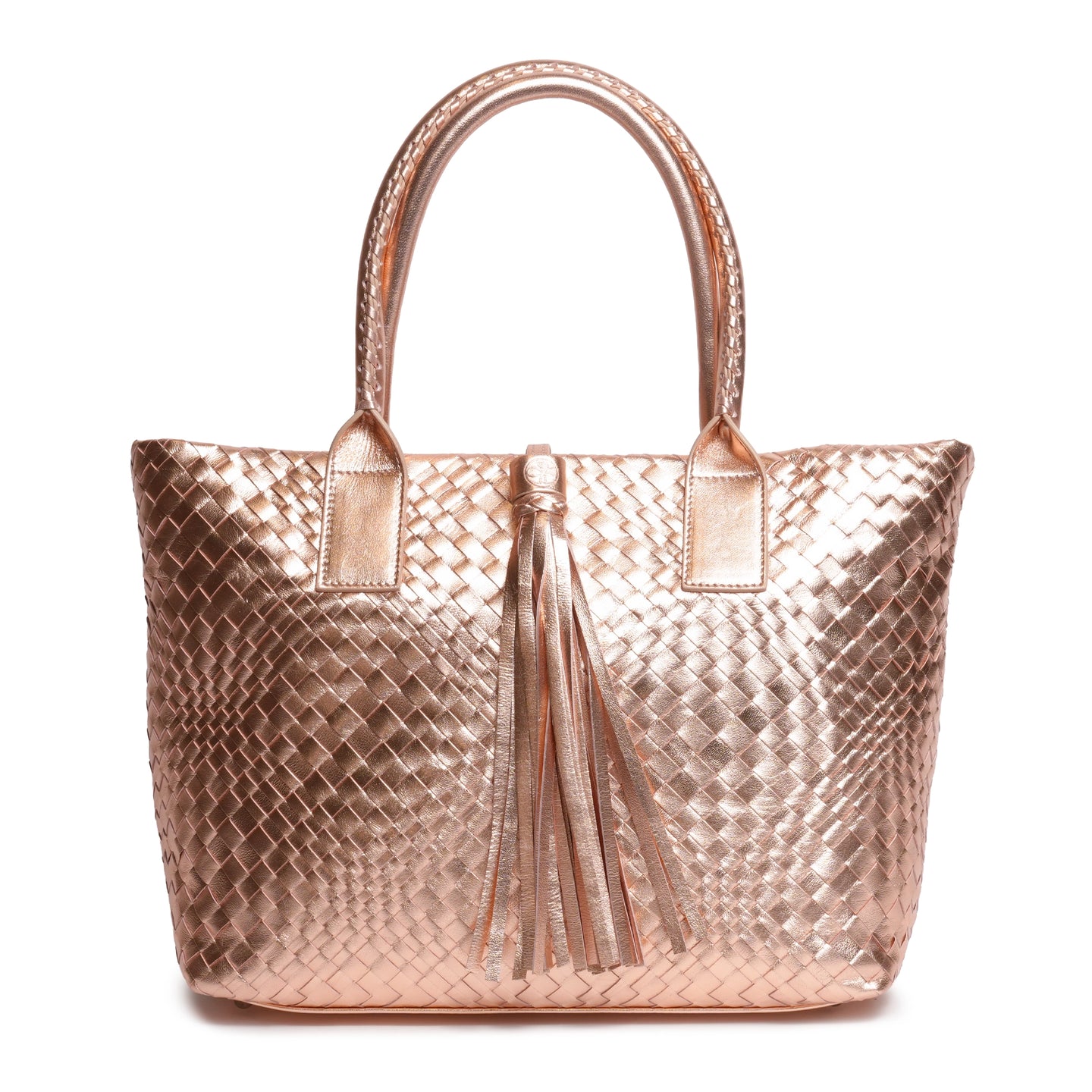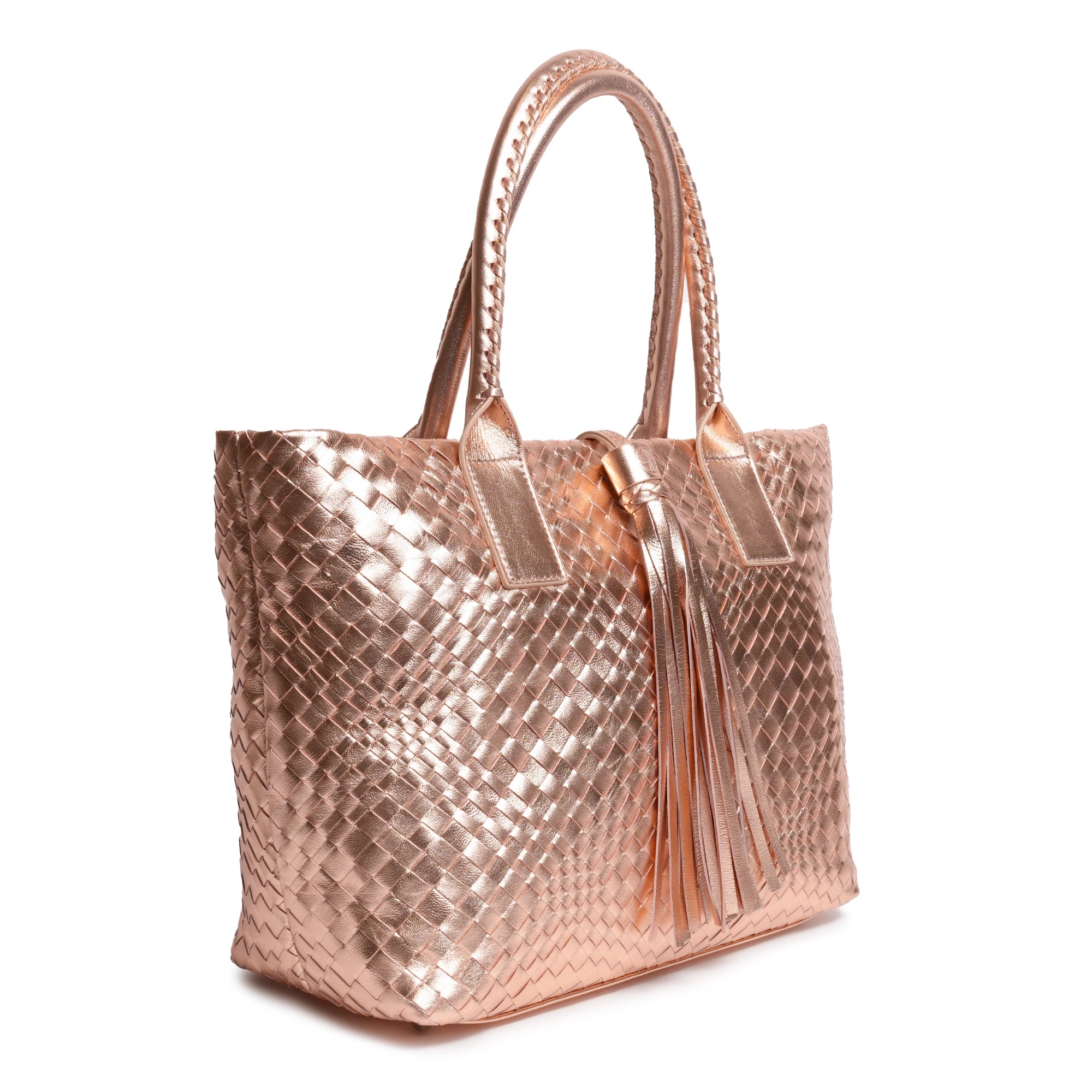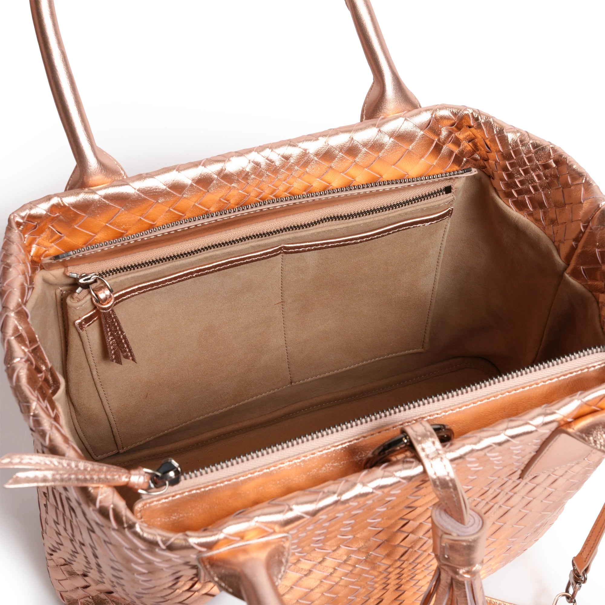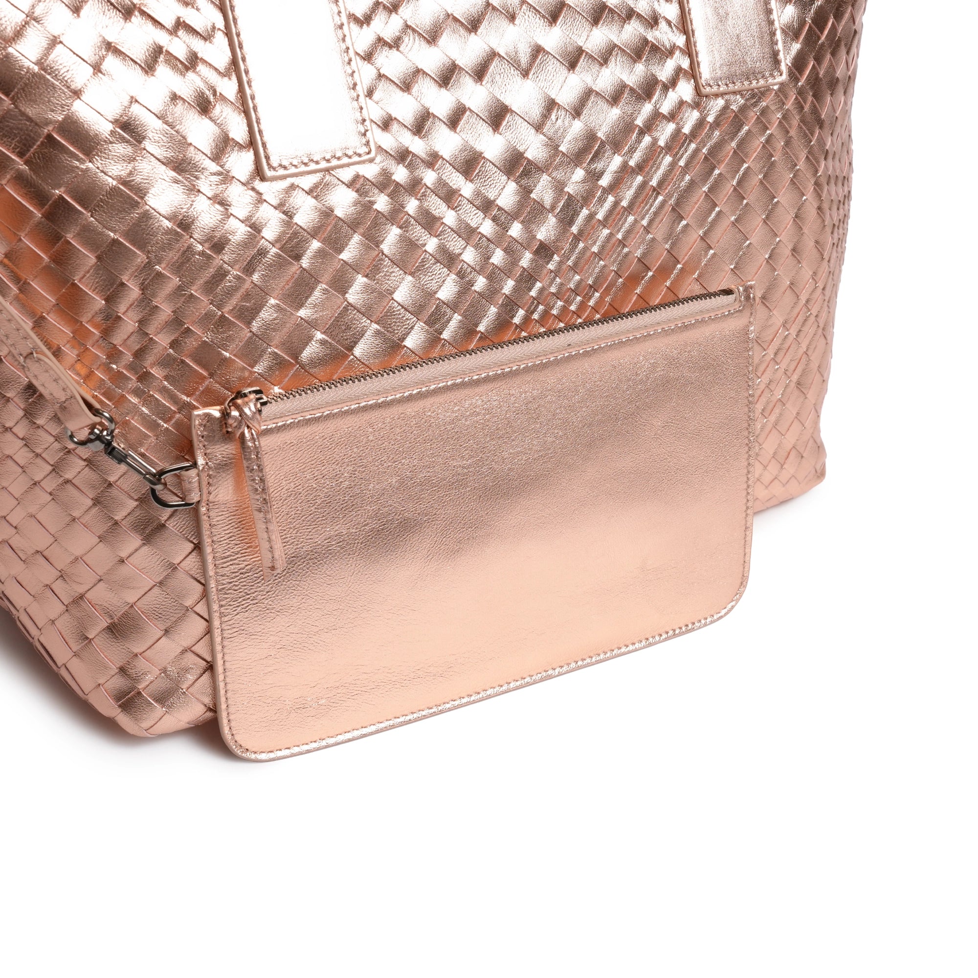 Enjoy our new Sophia Intrecciato Optical Zippered Shopping Bag in Laminated Rose Gold.