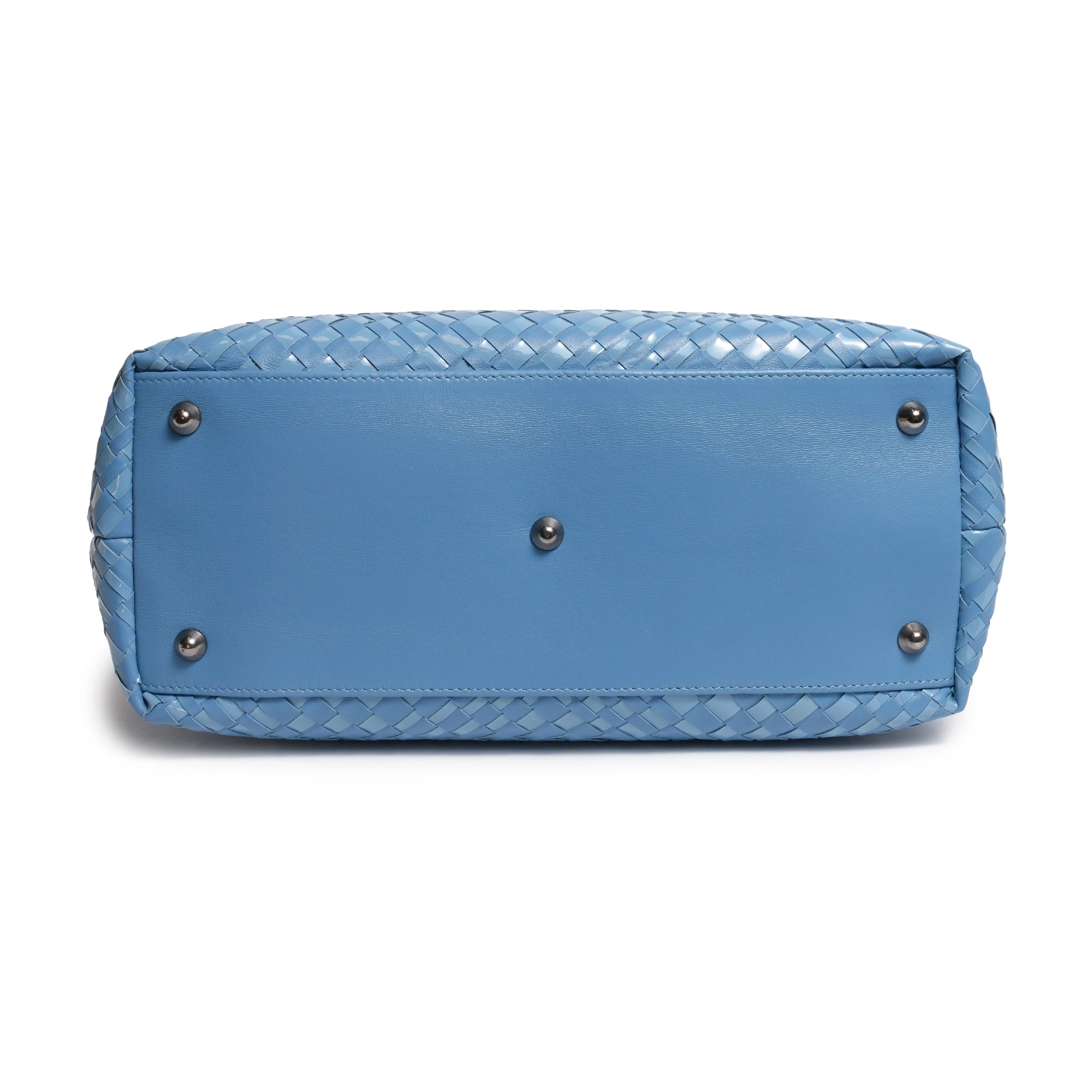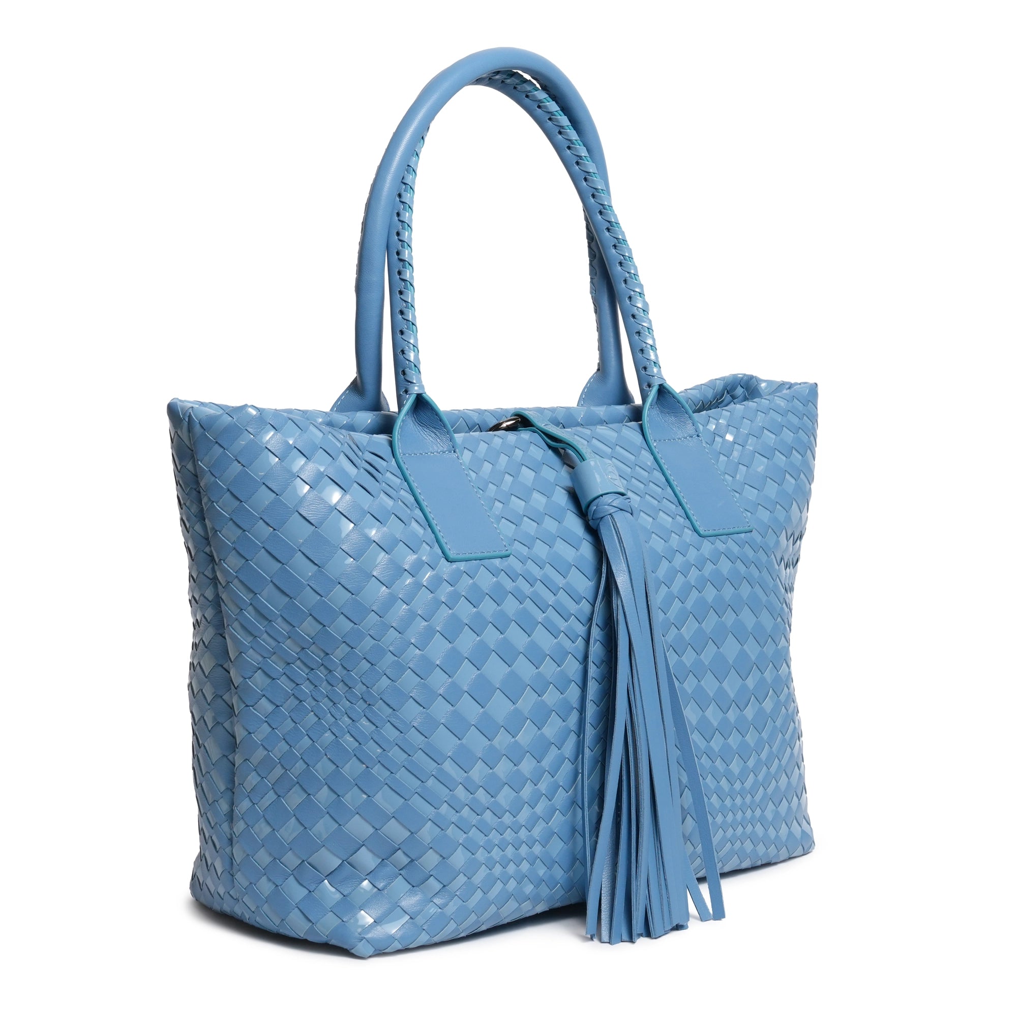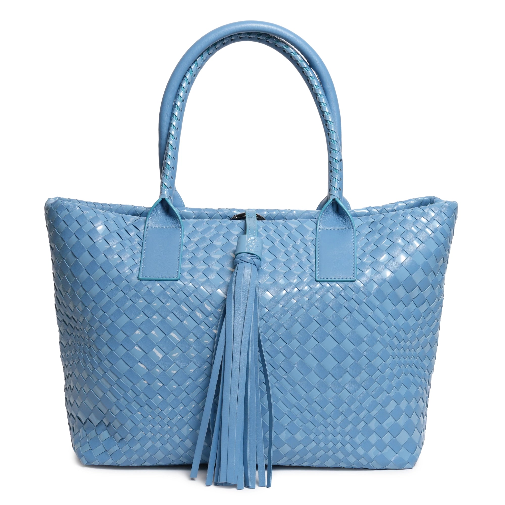 Enjoy our new Sophia Intrecciato Optical Zippered Shopping Bag in Nappa and Patent Leather Marino Blue (Cobalt Blue).