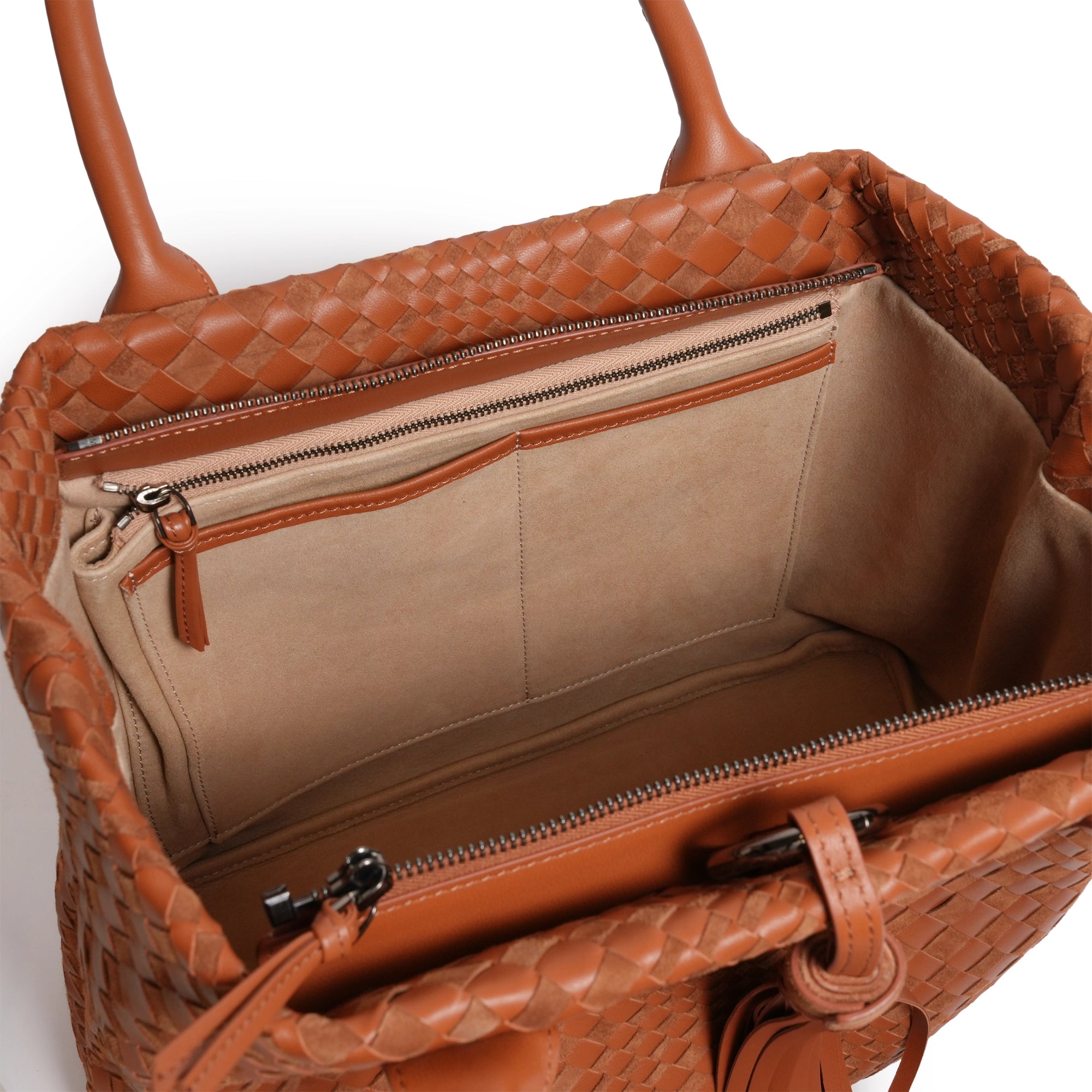 Sophia Intrecciato Optical Zippered Shopping Bag in Nappa and Suede Cuoio