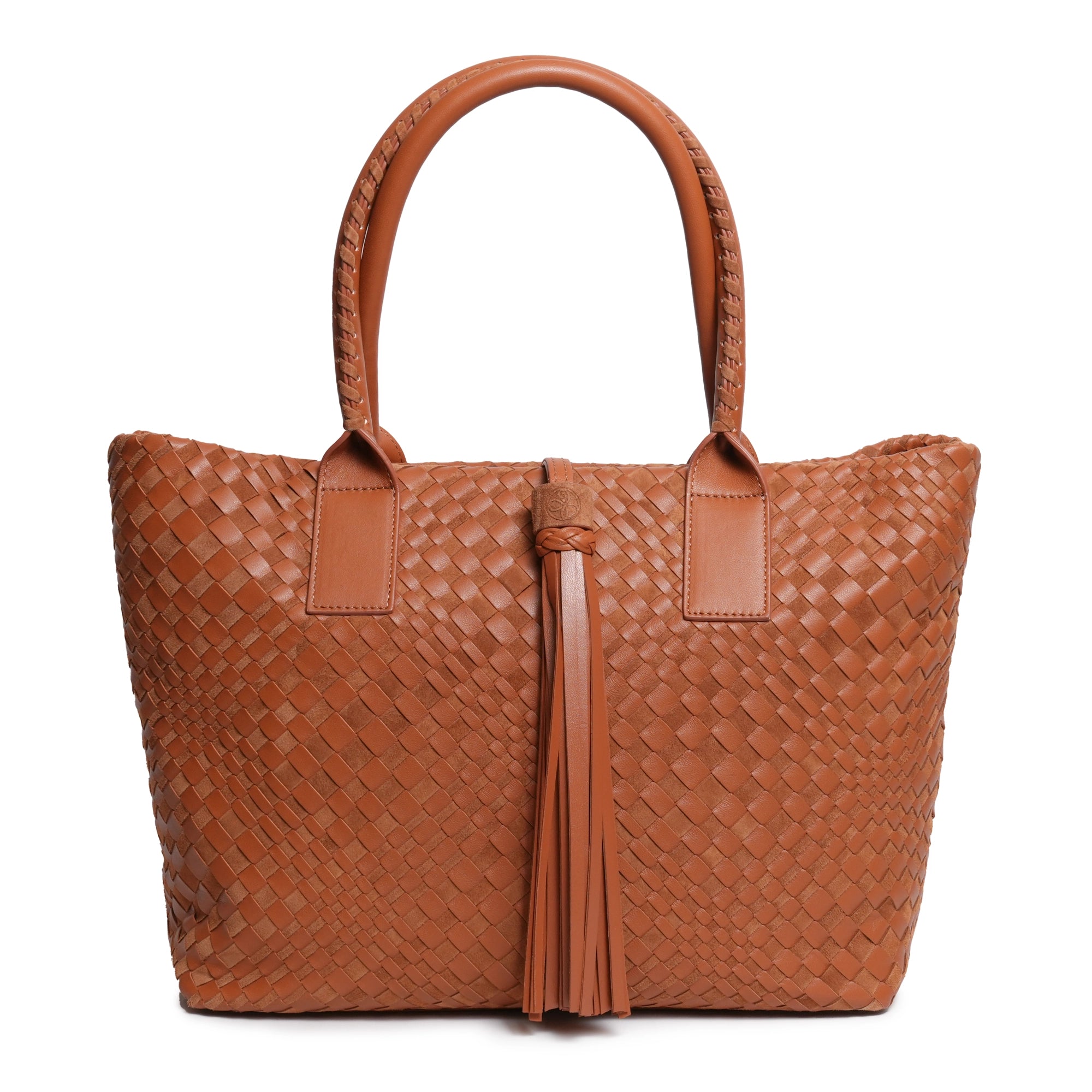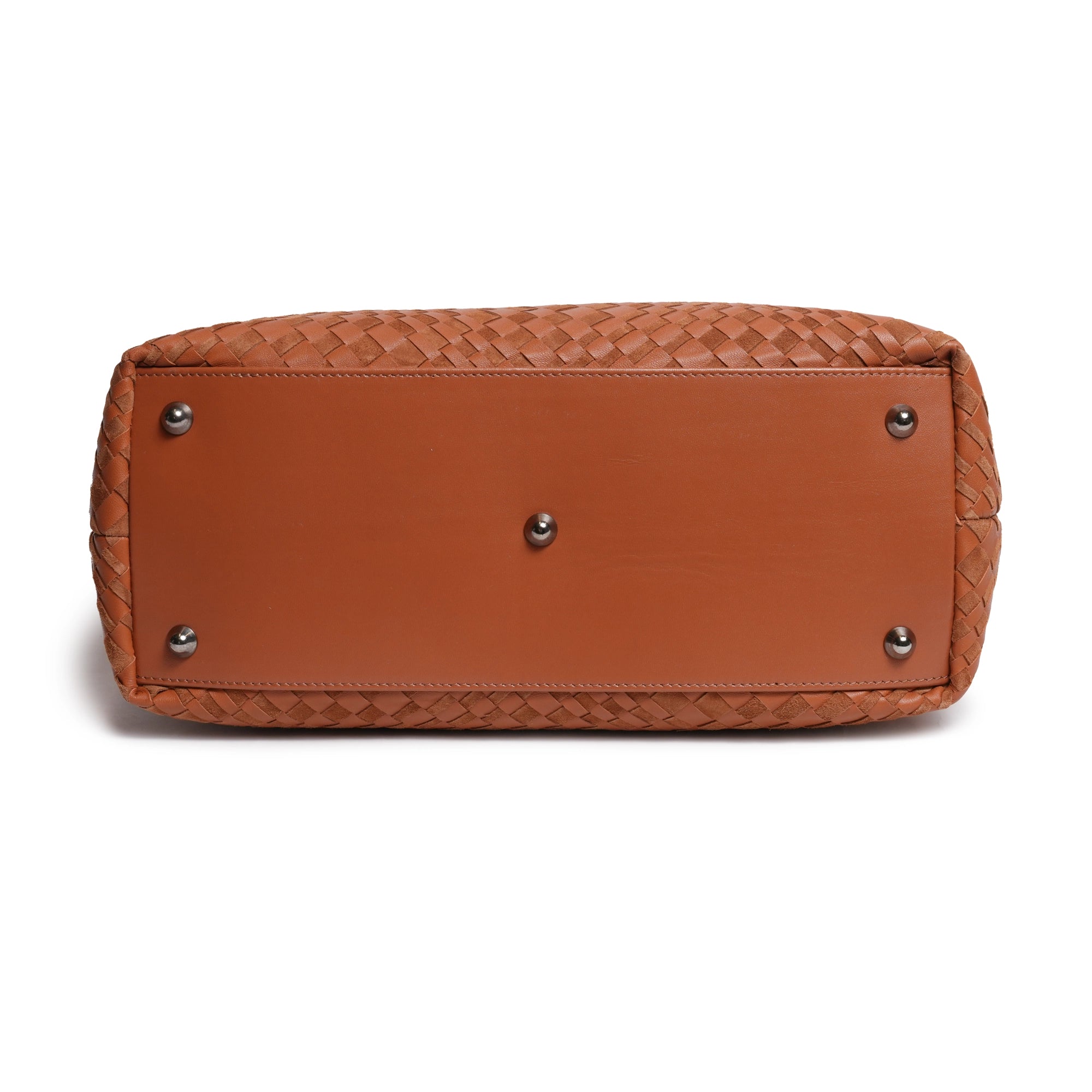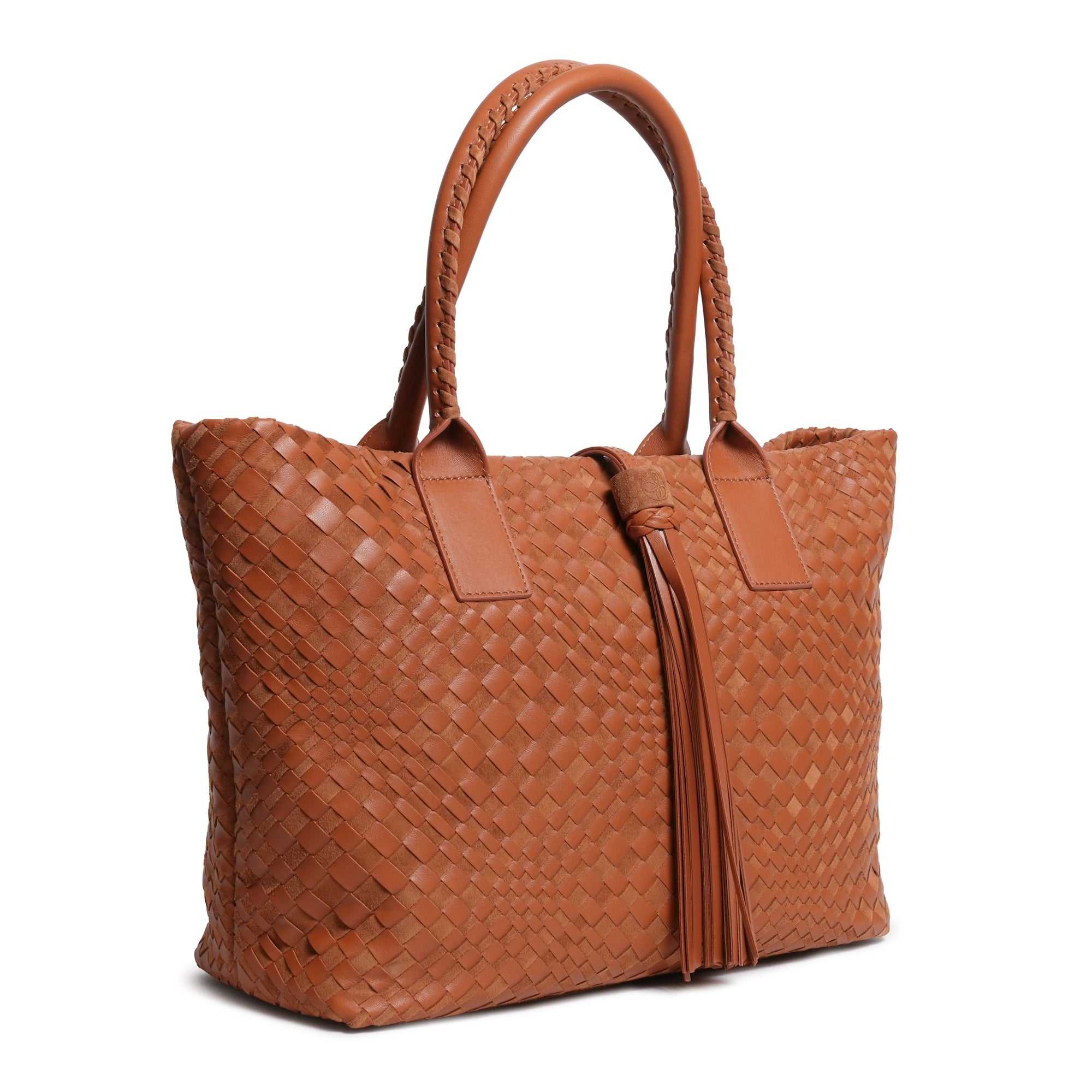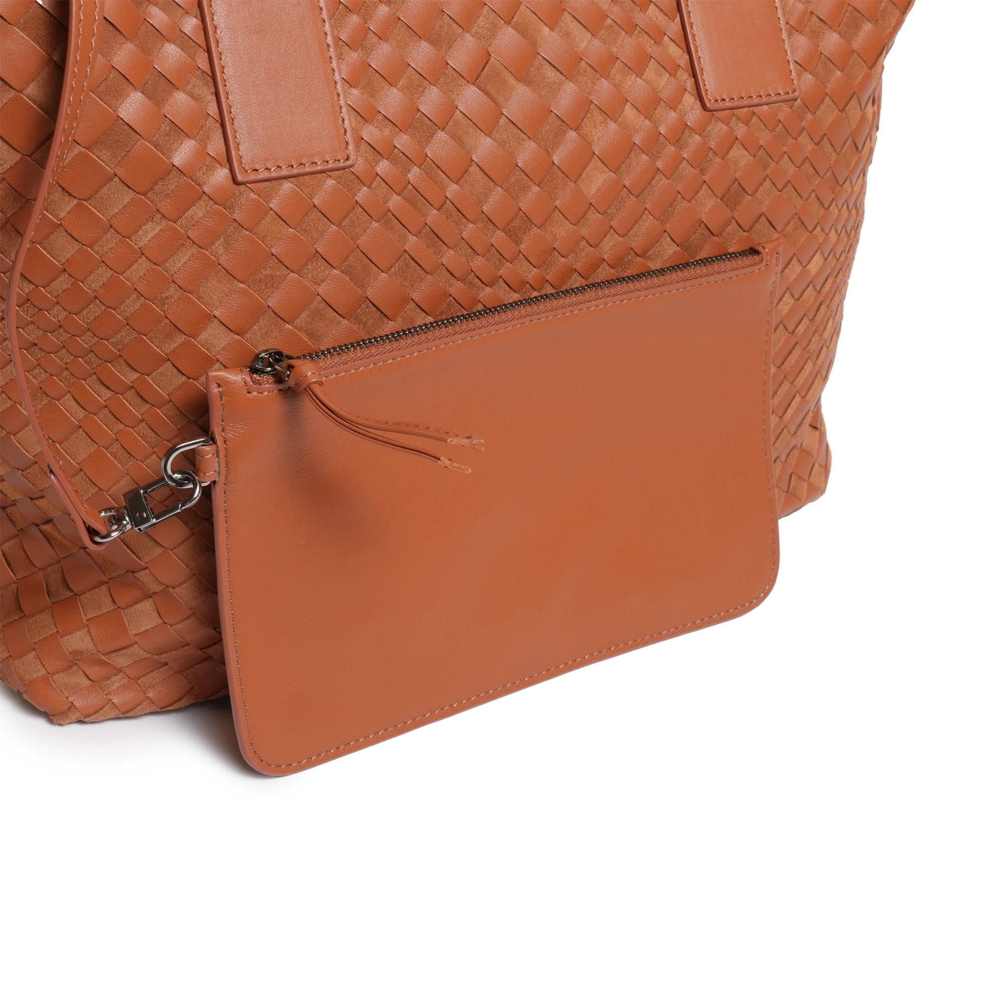Enjoy our new Sophia Intrecciato Optical Zippered Shopping Bag in Nappa and Suede Cuoio Leather (Luggage Color).