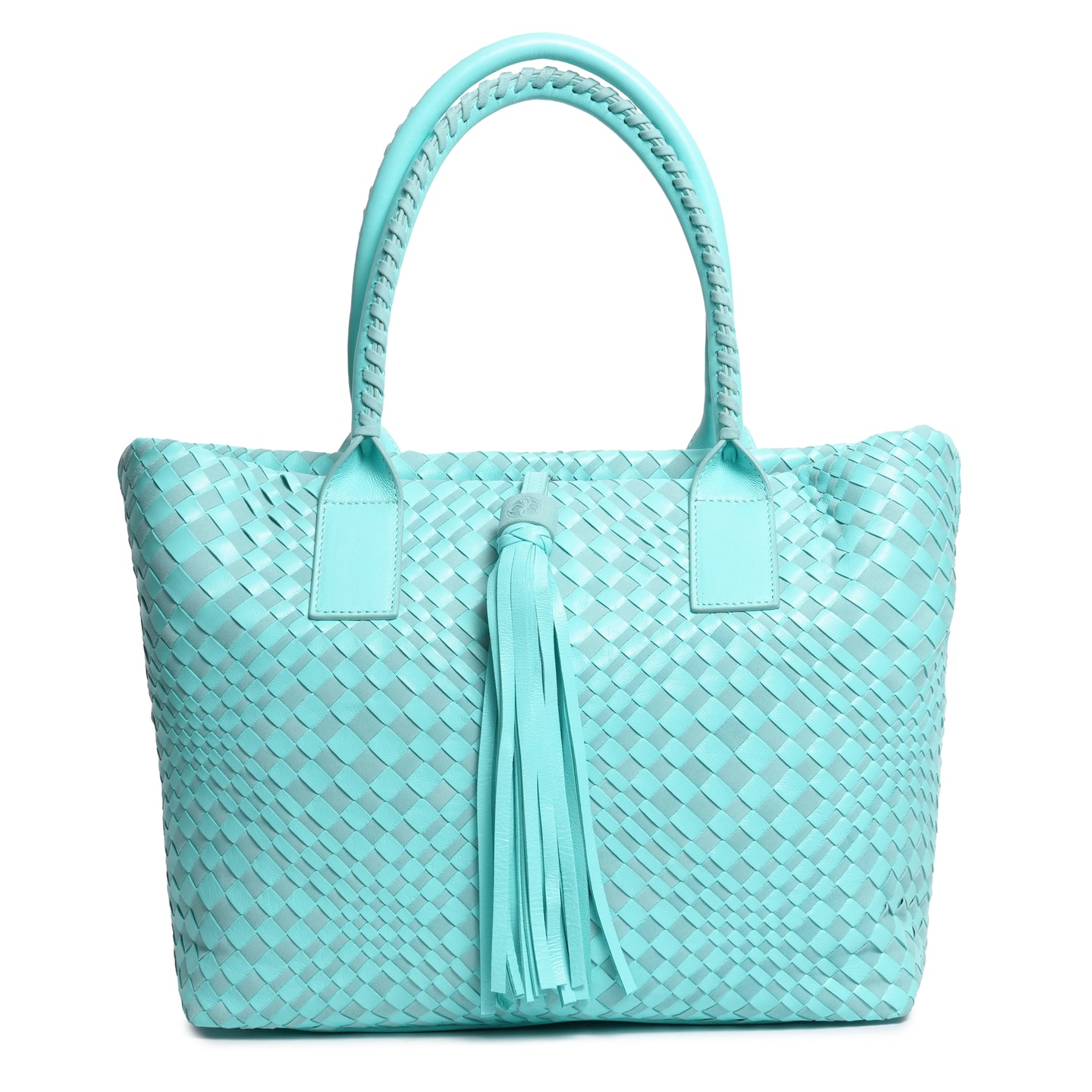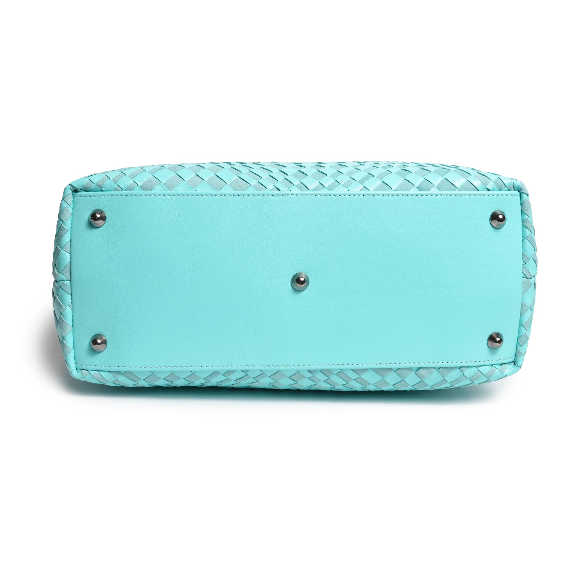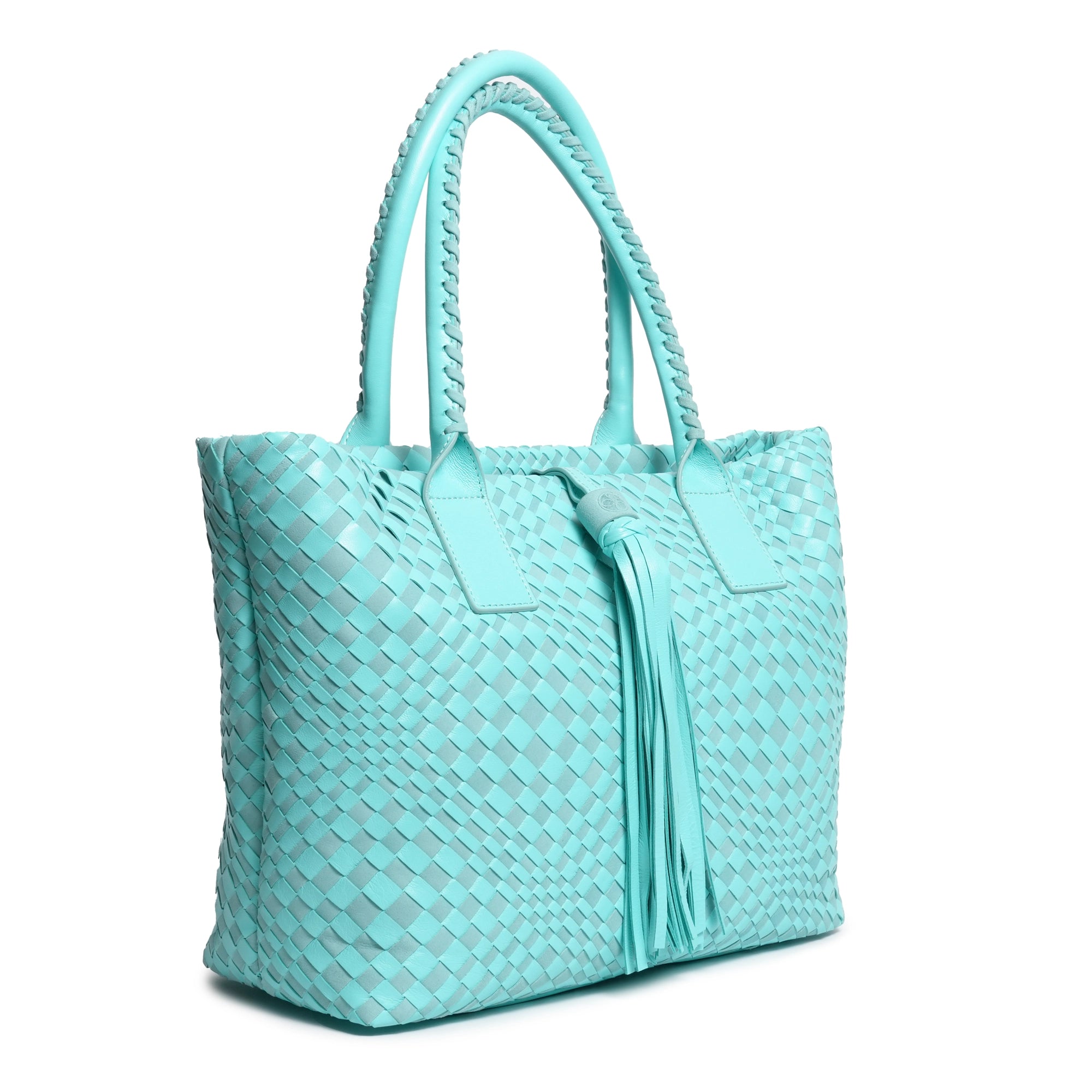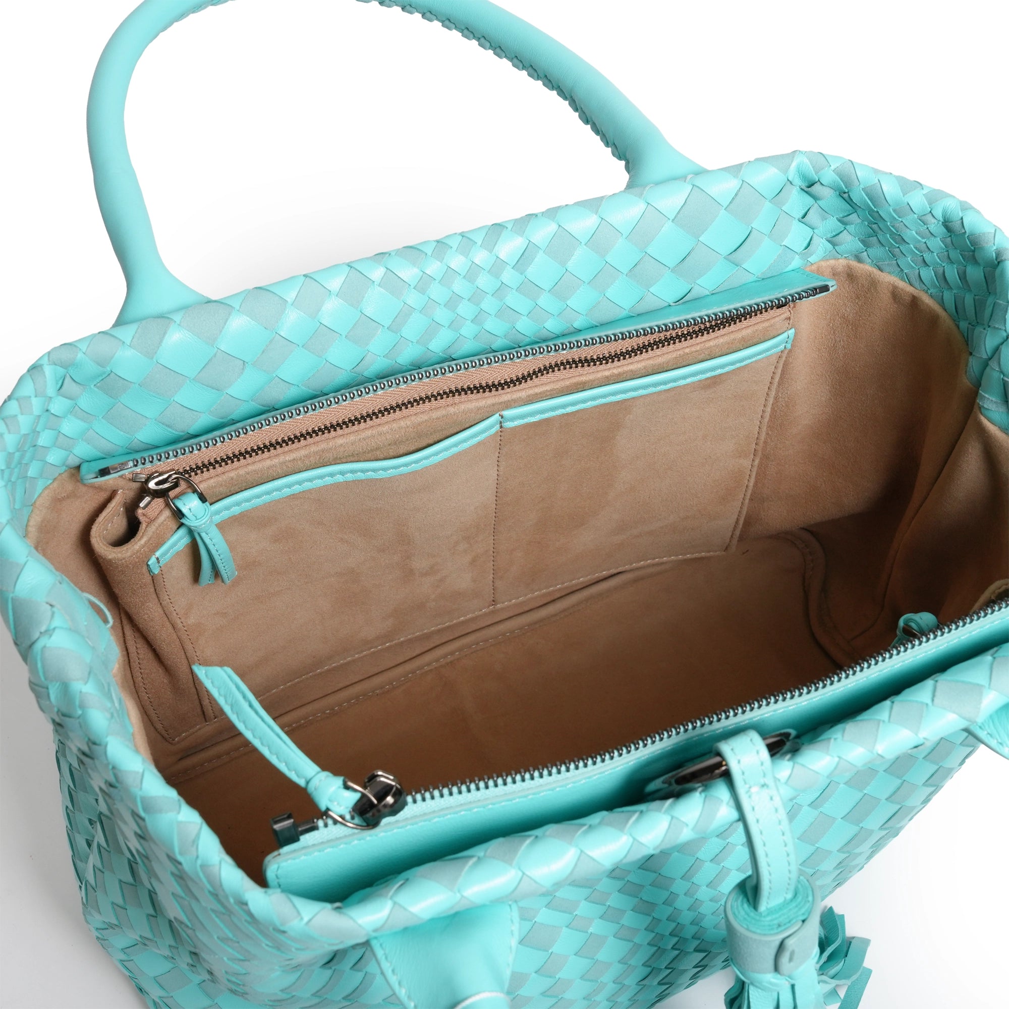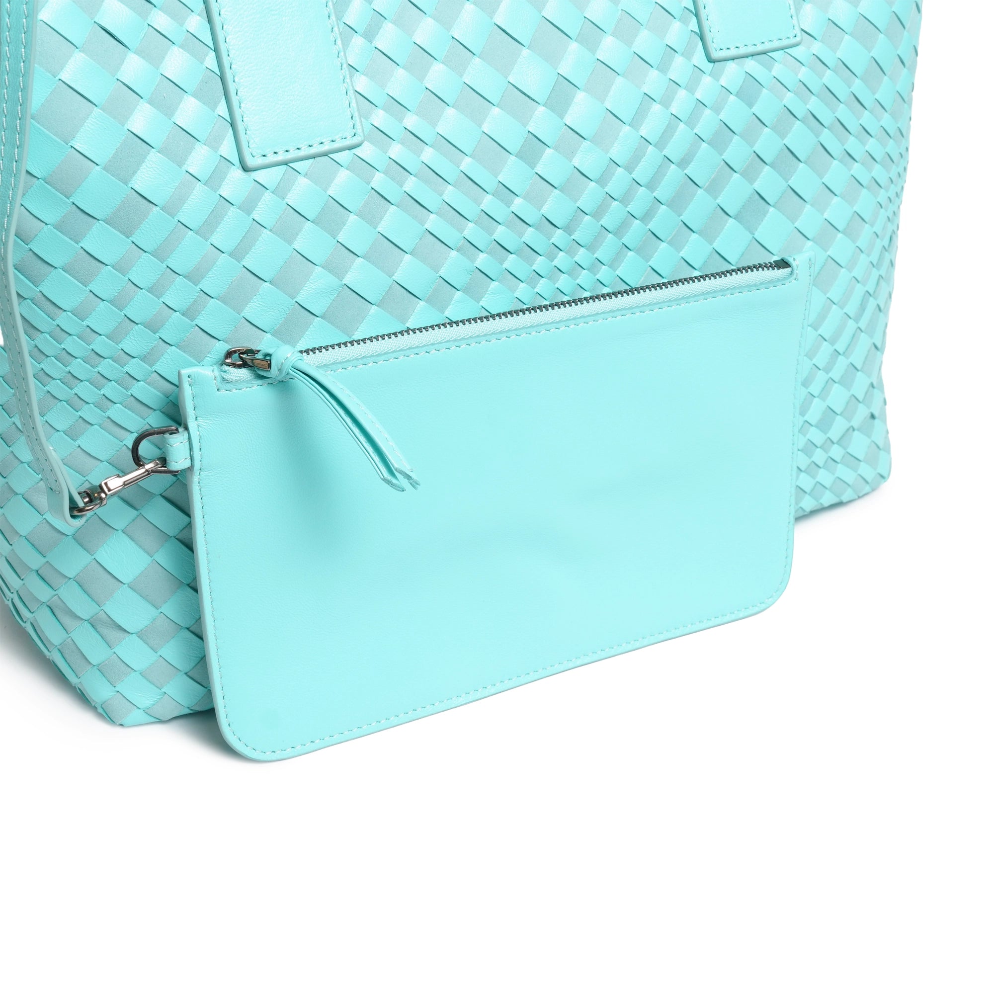 Enjoy our new Sophia Intrecciato Optical Zippered Shopping Bag in Nappa and Suede Twinkletif(Deep Turquoise).