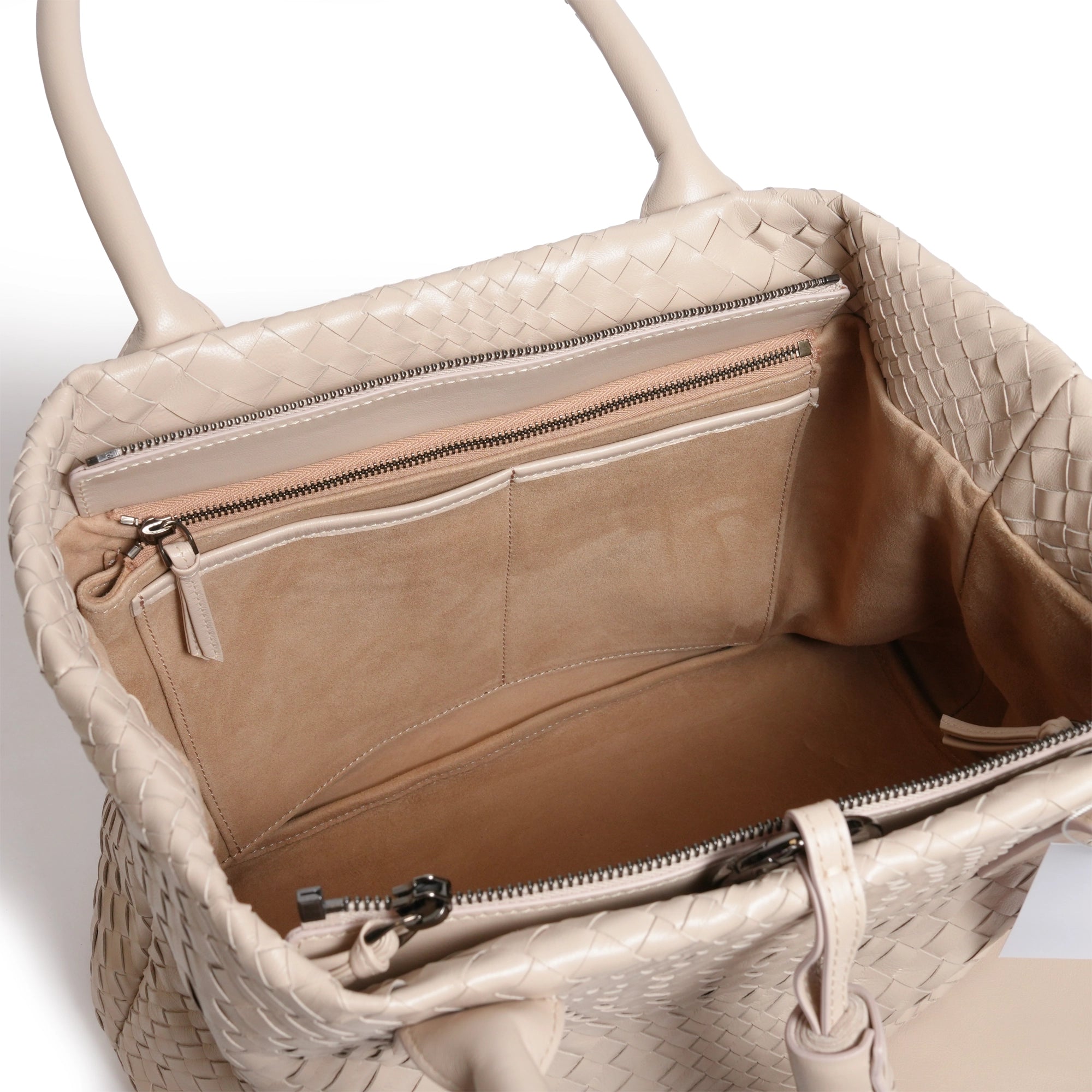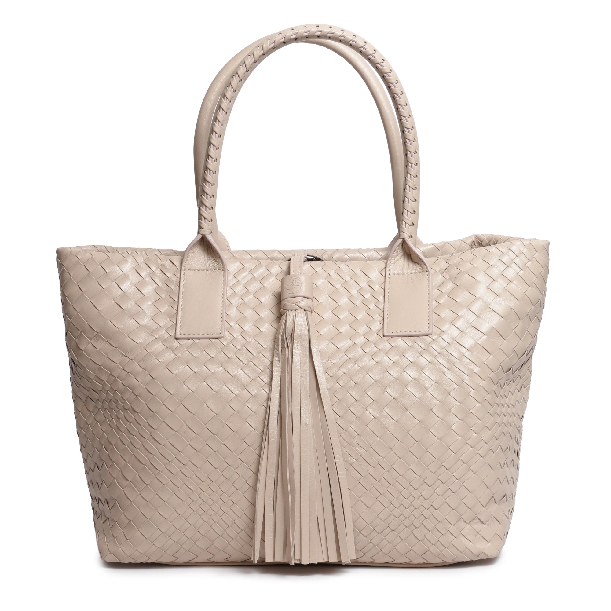 Enjoy our new Sophia Intrecciato Optical Zippered Shopping Bag in Nappa Cipria (Powder).