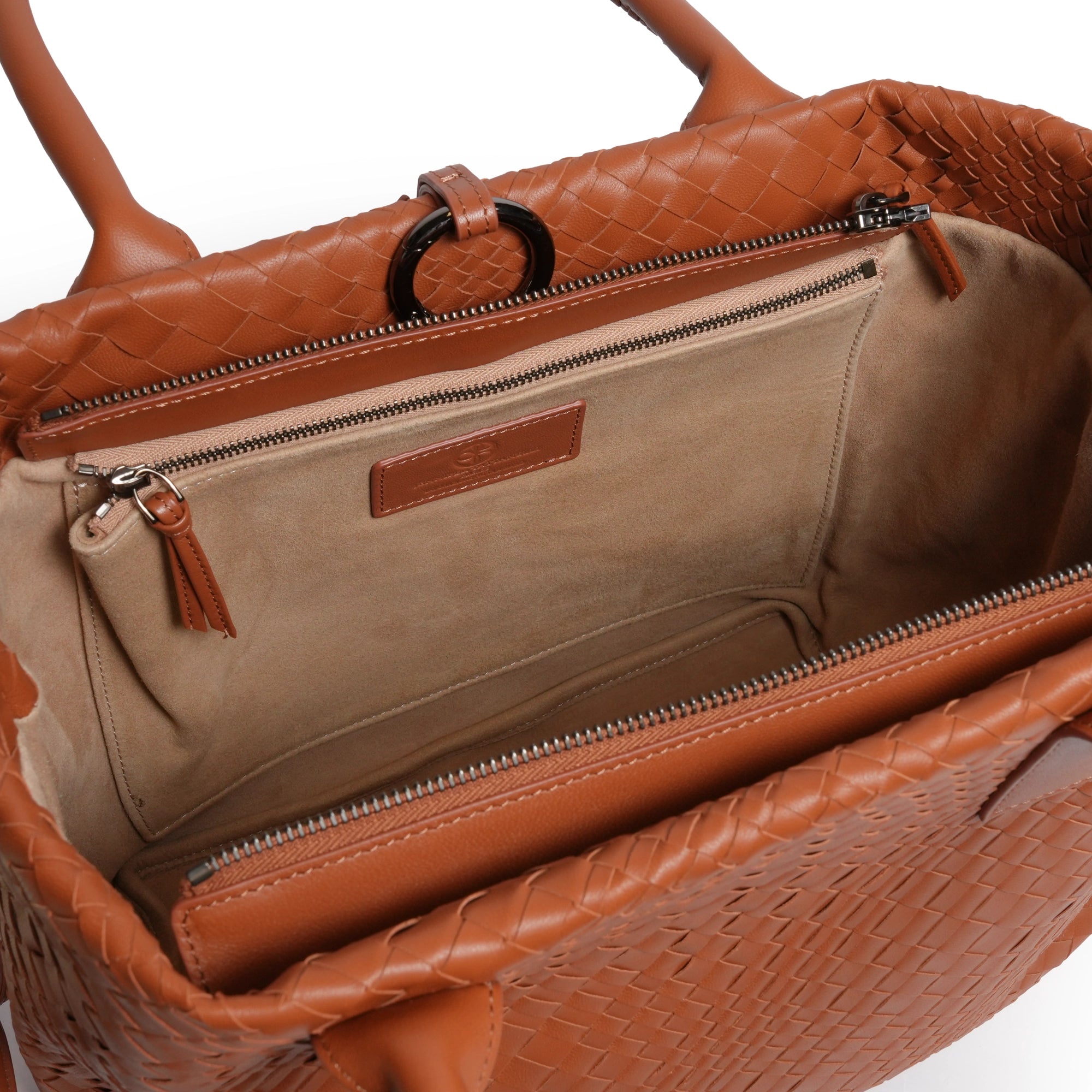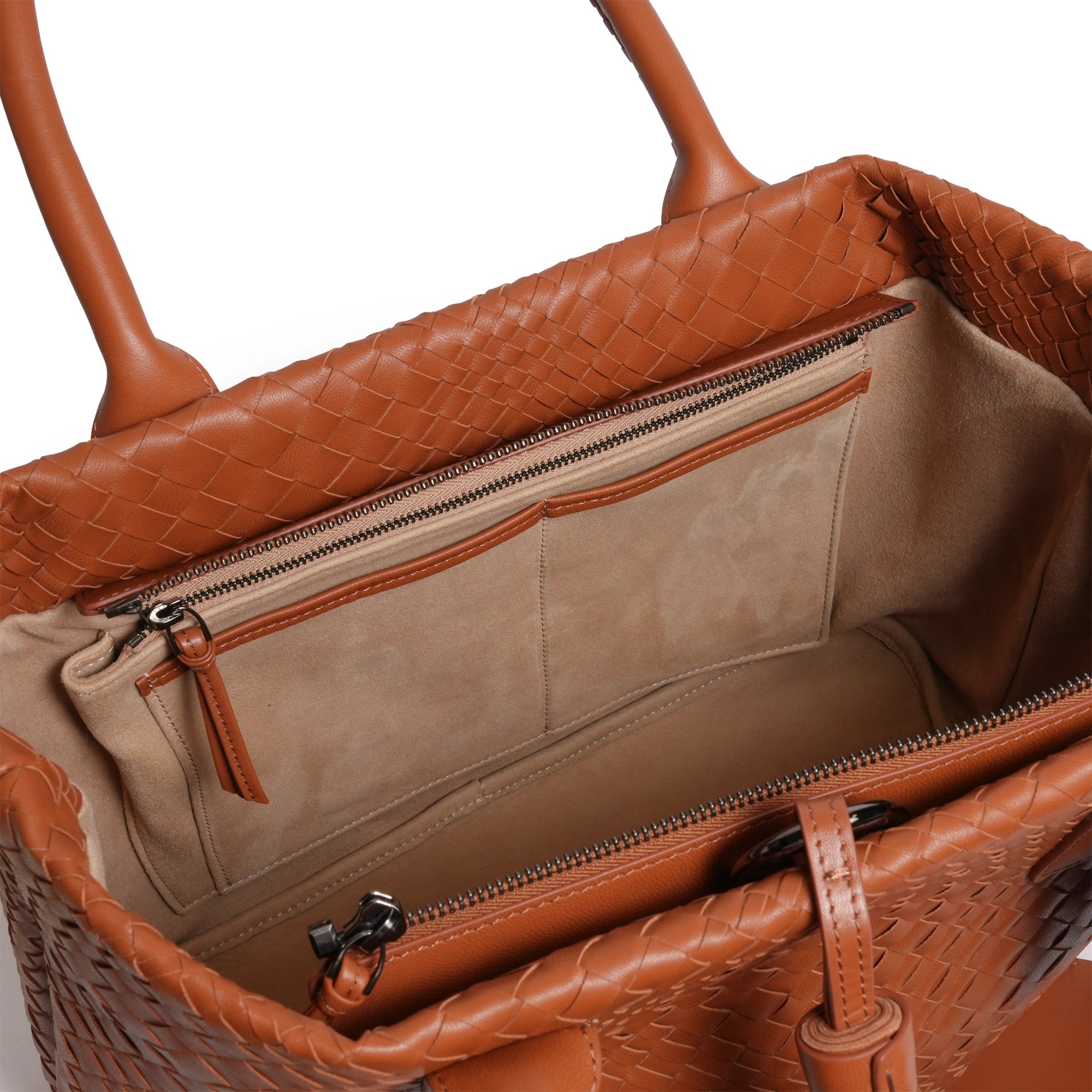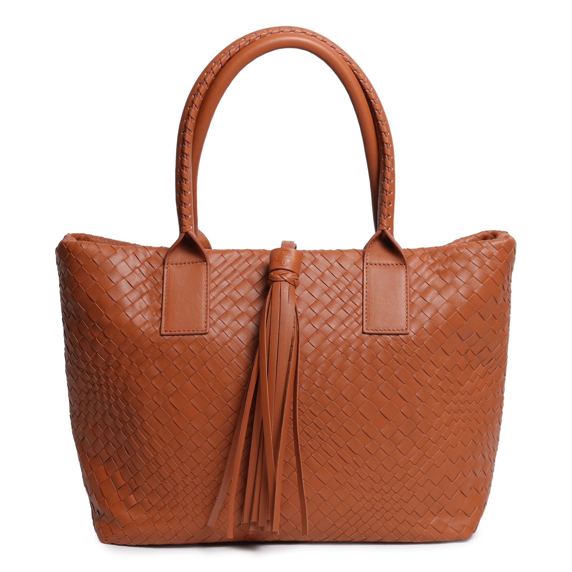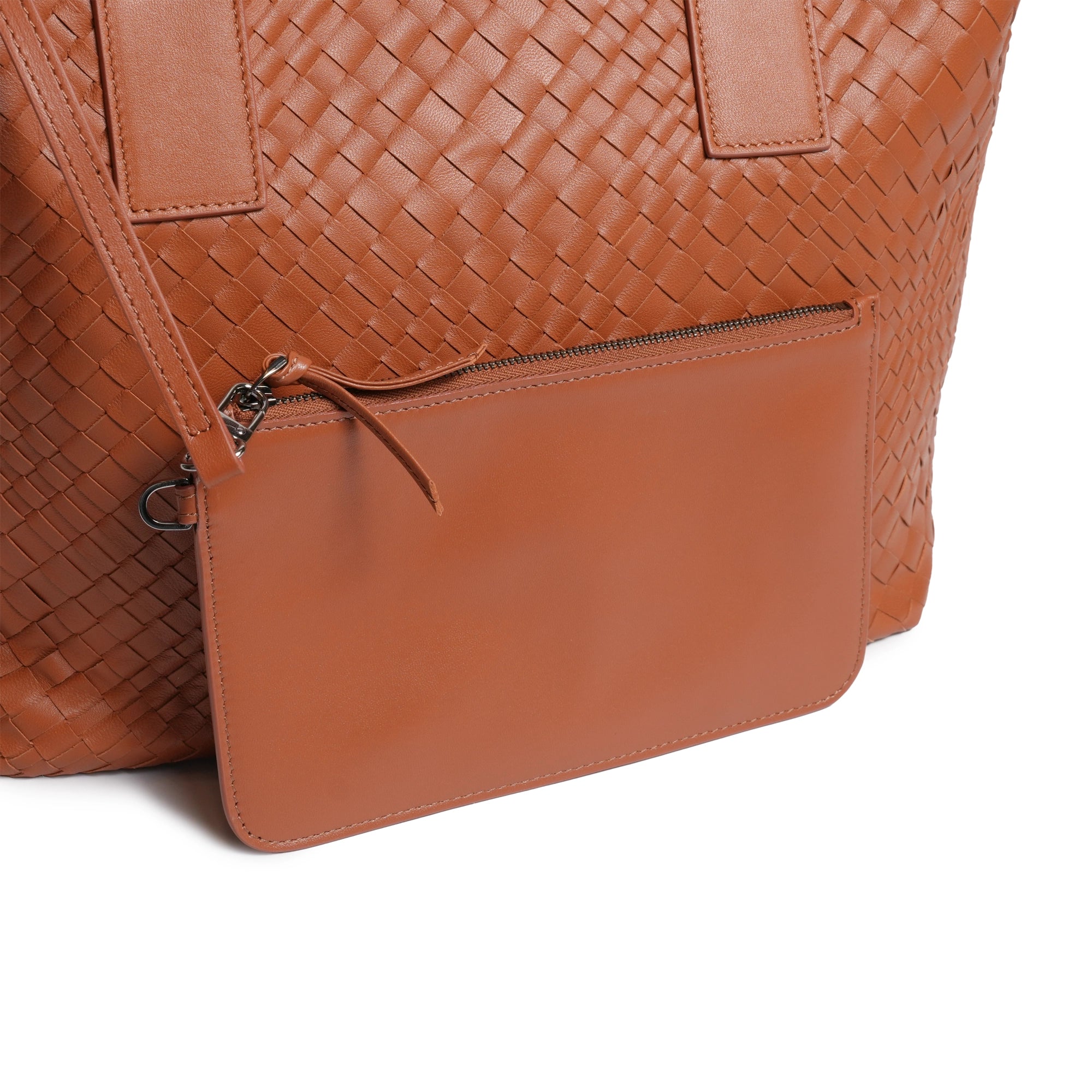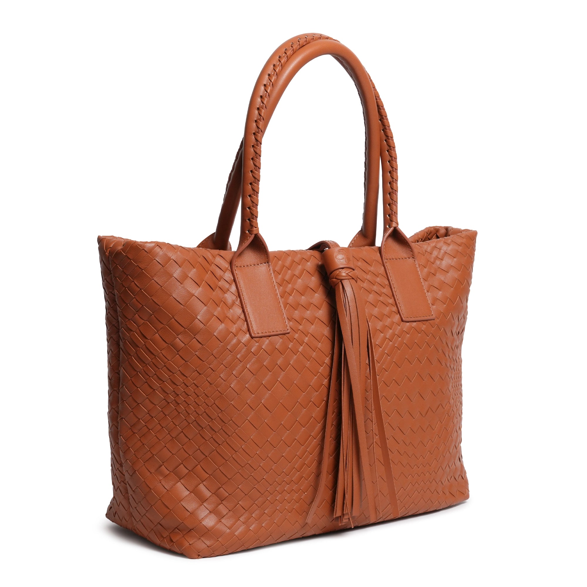 Enjoy our new Sophia Intrecciato Optical Zippered Shopping Bag in Nappa Cuoio (Luggage Color).