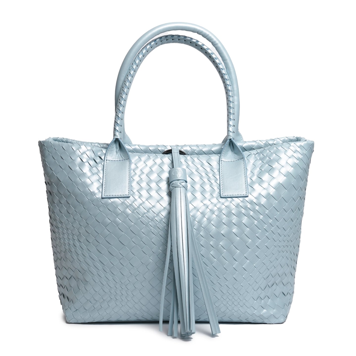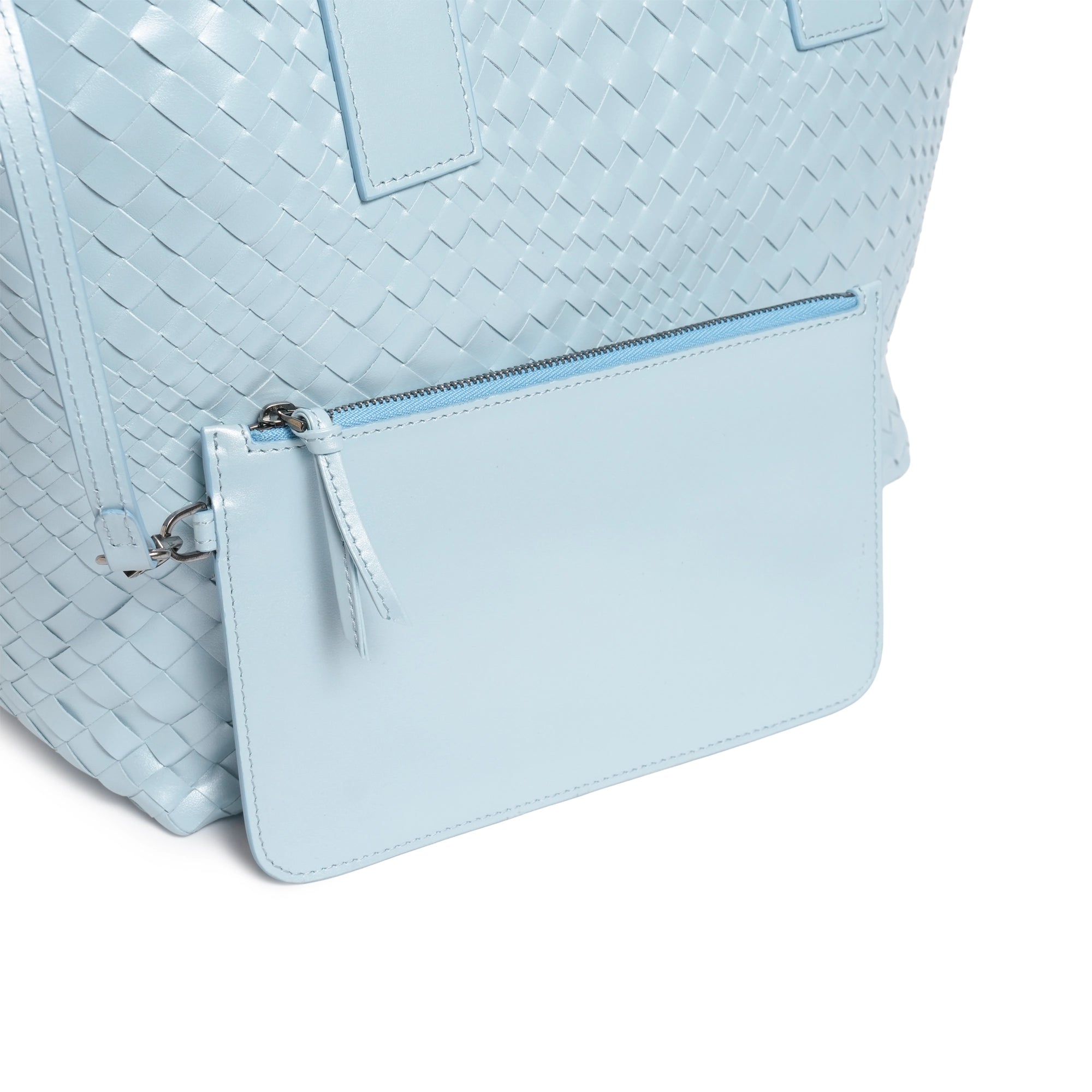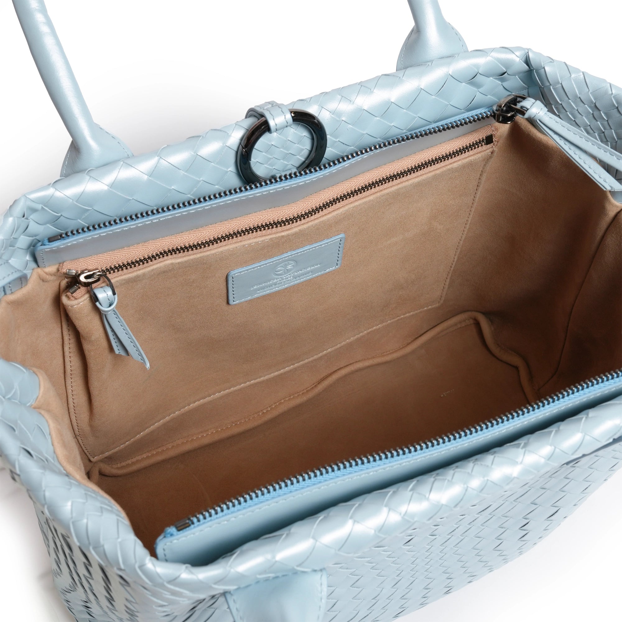 Enjoy our new Sophia Intrecciato Optical Zippered Shopping Bag in Pearlized Celeste (Light Blue).