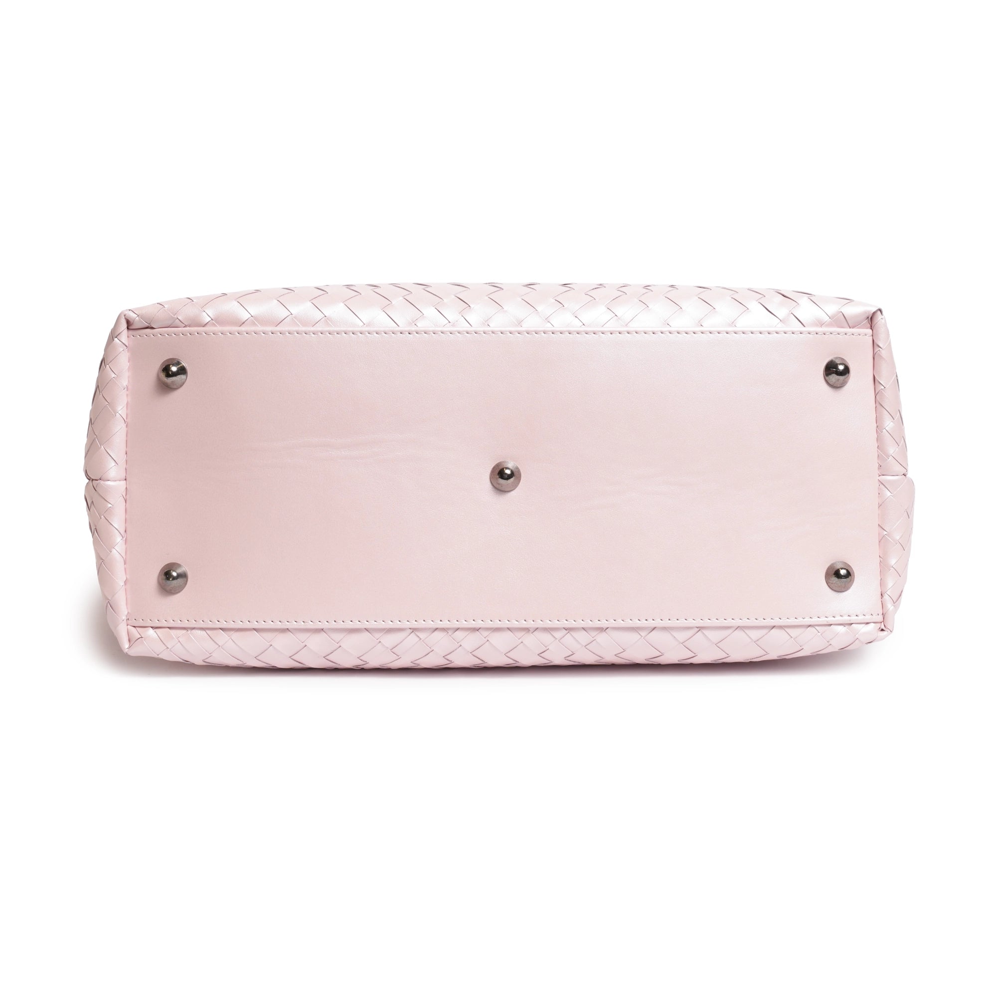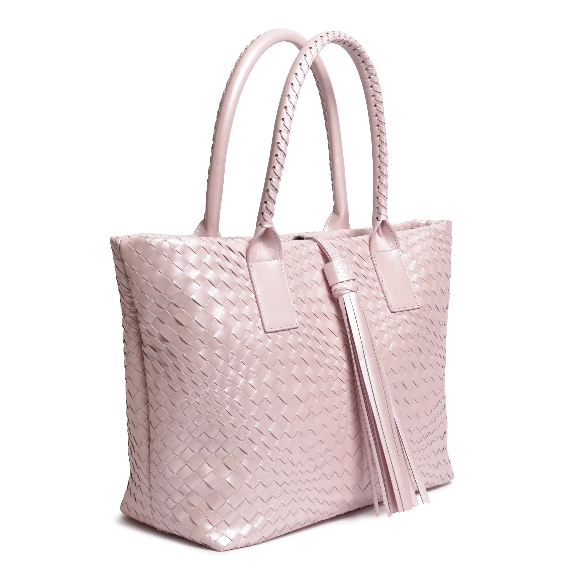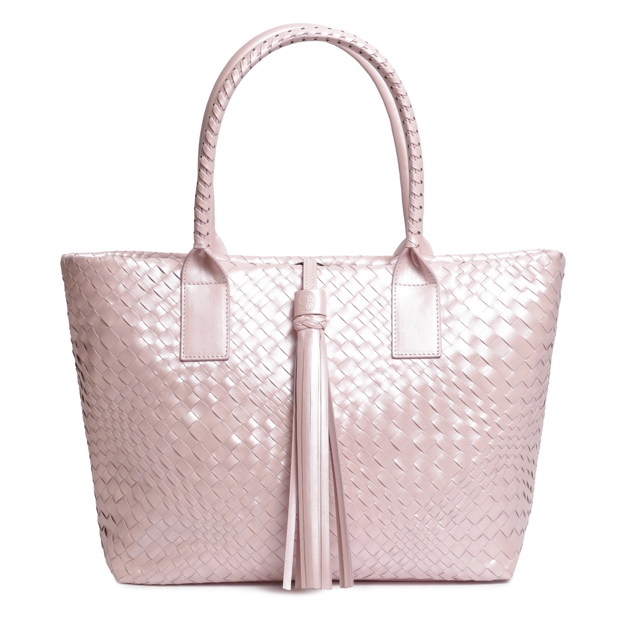 Enjoy our new Sophia Intrecciato Optical Zippered Shopping Bag in Pearlized Pink.
