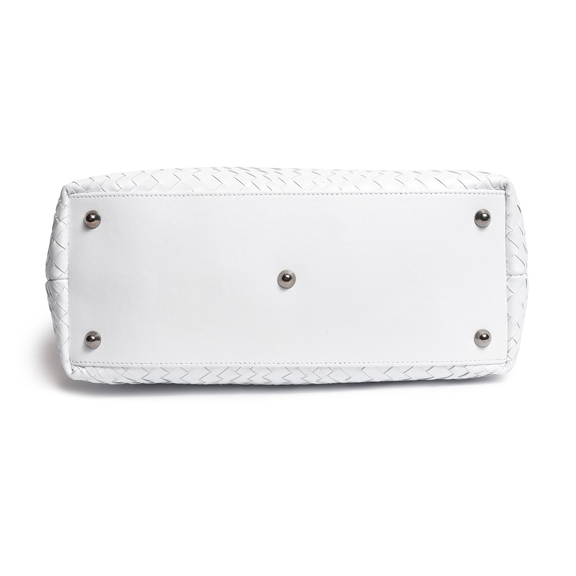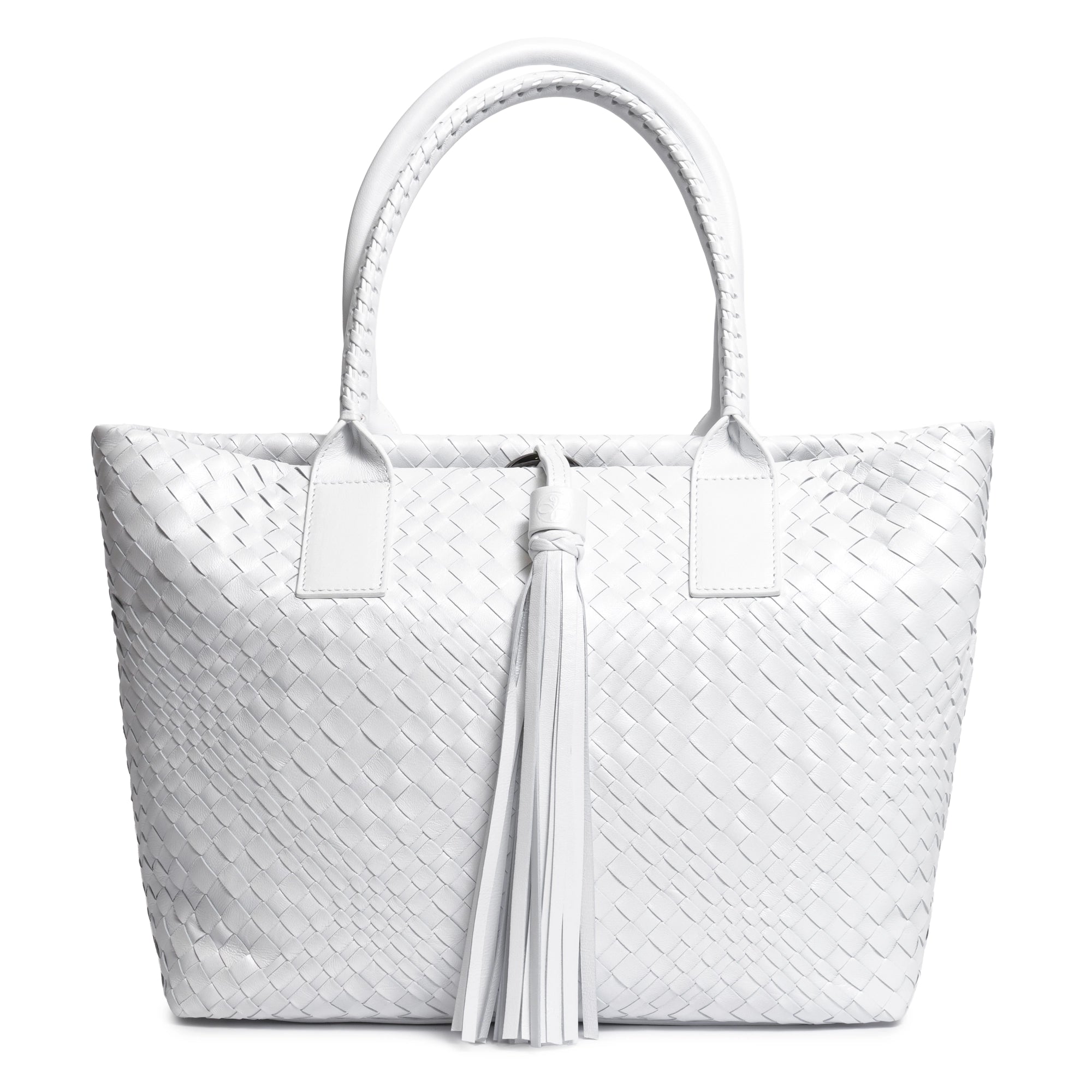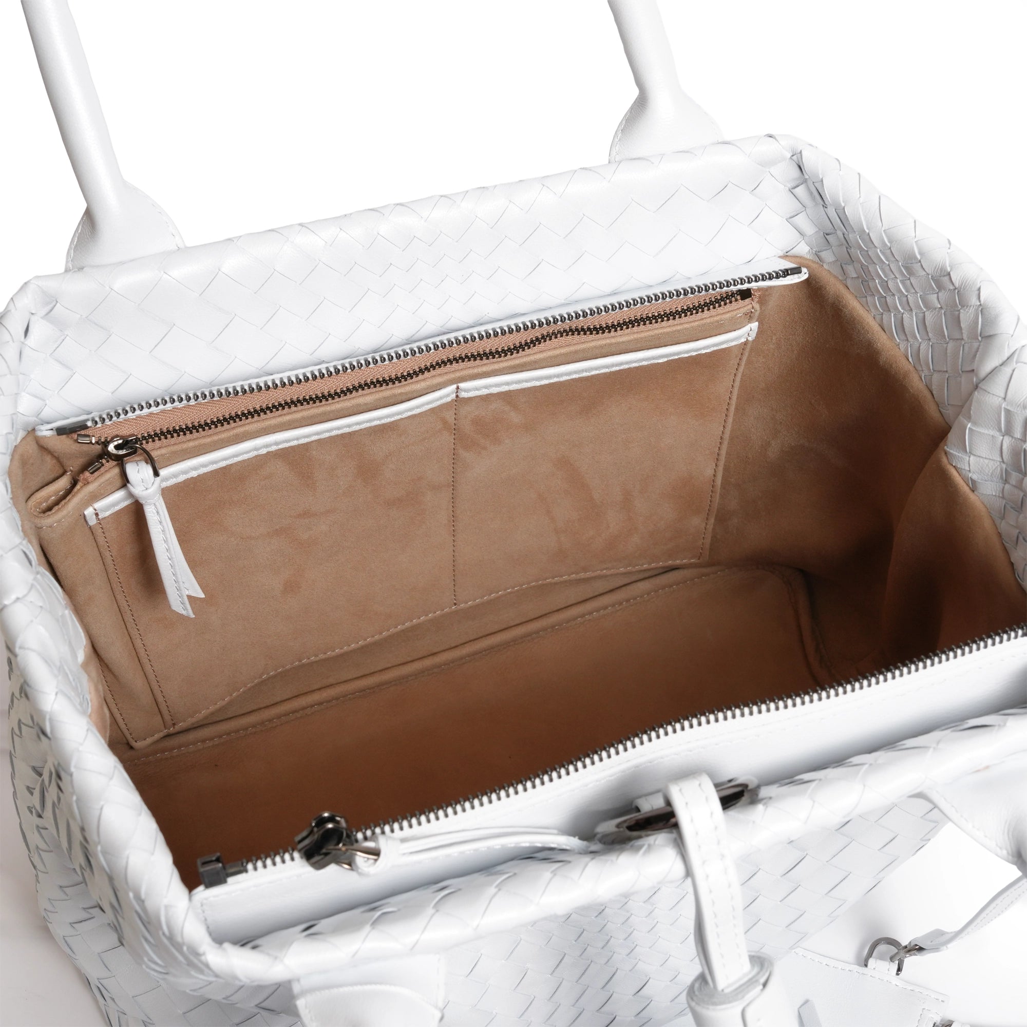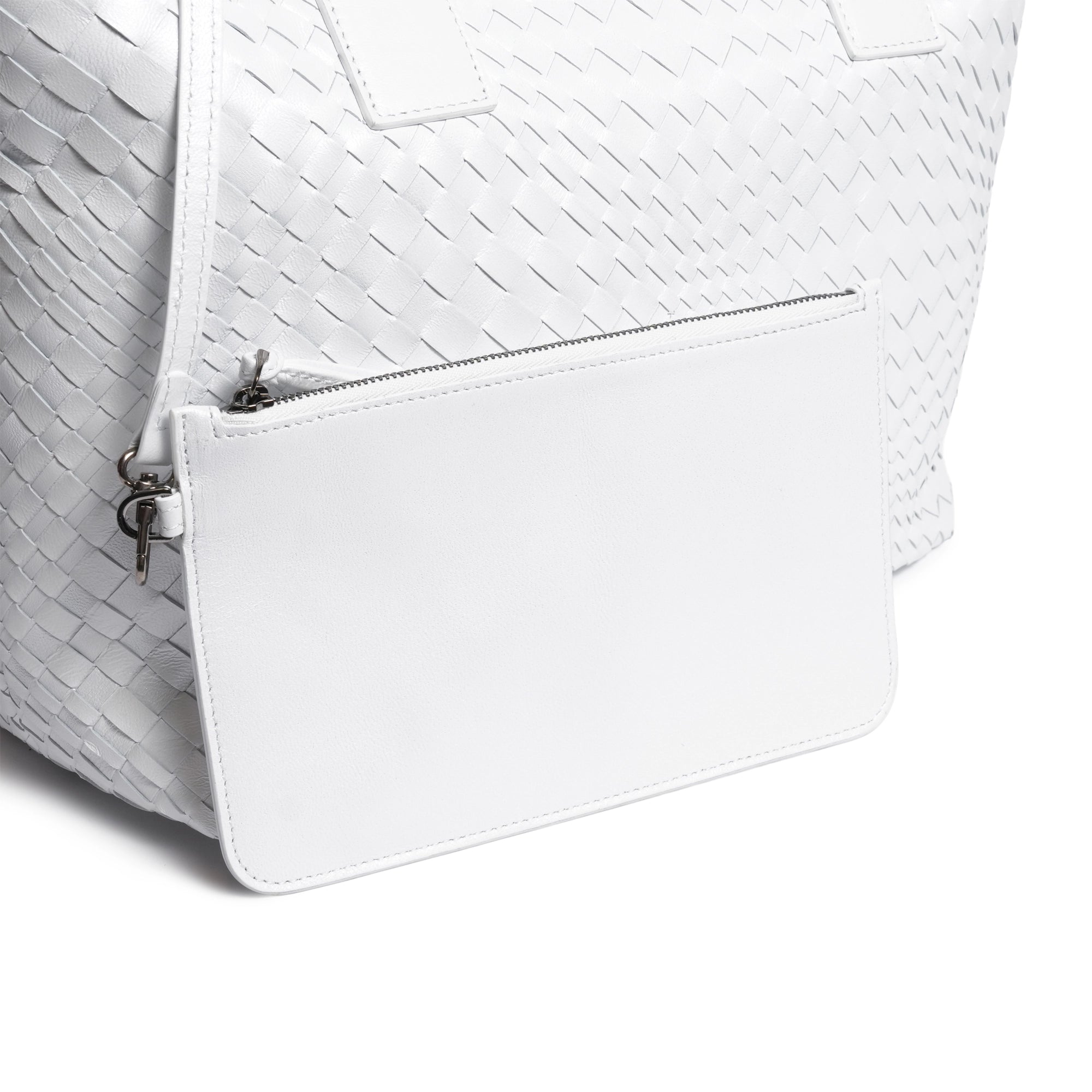 Enjoy our new Sophia Intrecciato Optical Zippered Shopping Bag in Pearlized White.