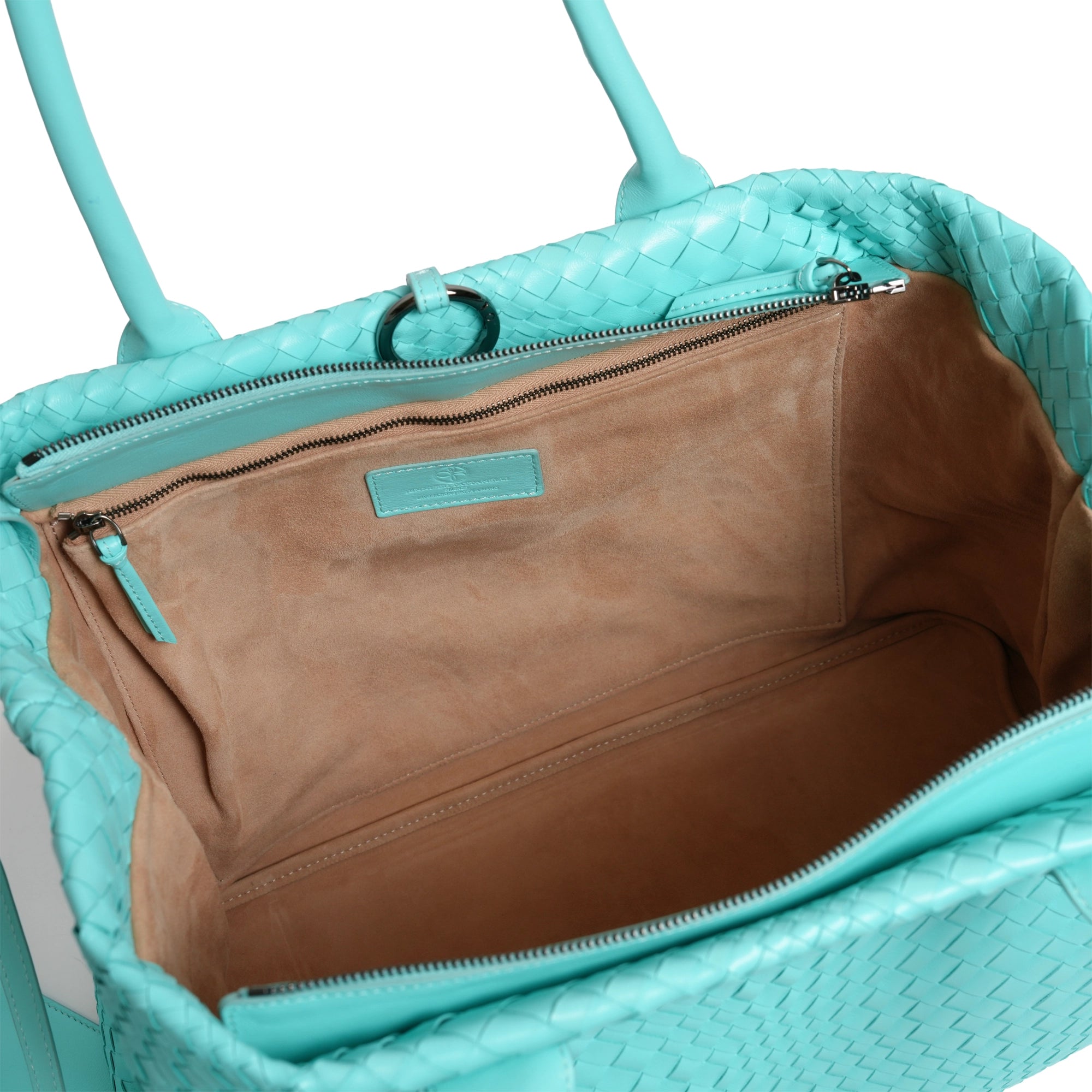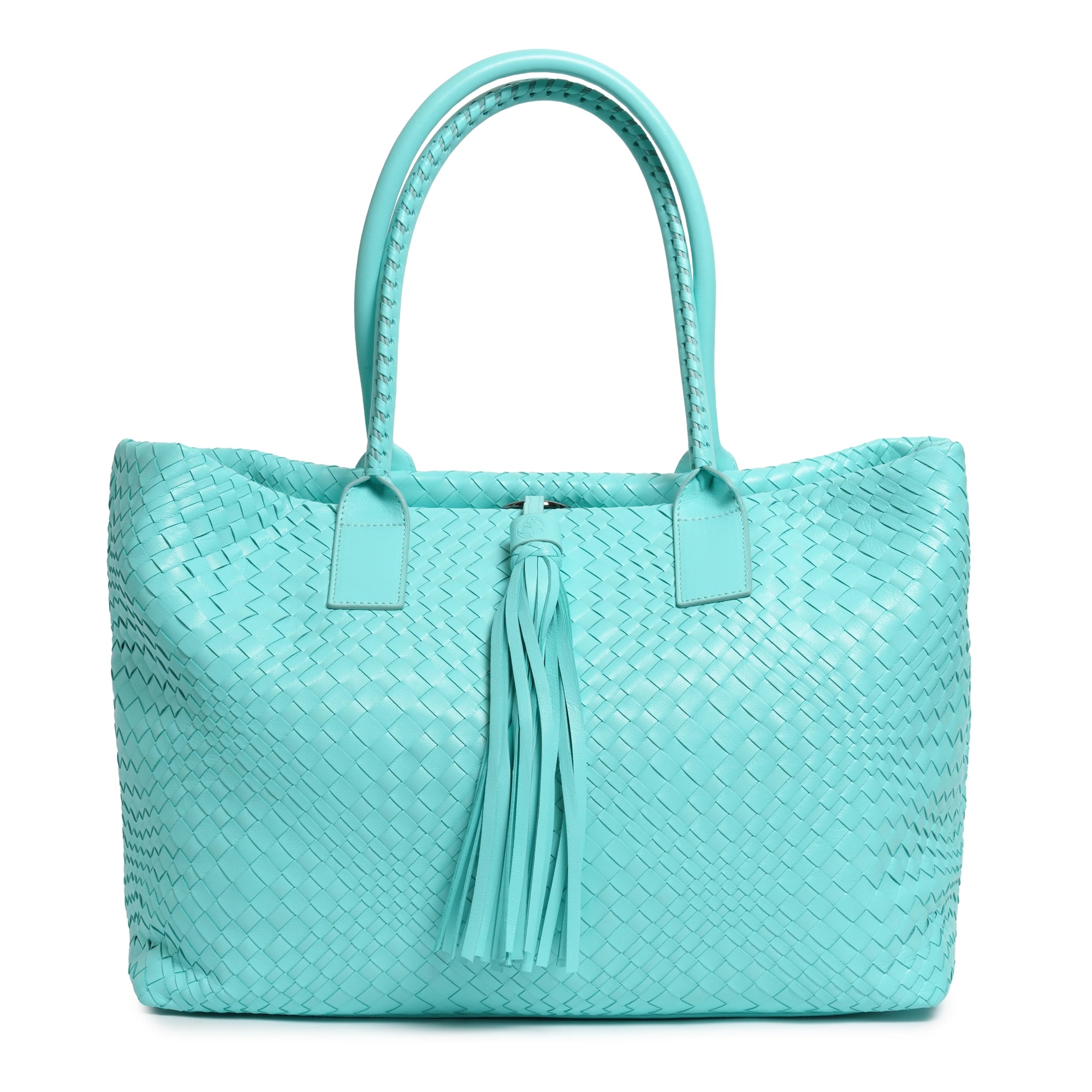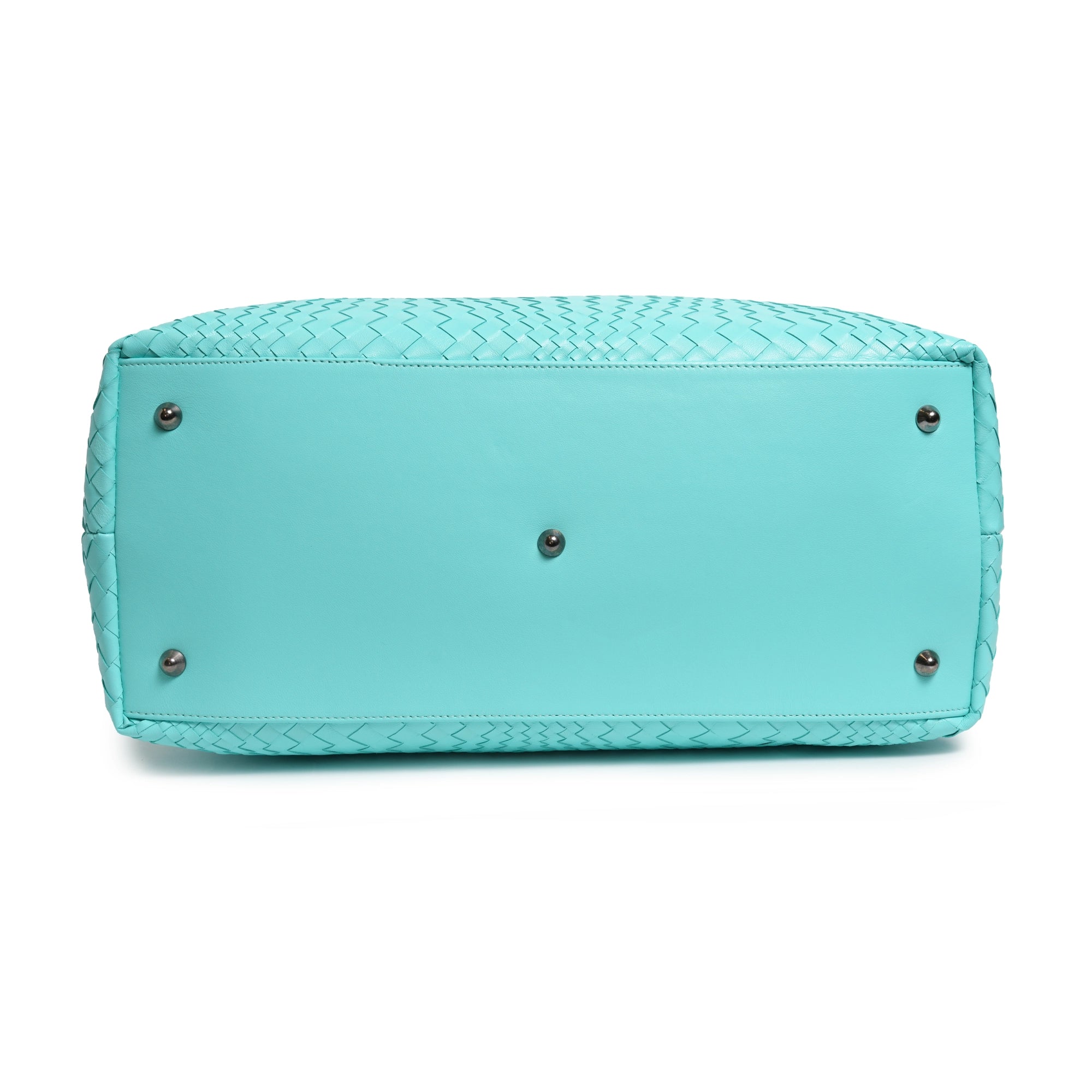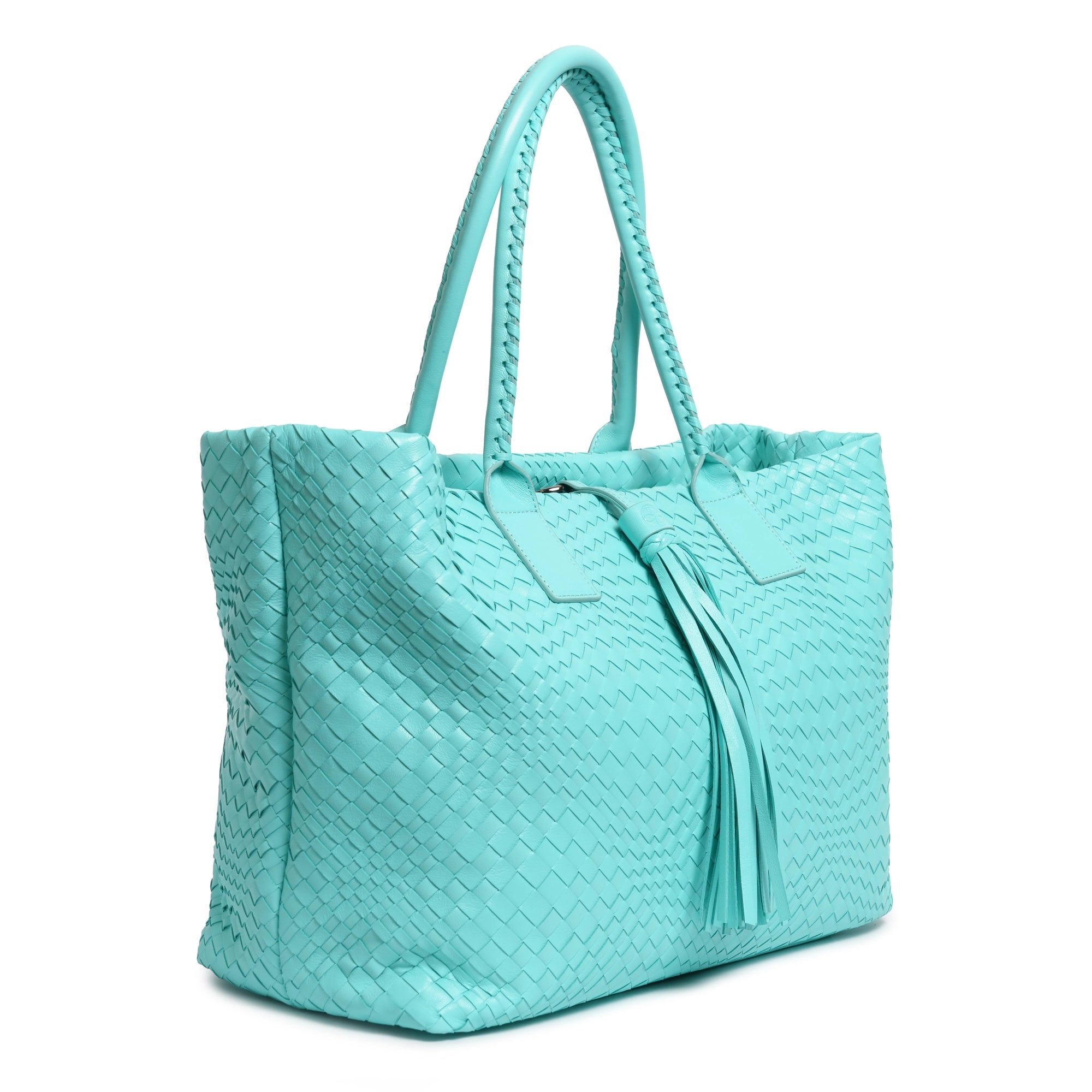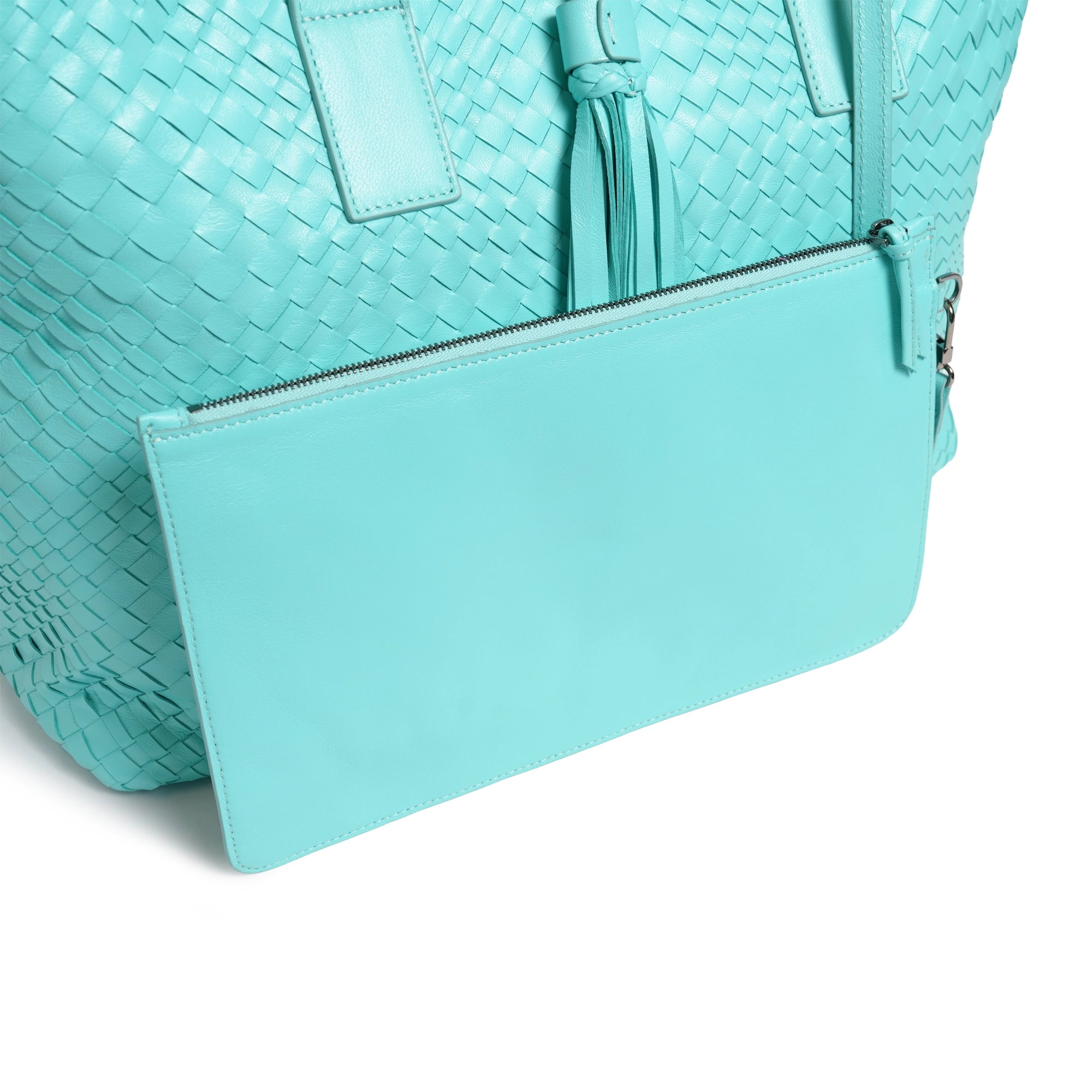 Make a statement of elegance and practicality with the Sophia Maxi Intrecciato Zippered Leather Tote Bag in Nappa Twinkletif (Deep Turquoise).