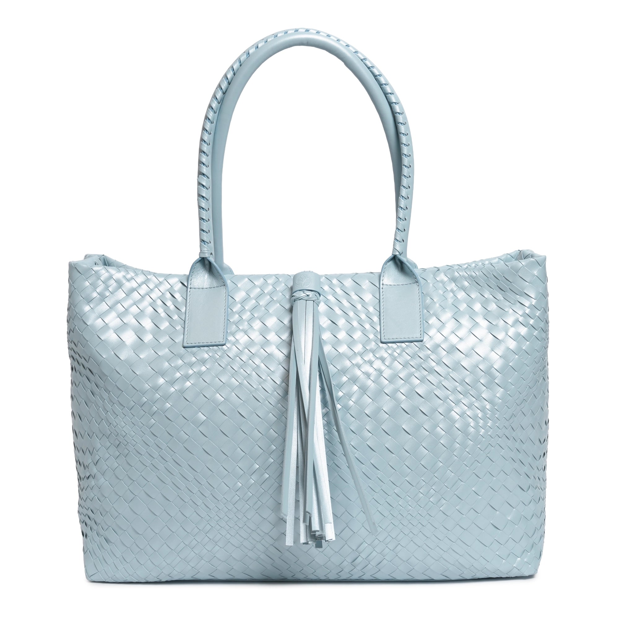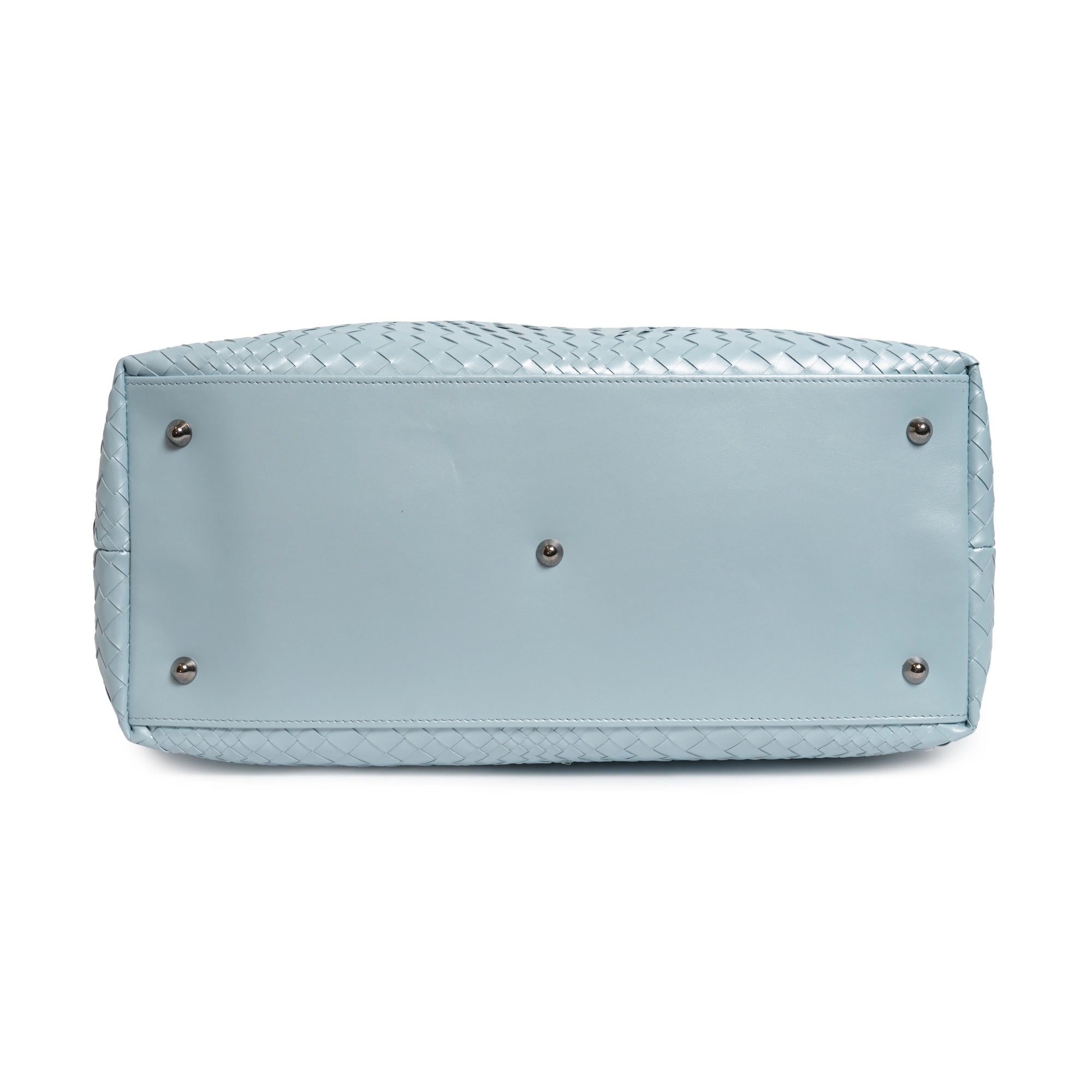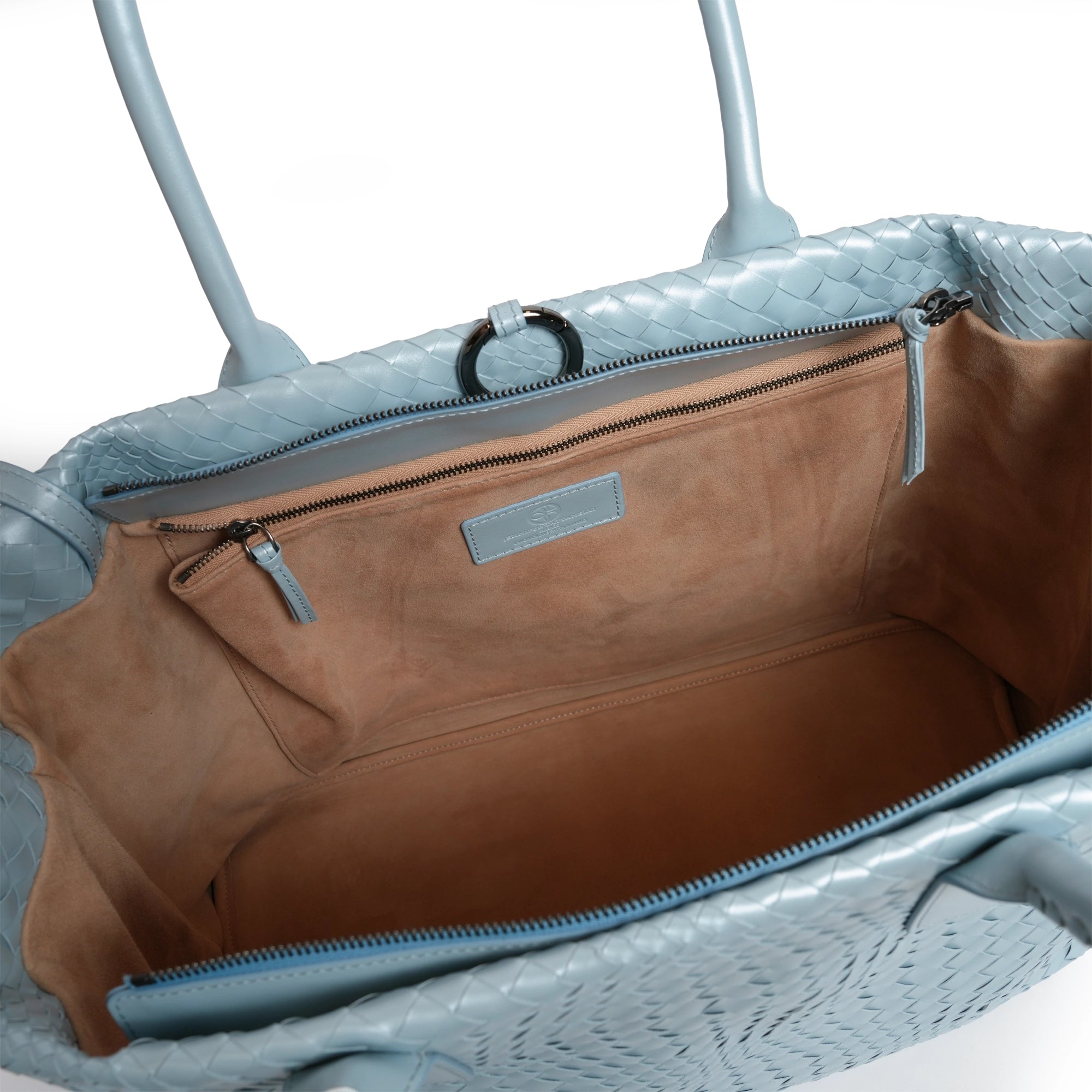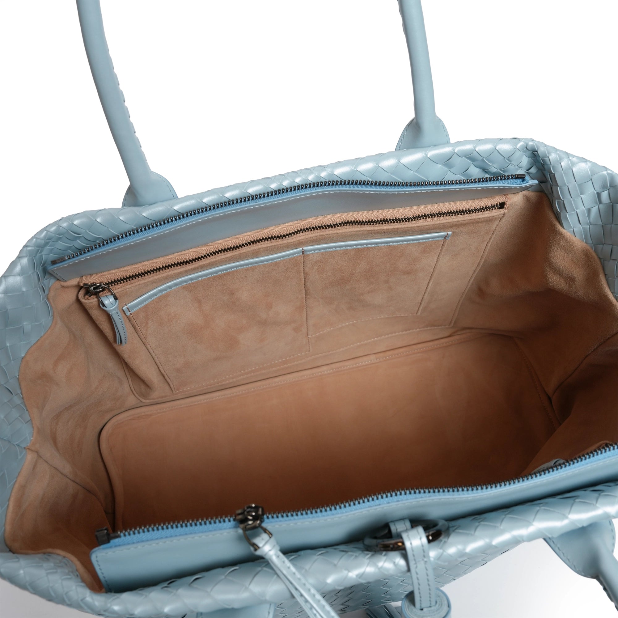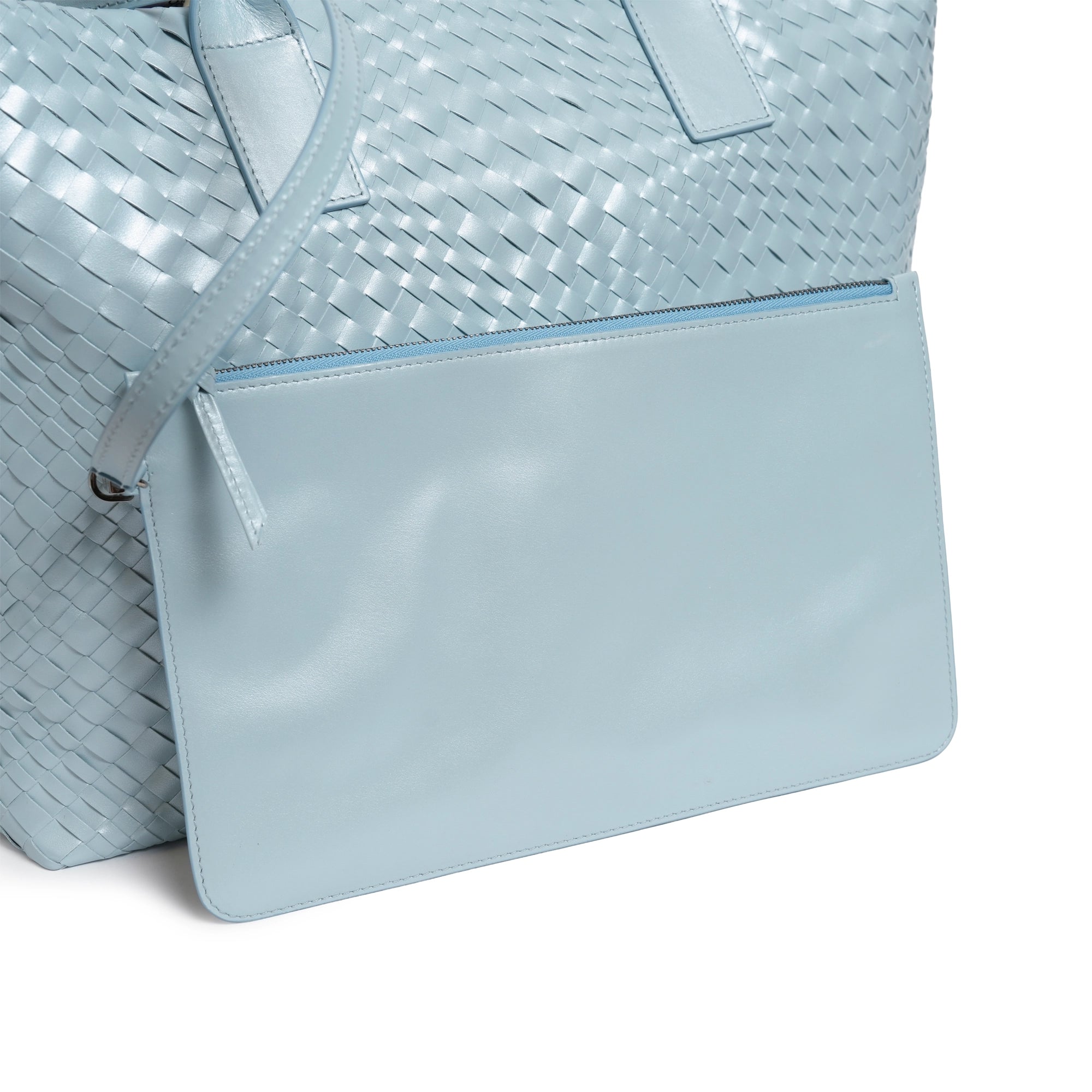 Make a statement of elegance and practicality with the Sophia Maxi Intrecciato Zippered Leather Tote Bag in Softy Pearlized Celeste.