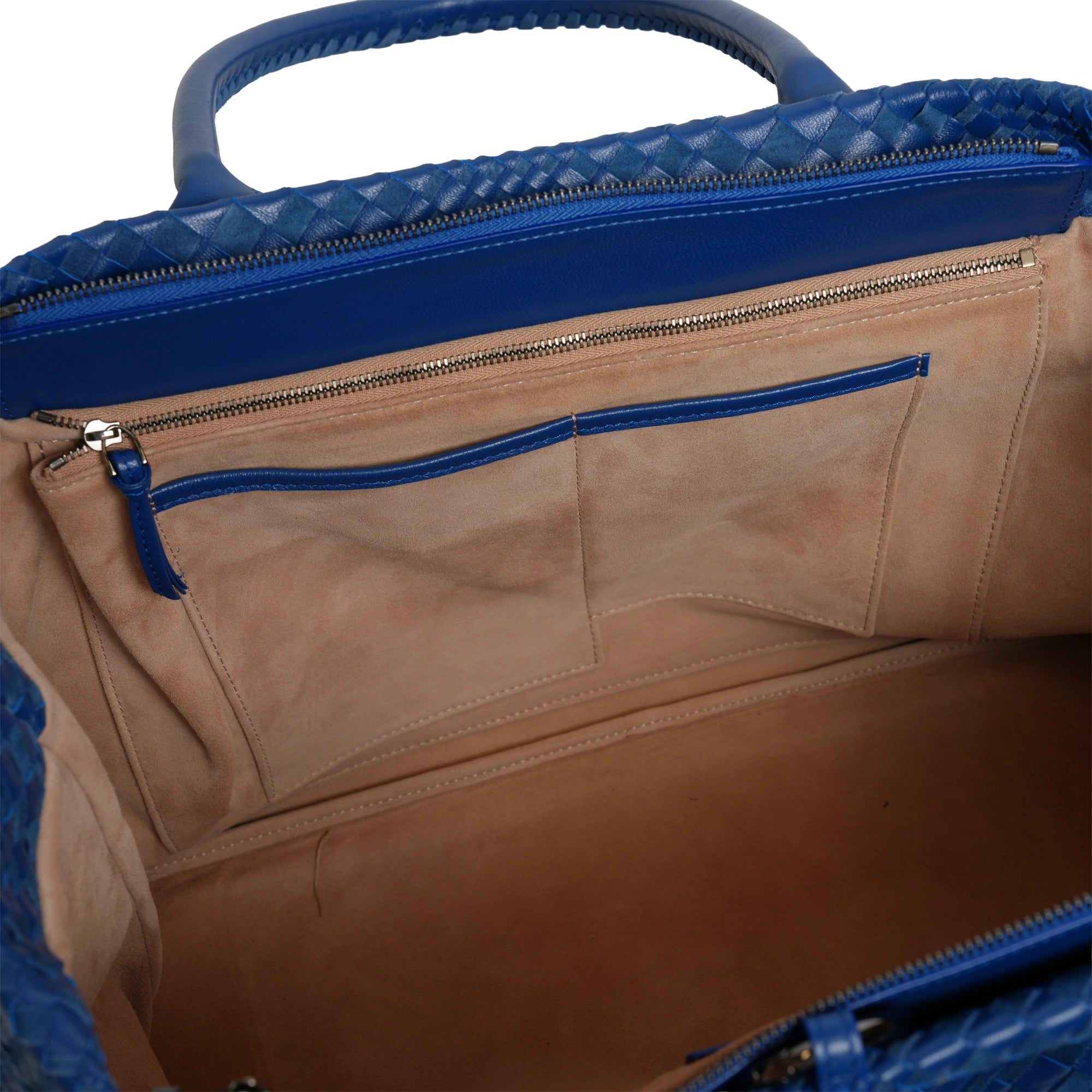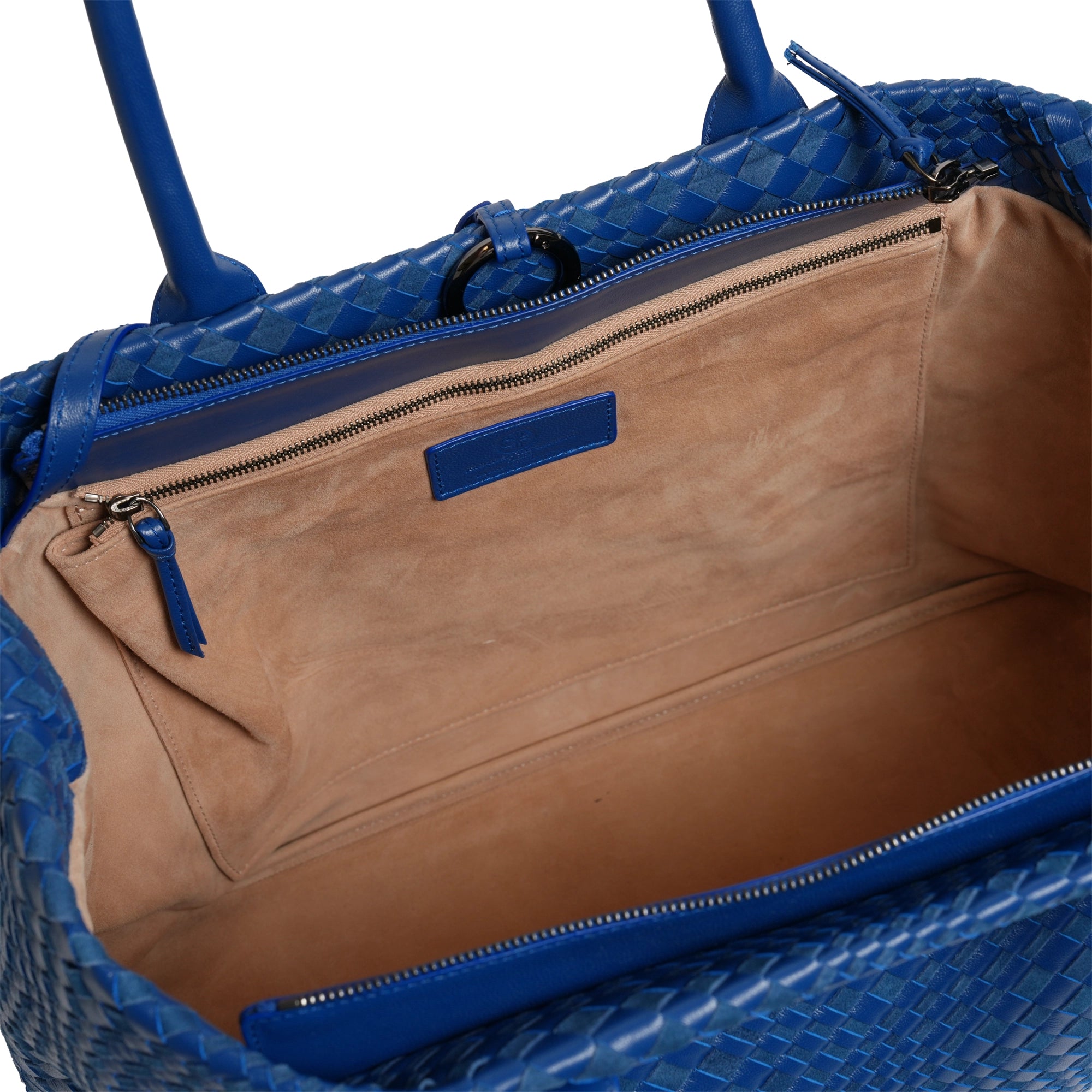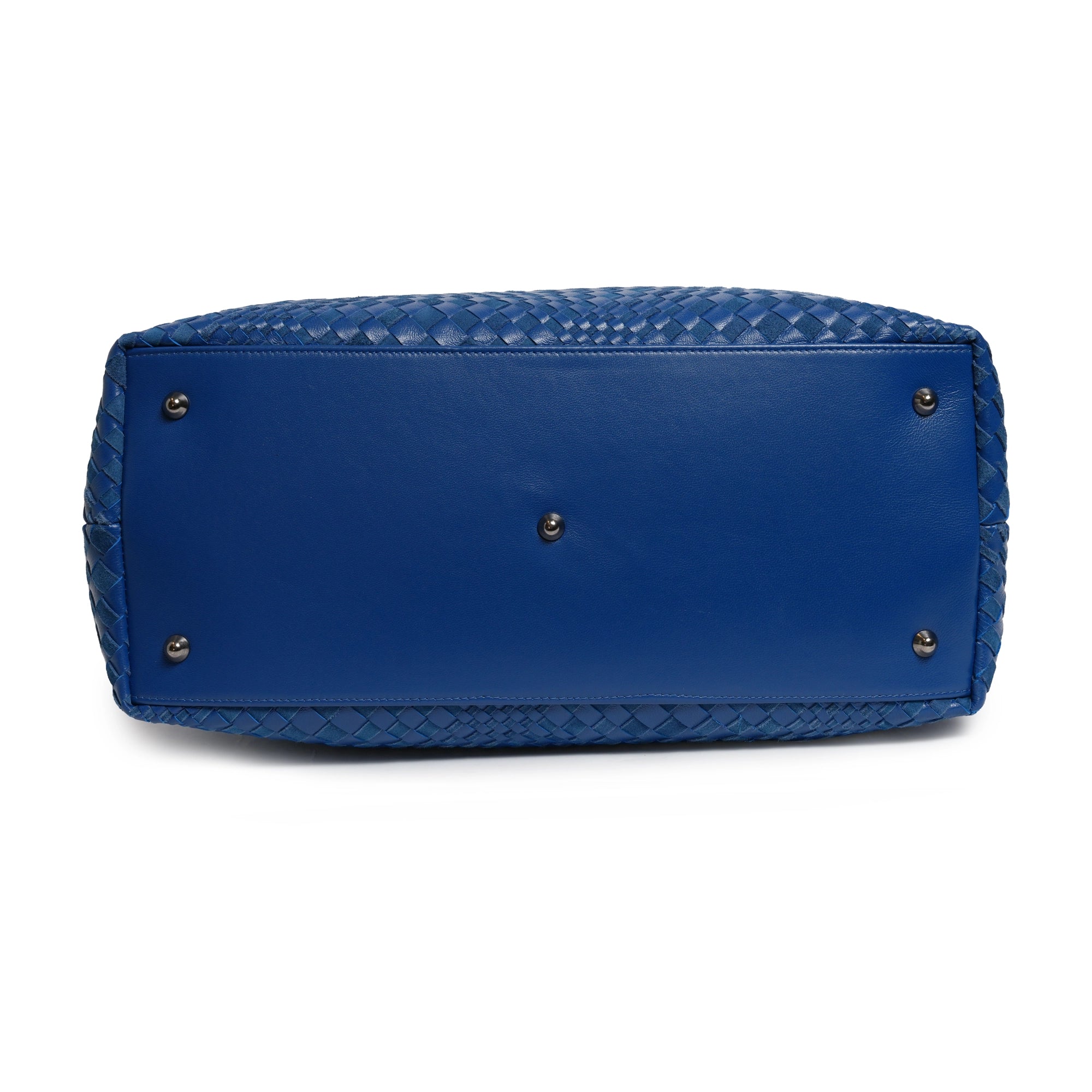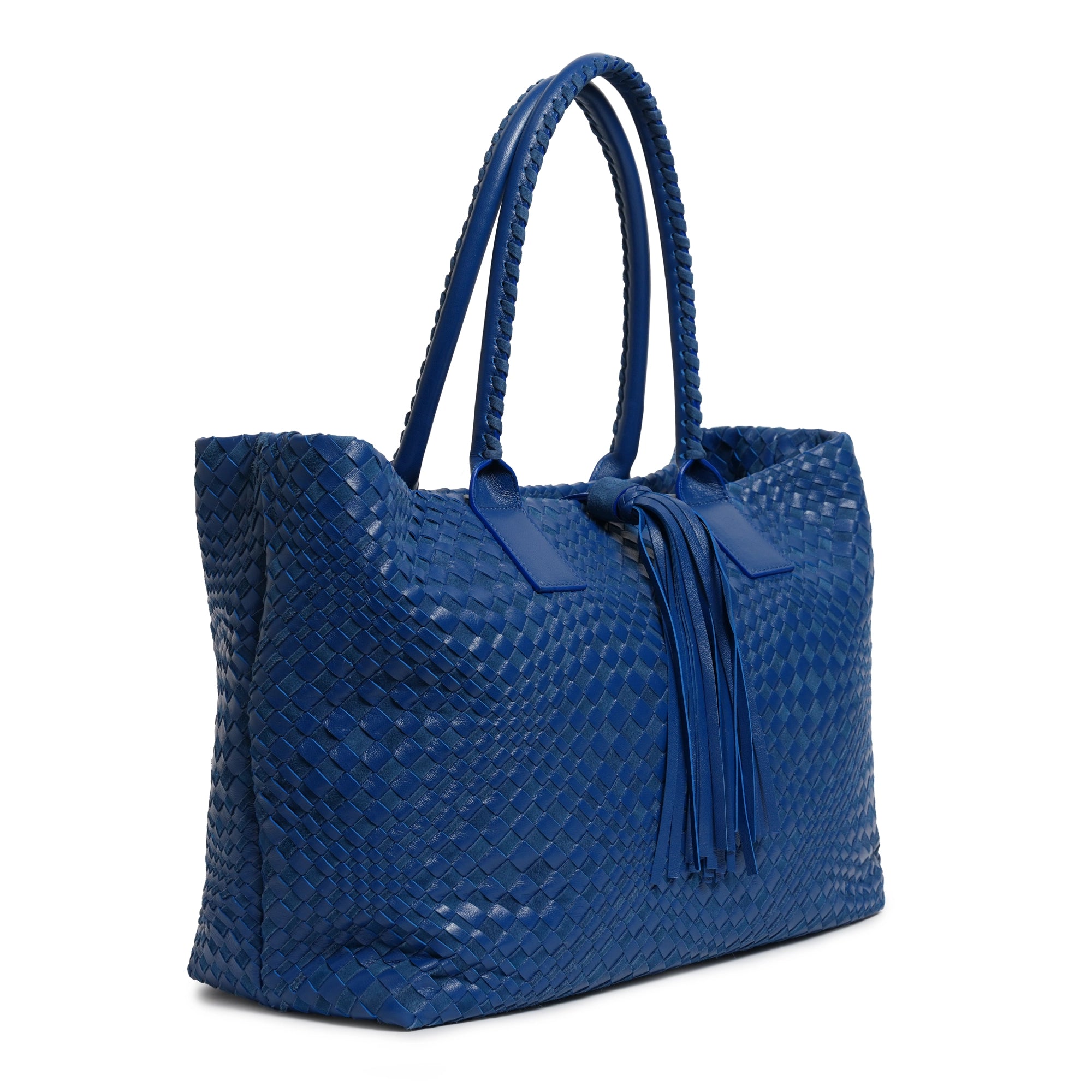 Make a statement of elegance and practicality with the Sophia Maxi Intrecciato Zippered Nappa and Patent Leather Tote Bag in Orizzonte (Infinite Blue).