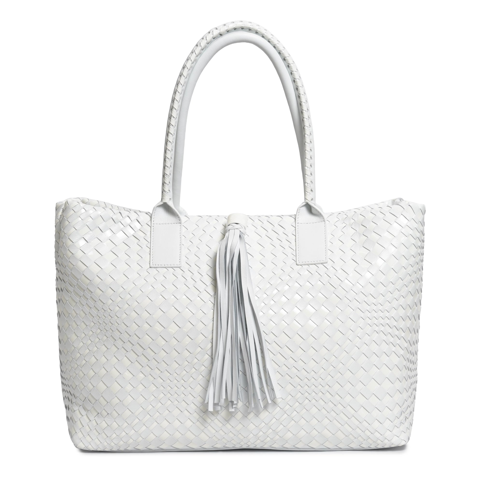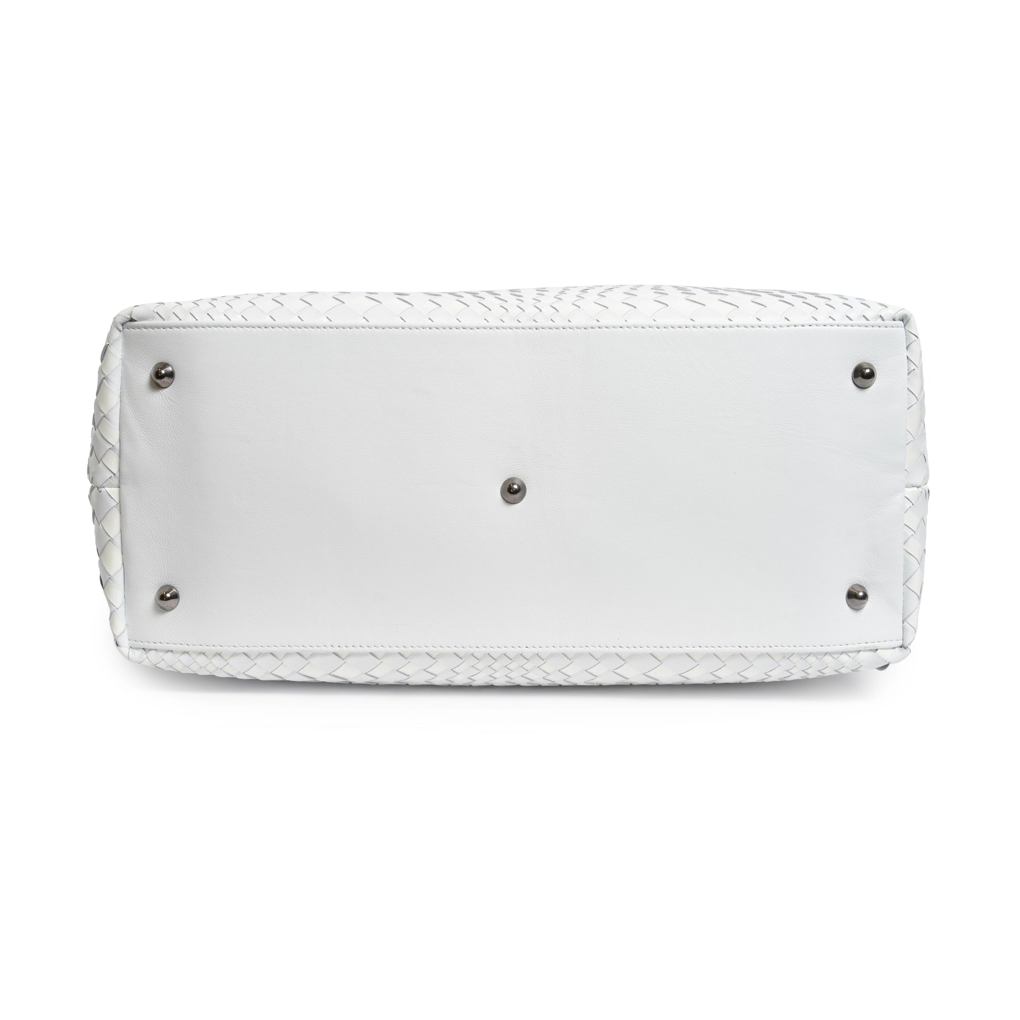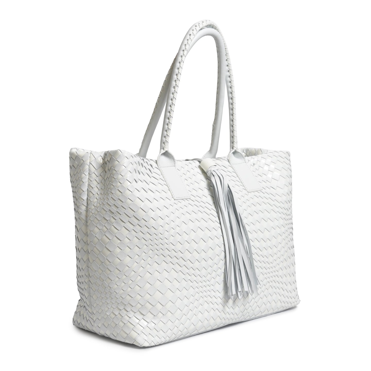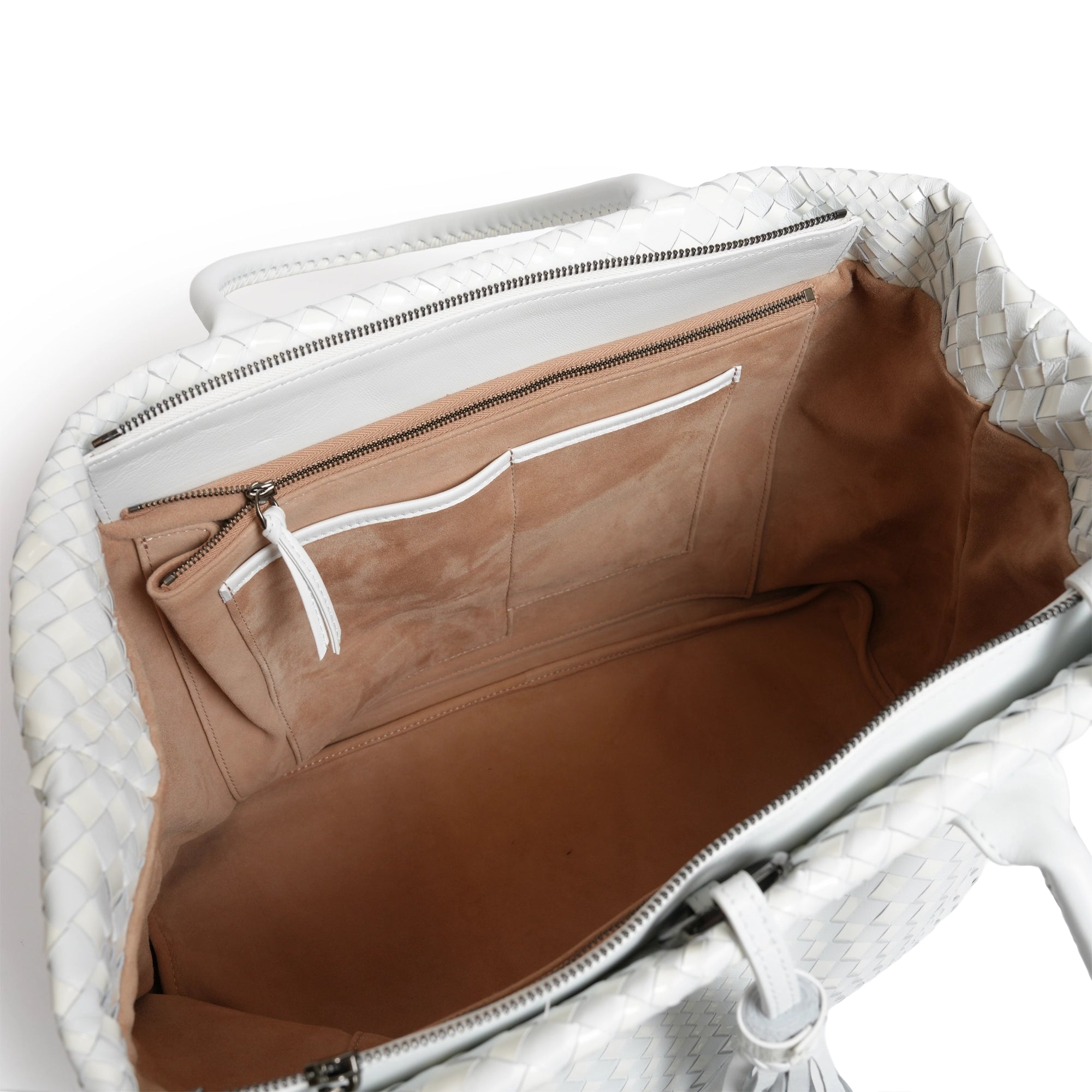 Make a statement of elegance and practicality with the Sophia Maxi Intrecciato Zippered Nappa and Patent Leather Tote Bag in White.