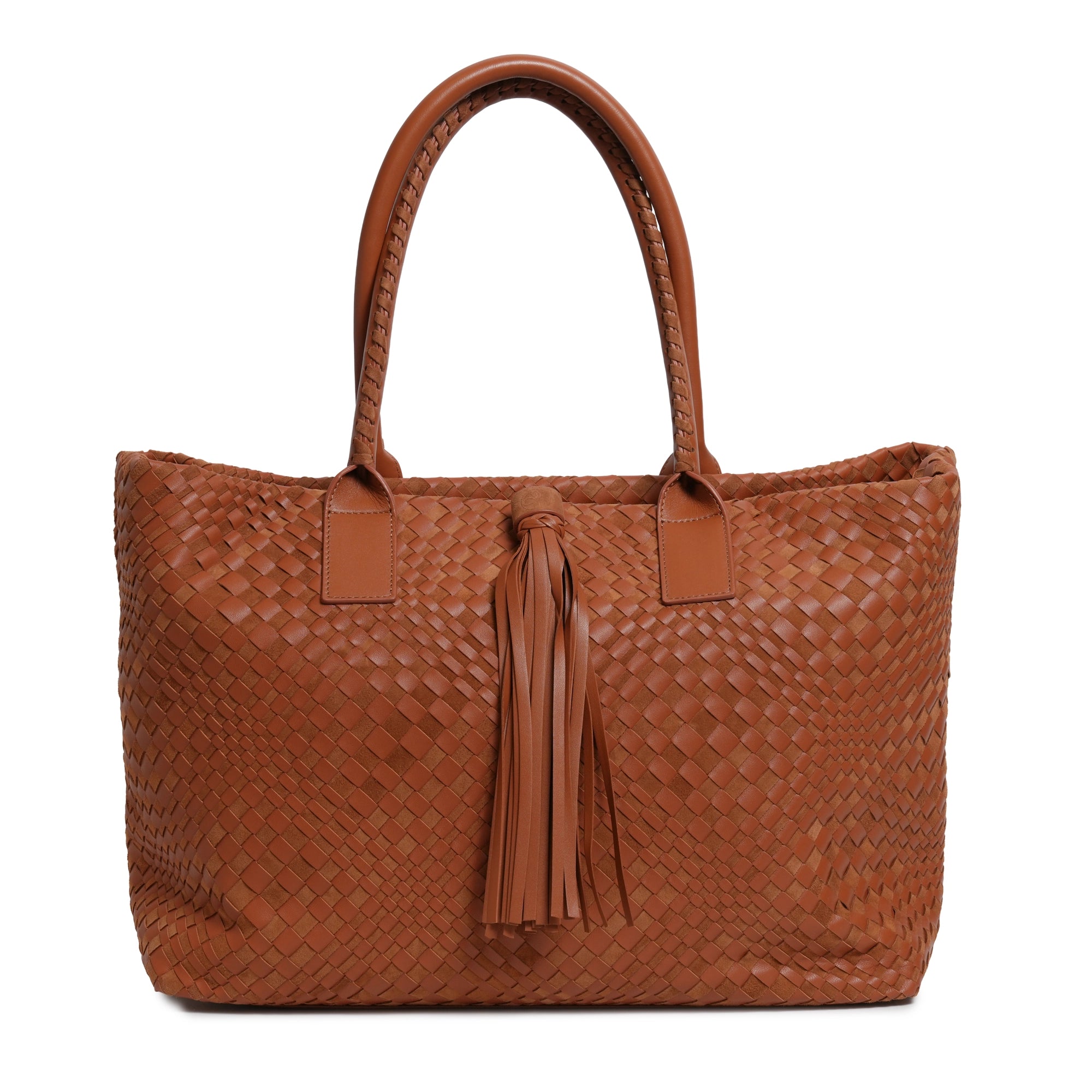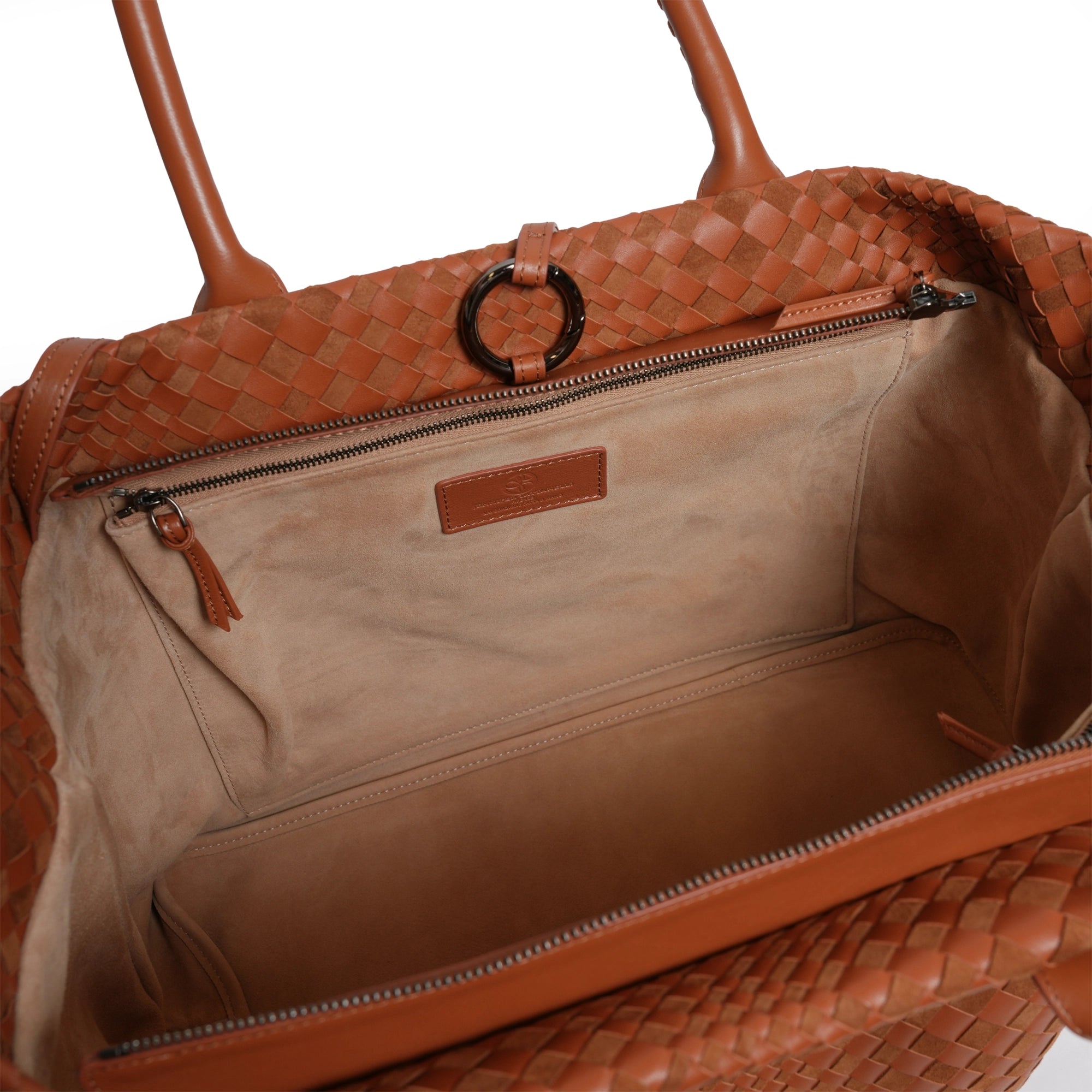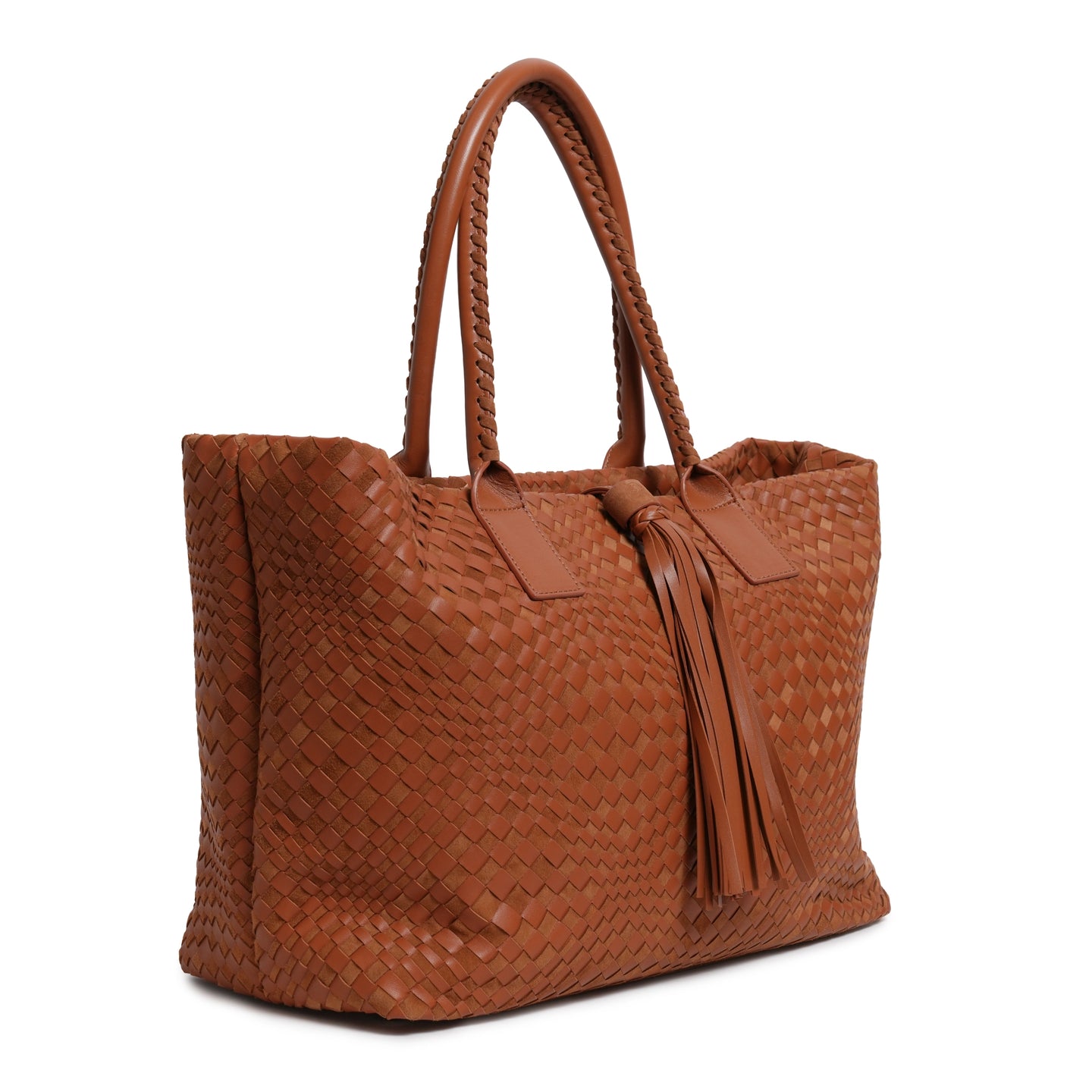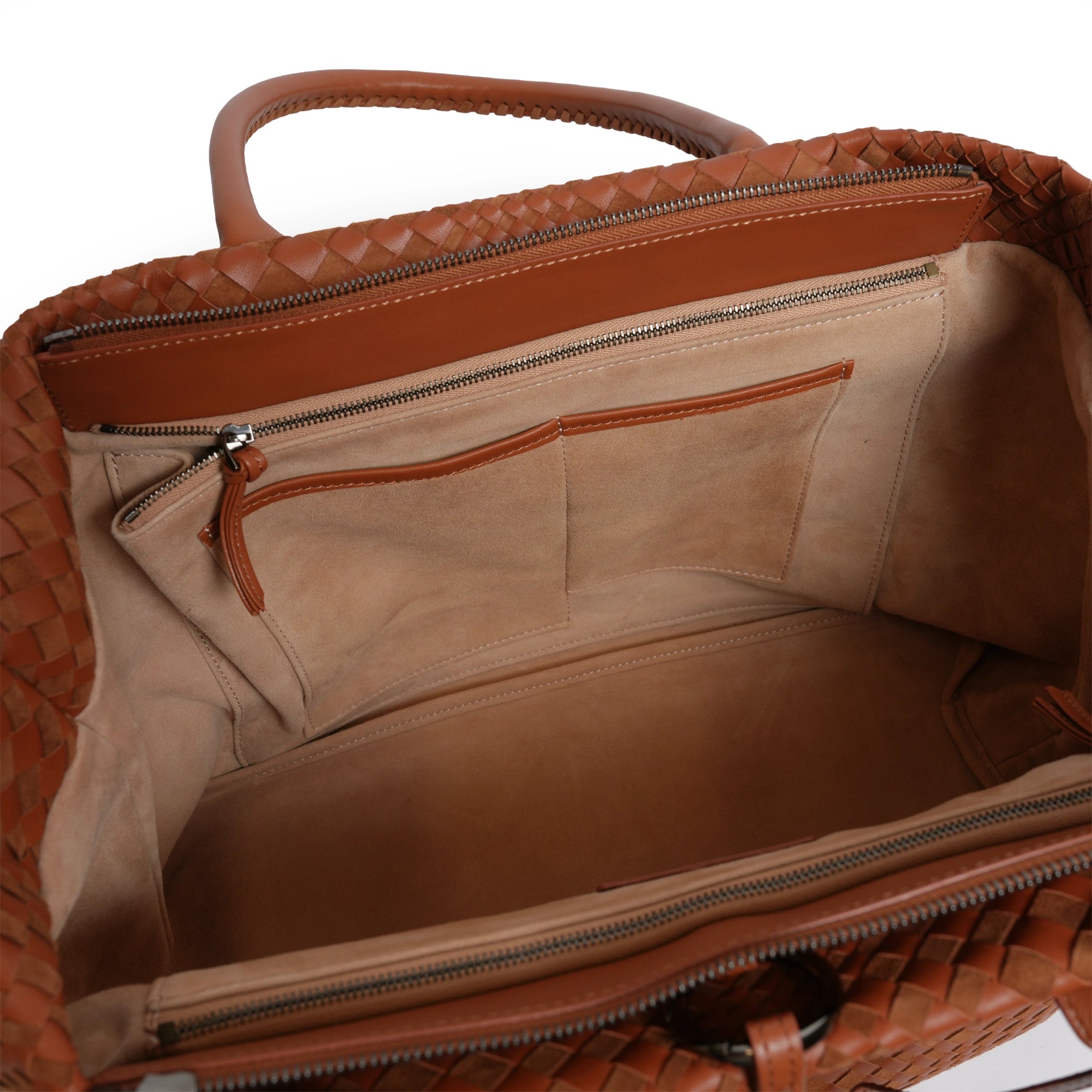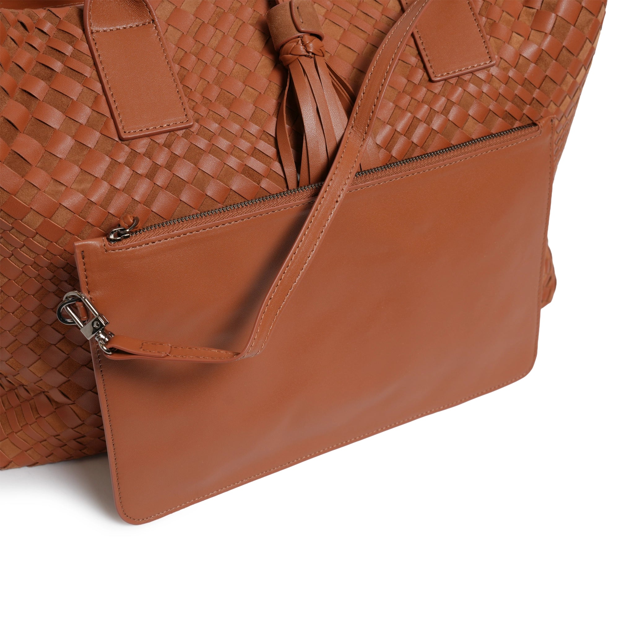 Make a statement of elegance and practicality with the Sophia Maxi Intrecciato Zippered Nappa and Suede Leather Tote Bag in Cuoio (Luggage Color).