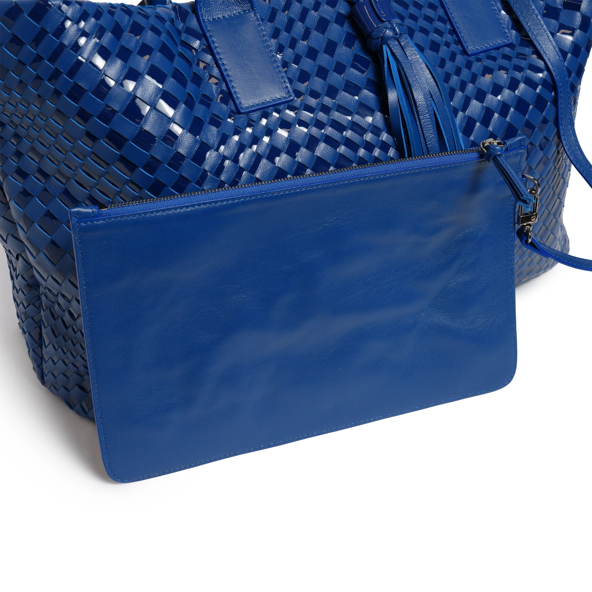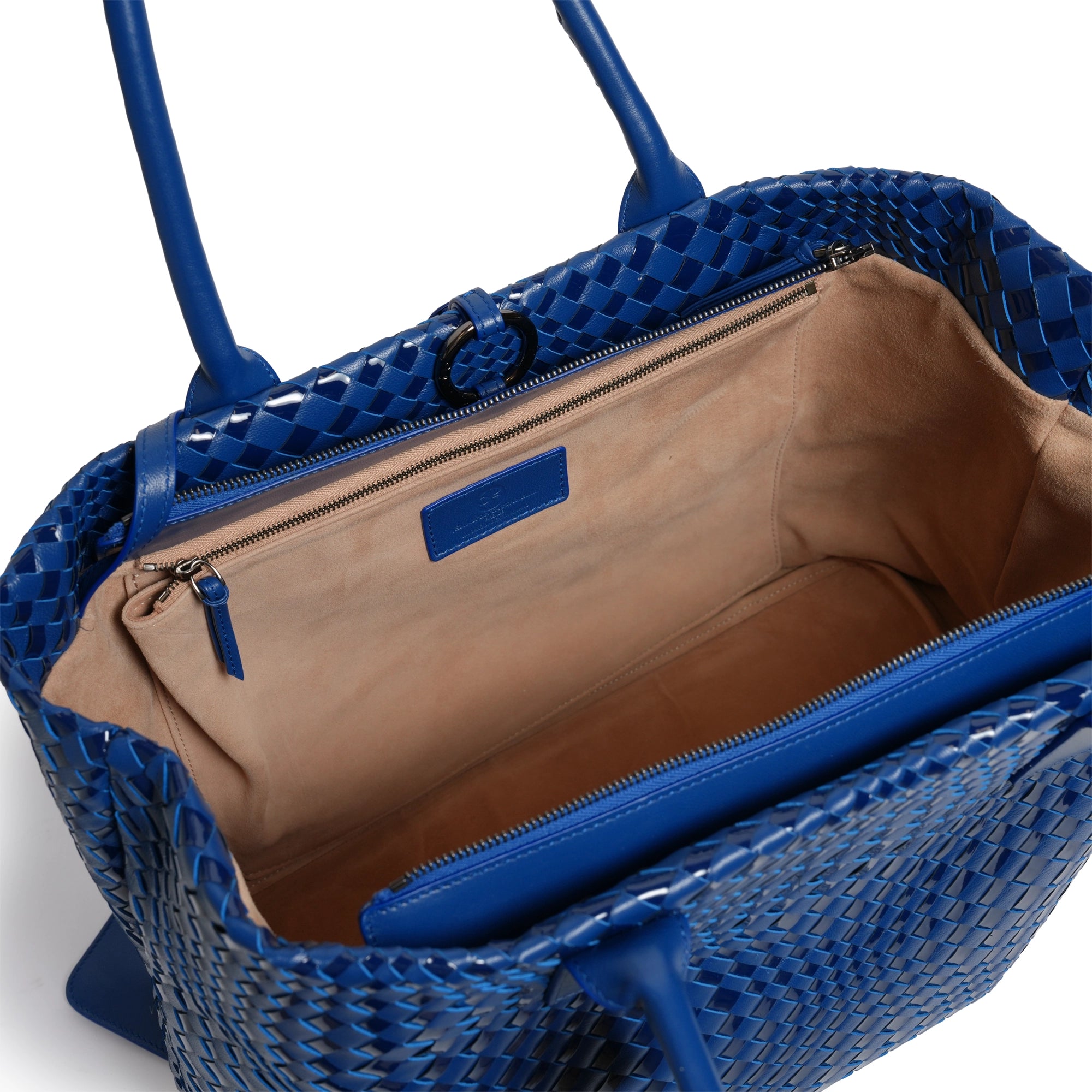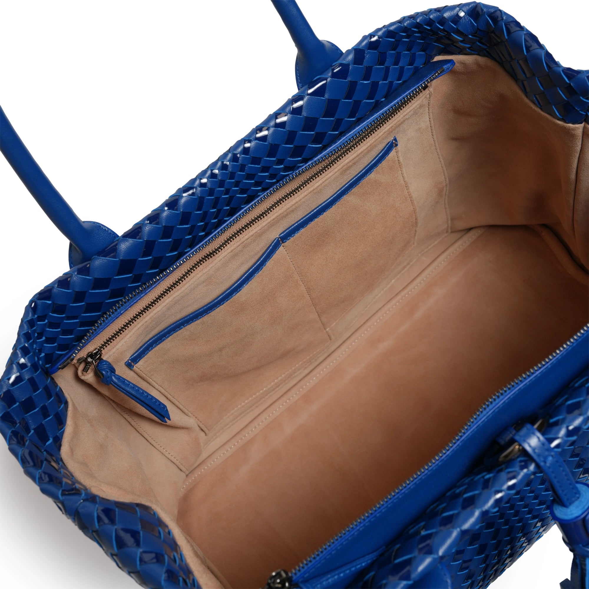 Make a statement of elegance and practicality with the Sophia Maxi Intrecciato Zippered Nappa and Suede Leather Tote Bag in Orizzonte (Infinite Blue).