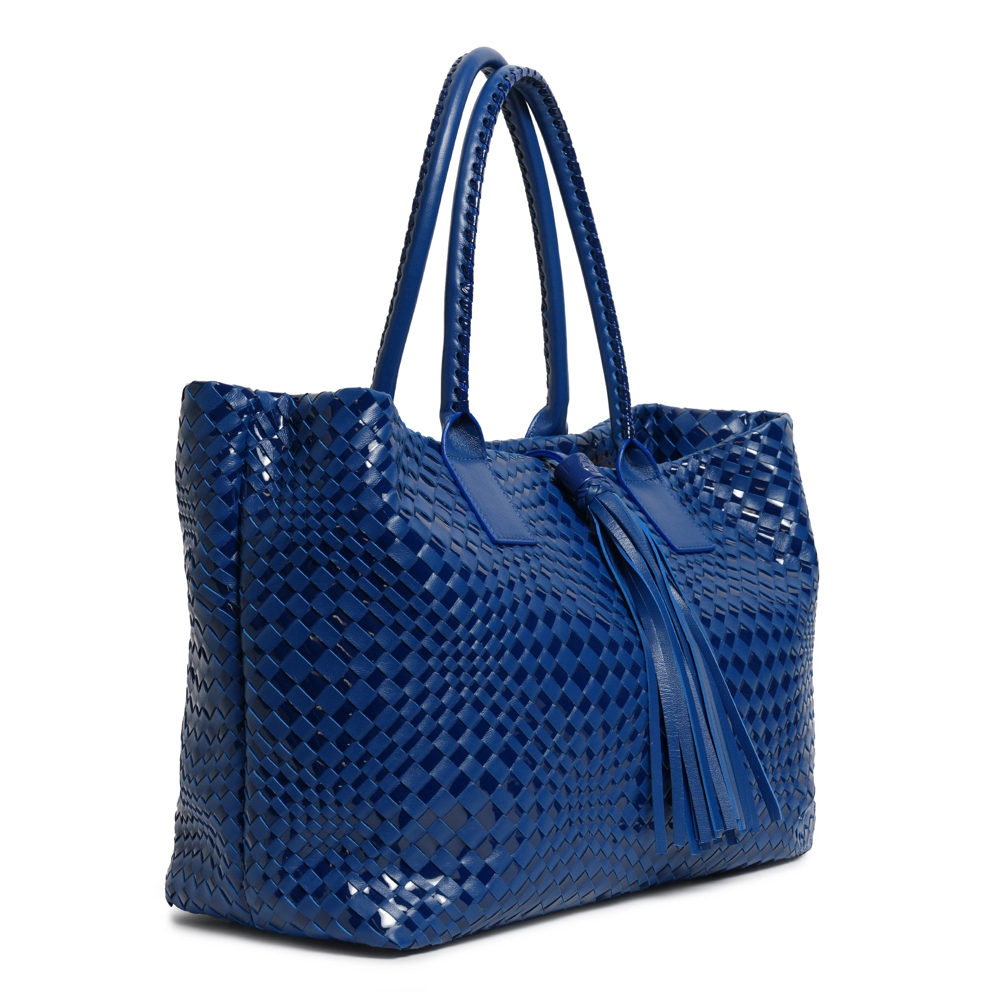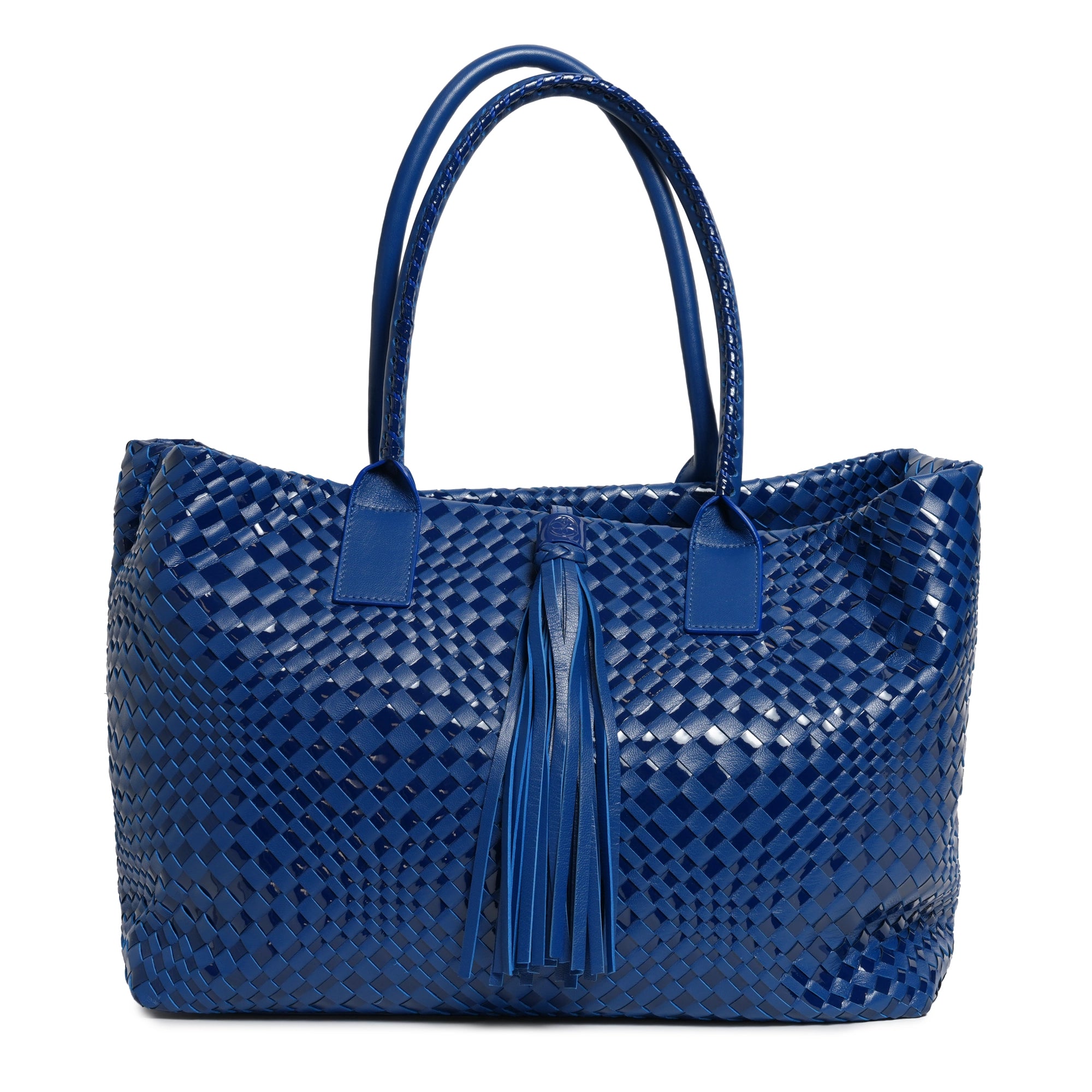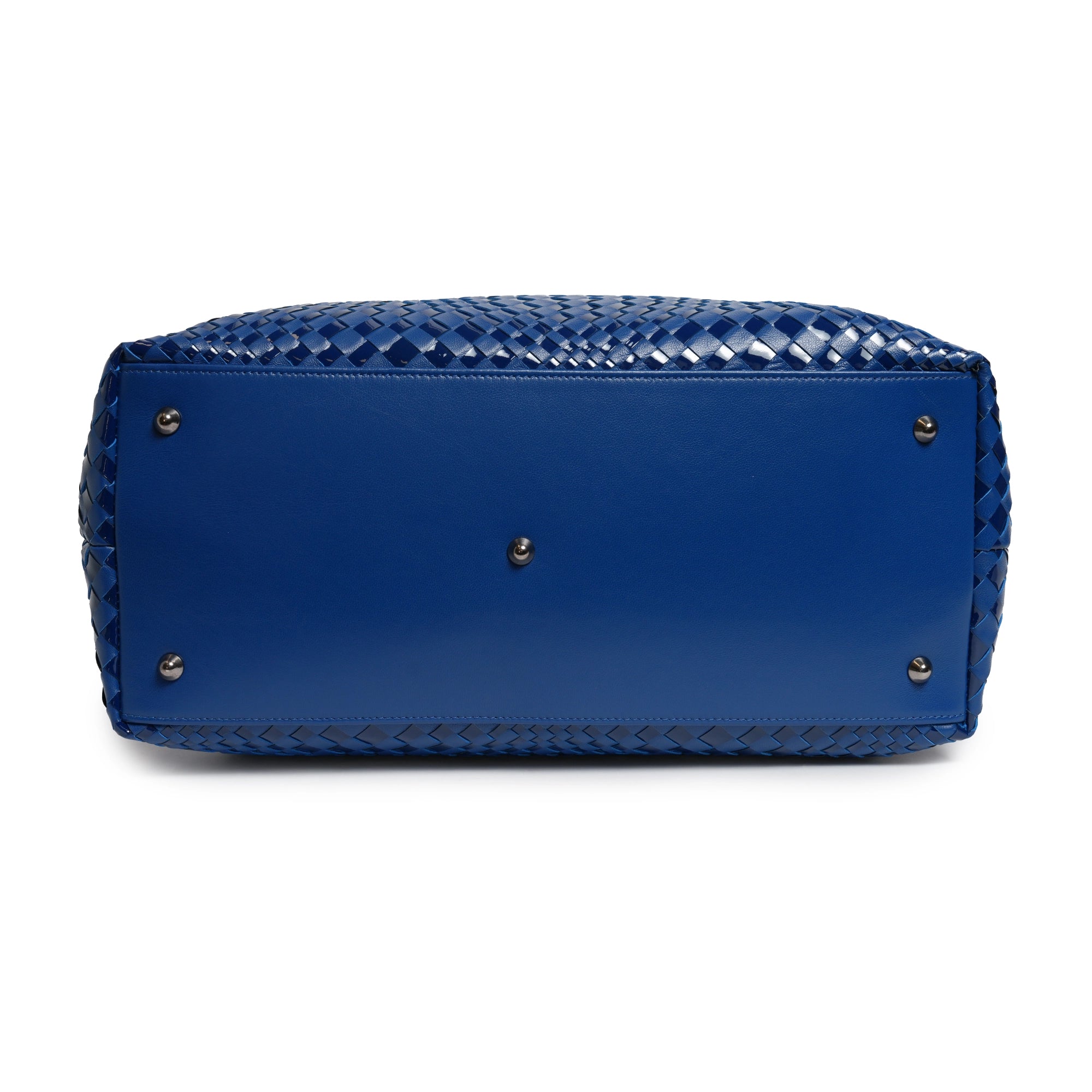 Make a statement of elegance and practicality with the Sophia Maxi Intrecciato Zippered Nappa and Suede Leather Tote Bag in Orizzonte (Infinite Blue).