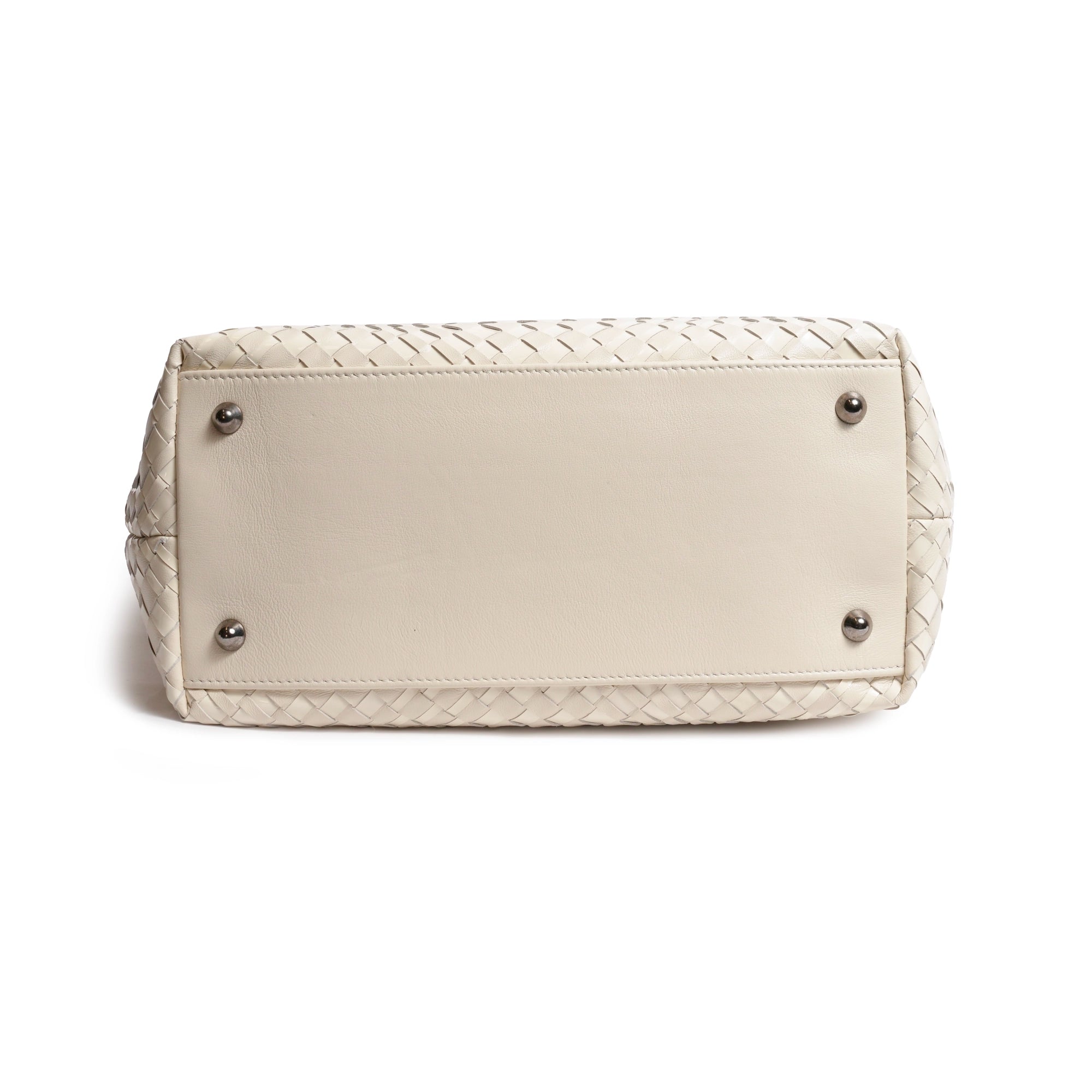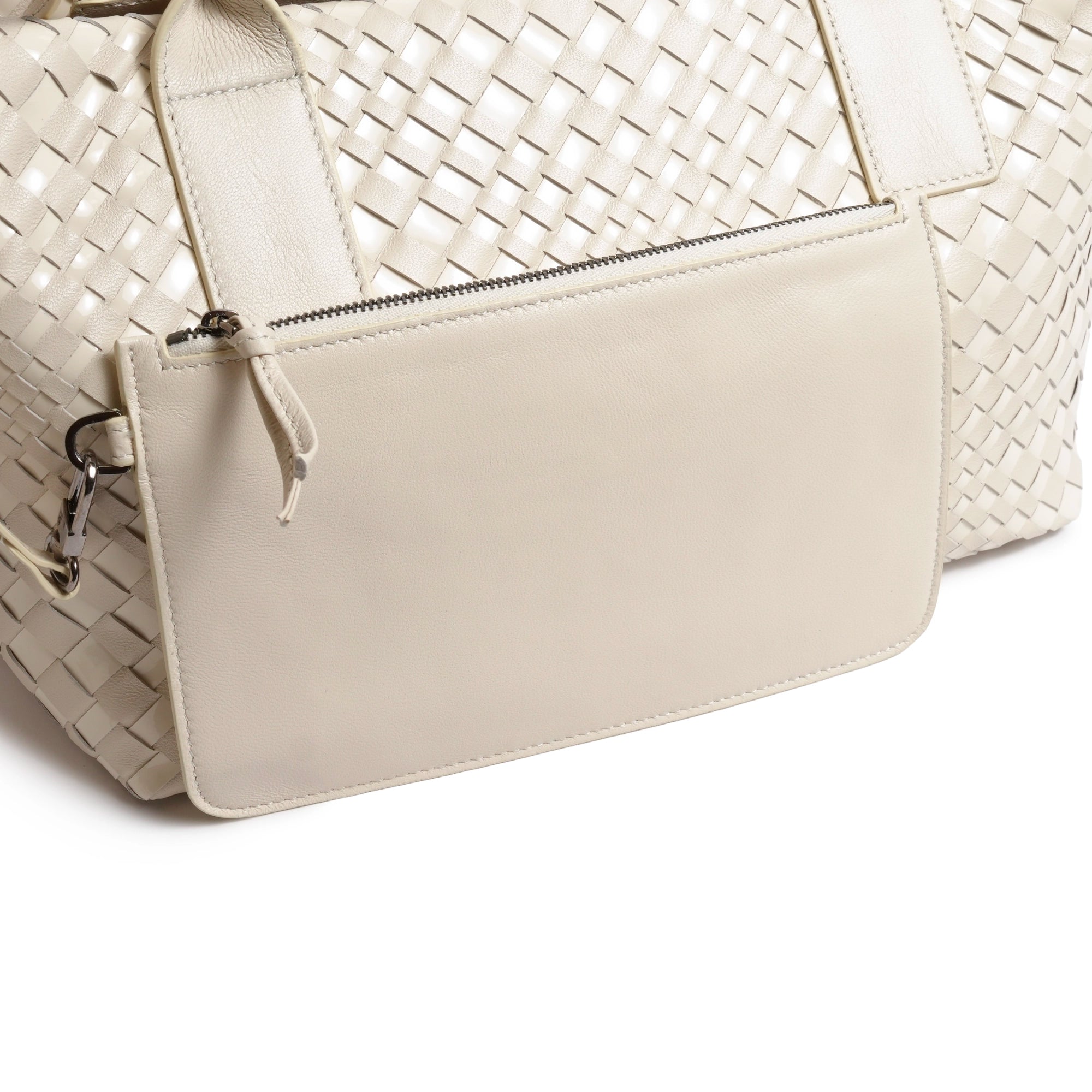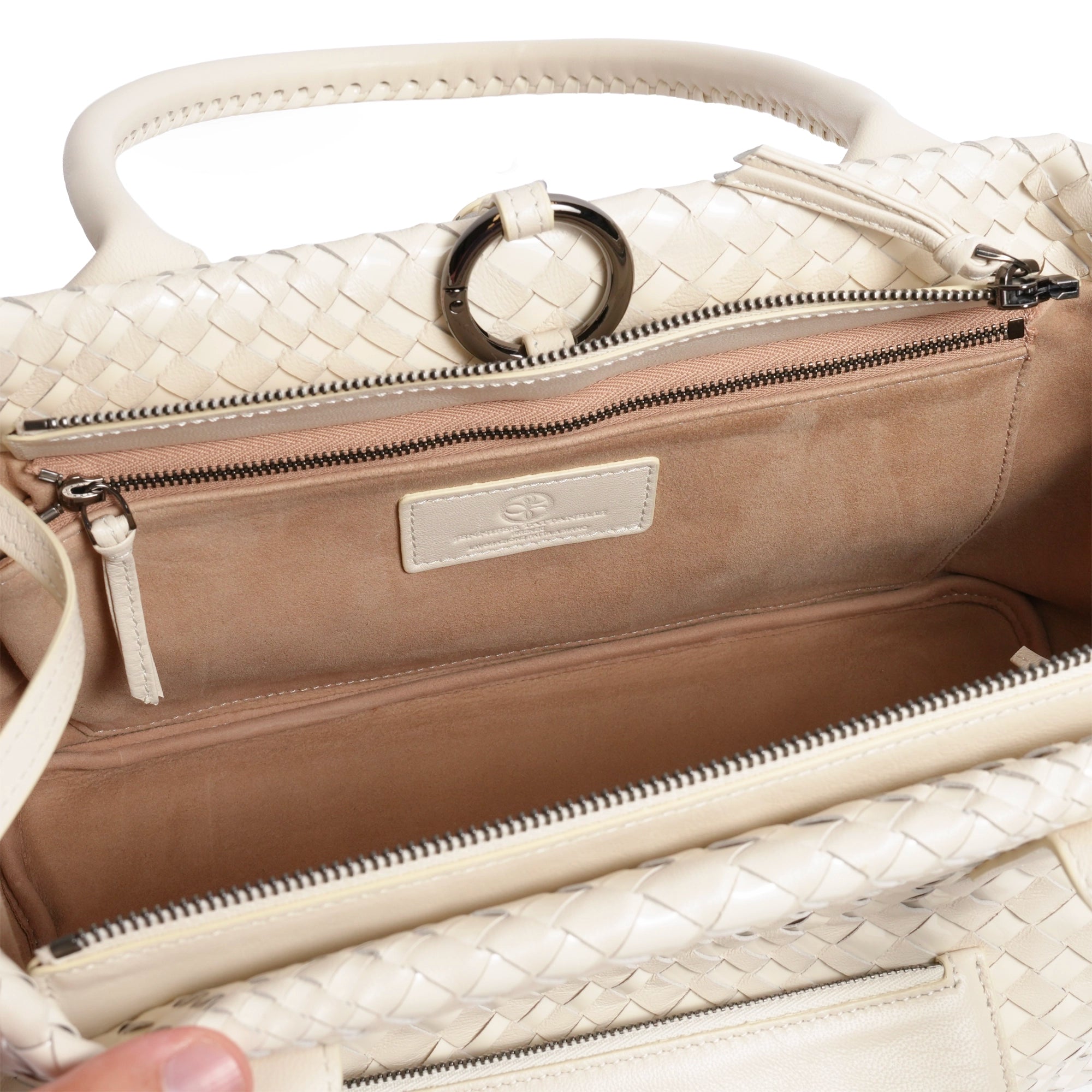 Discover refined luxury in the Sophia Petite Intrecciato Optical Zippered Shopping Bag in Nappa and Patent Ivory.