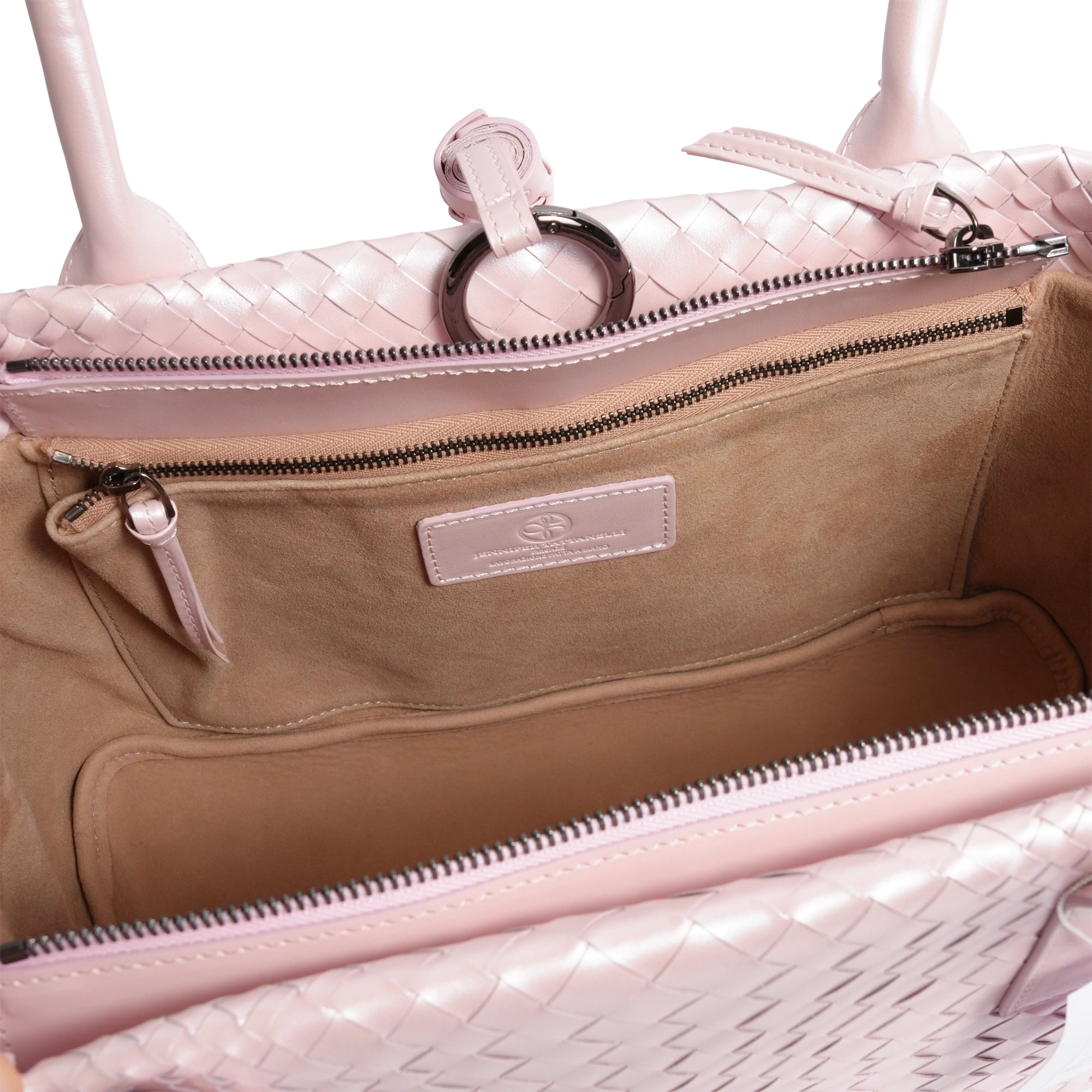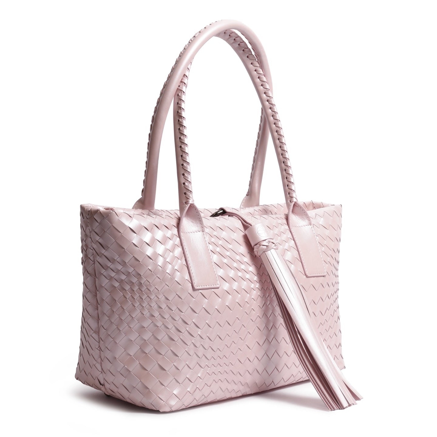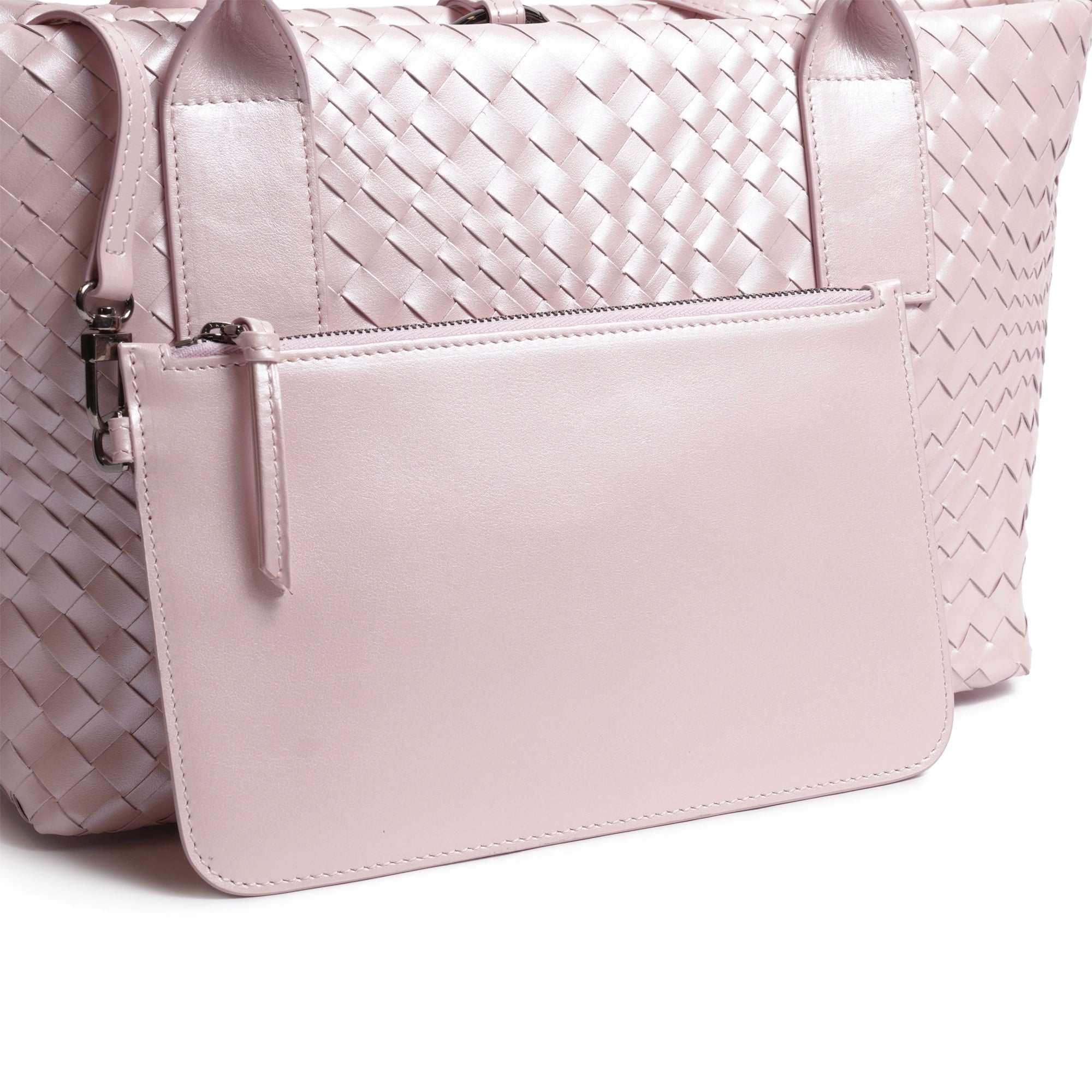 Discover refined luxury in the Sophia Petite Intrecciato Optical Zippered Shopping Bag in Pearlized Pink.