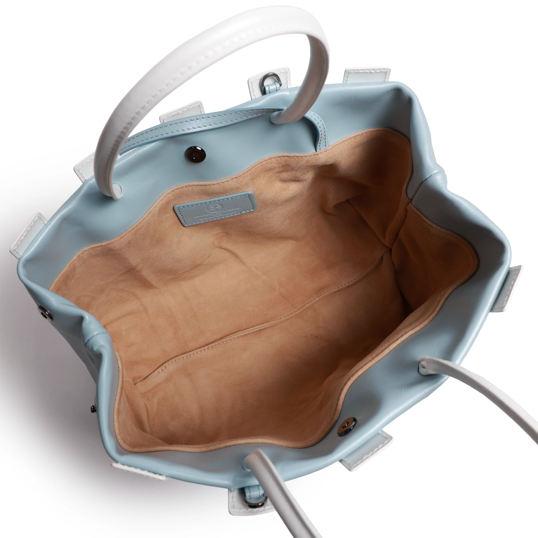 Meet your new essential: the "Stripes" Large Shopping Bag in Cielo and White Softy Leather, where utility meets understated elegance. Designed for those who carry more — and carry it well — this spacious tote features a durable large body, elevated with smooth leather stripe detailing for a clean, timeless look.