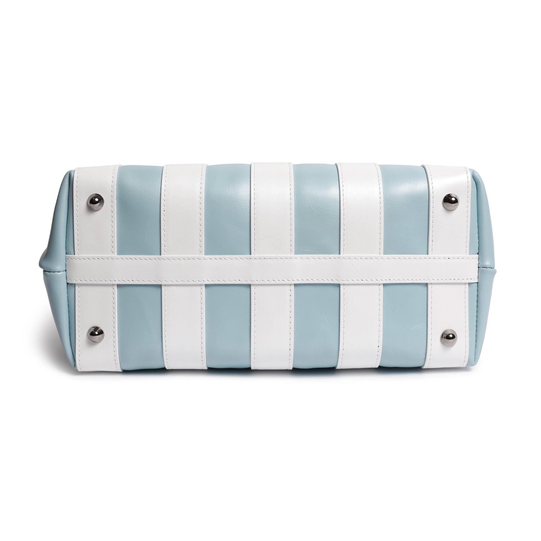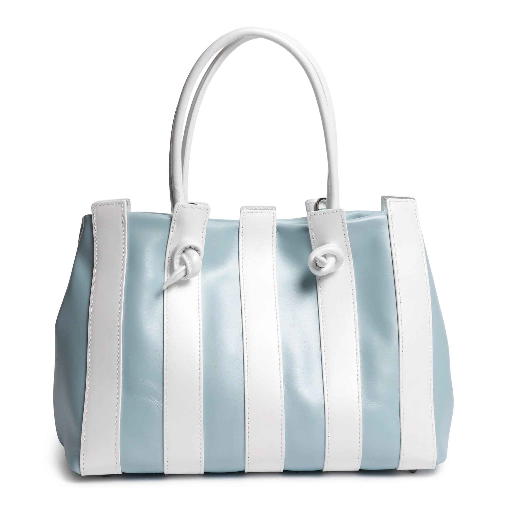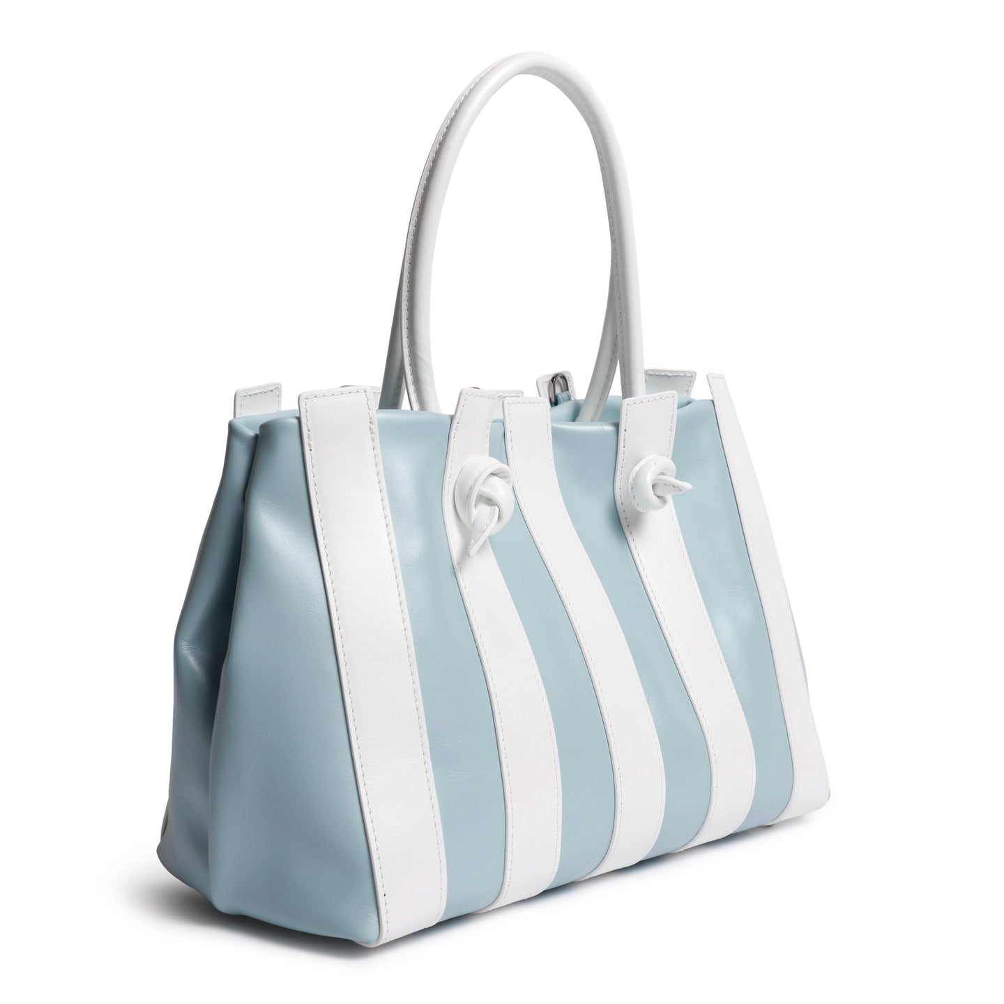 Stripes Large Leather Shopping Bag in Cielo and White Softy Pearlized Leather