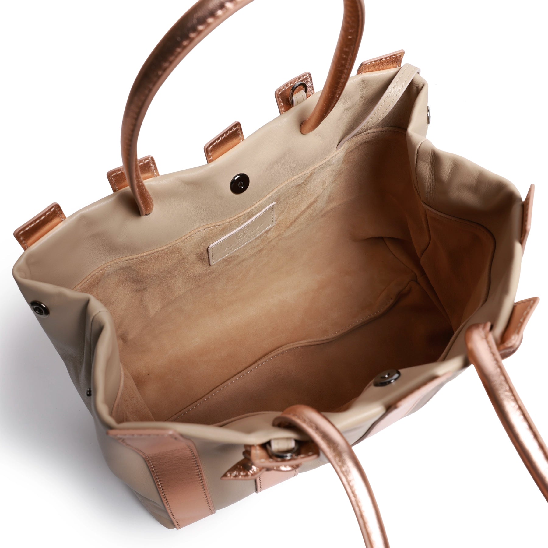 Meet your new essential: the "Stripes" Large Shopping Bag in Nappa Caffellatte and Rose Gold Leather, where utility meets understated elegance. Designed for those who carry more — and carry it well — this spacious tote features a durable large body, elevated with smooth leather stripe detailing for a clean, timeless look.