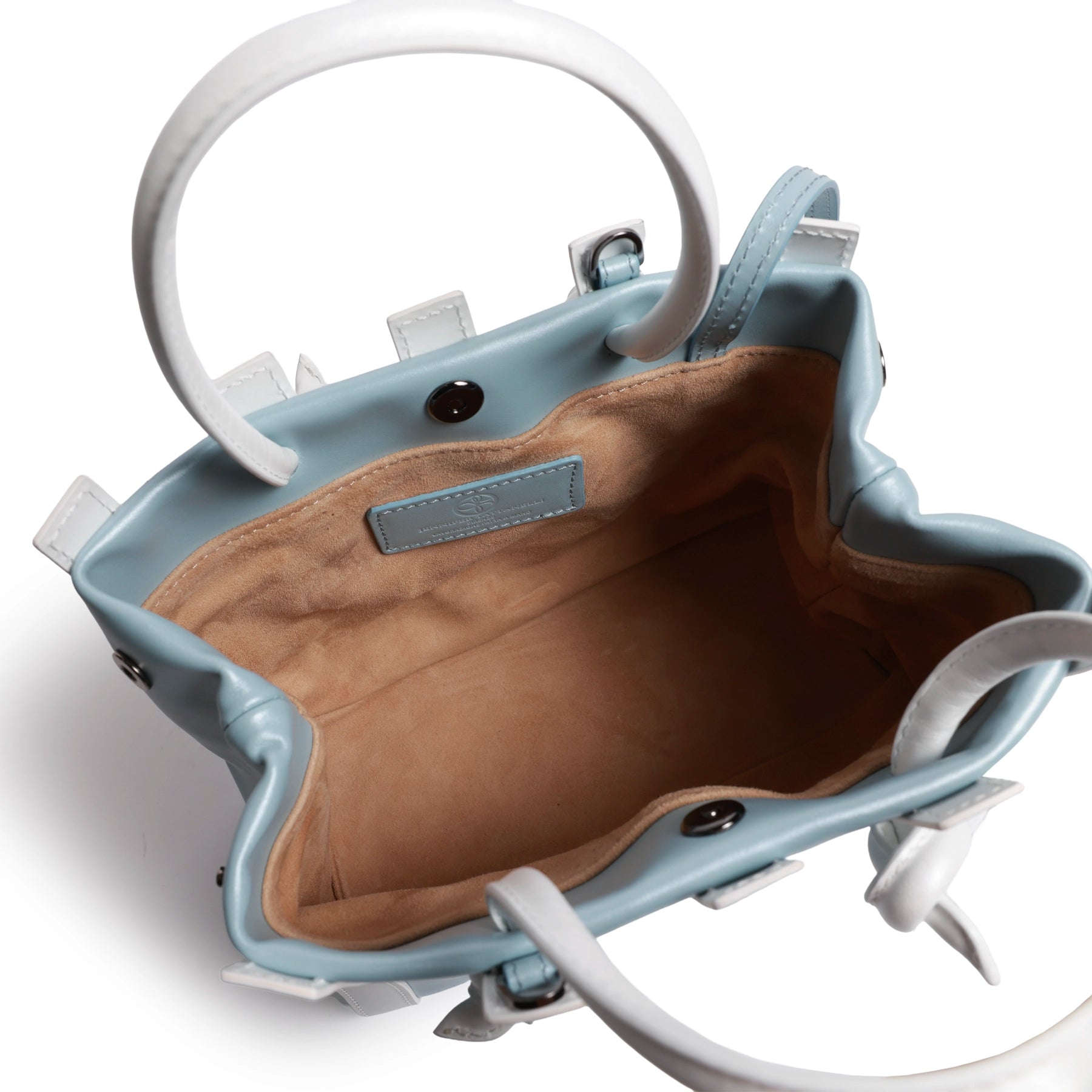 Meet your new essential: the Medium Shopping Bag in Softy Cielo and White Leather, where utility meets understated elegance. Designed for those who carry more — and carry it well — this spacious tote features a structured body, elevated with smooth leather stripe detailing for a clean, timeless look.