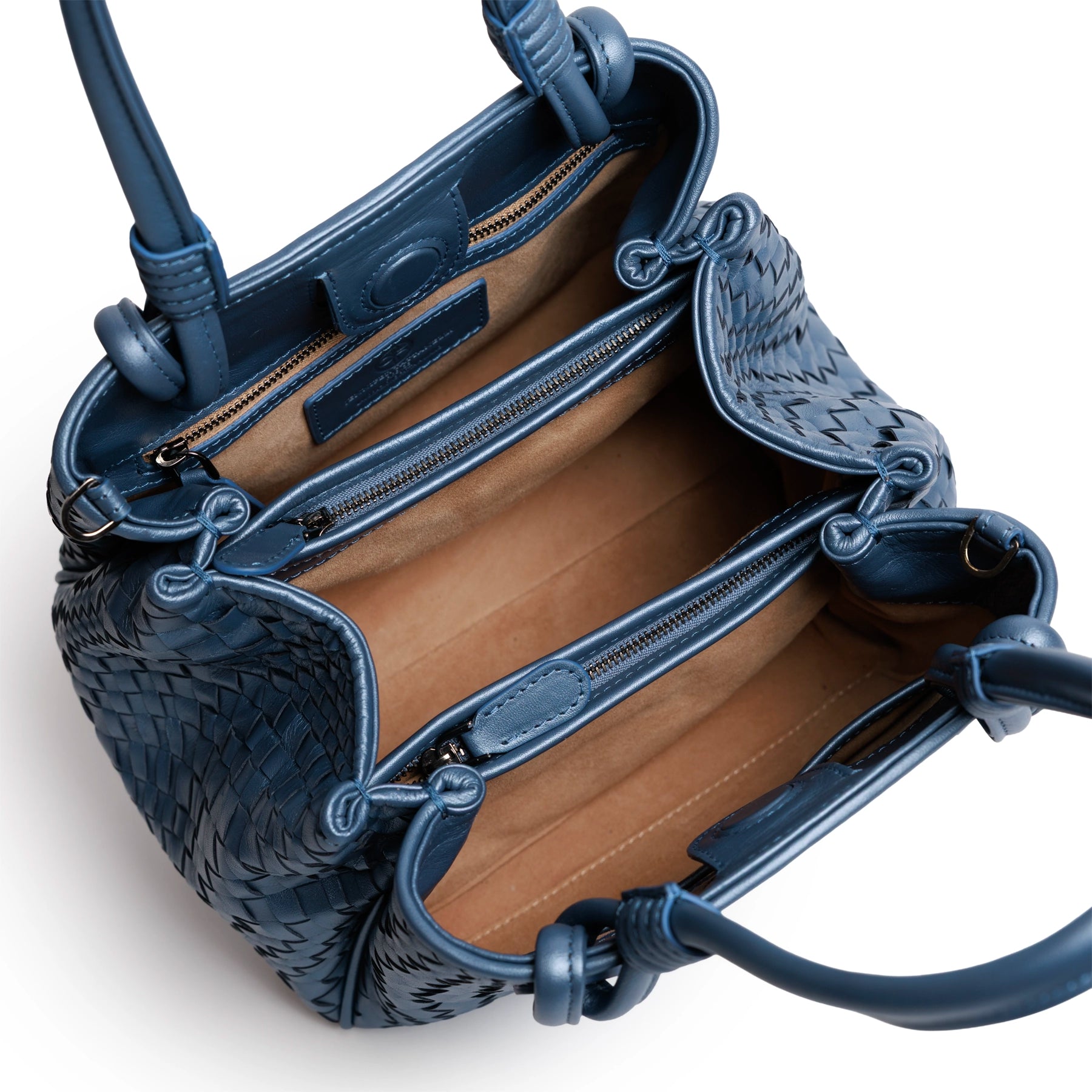 The Top Handle Intrecciato Leather Bag in Softy Pearlized Baltico is a refined expression of Italian craftsmanship, where texture and light come together in a sophisticated, modern silhouette. Crafted in Italy from supple nappa leather, the bag features a meticulously handwoven intrecciato construction that creates depth and movement across its surface.