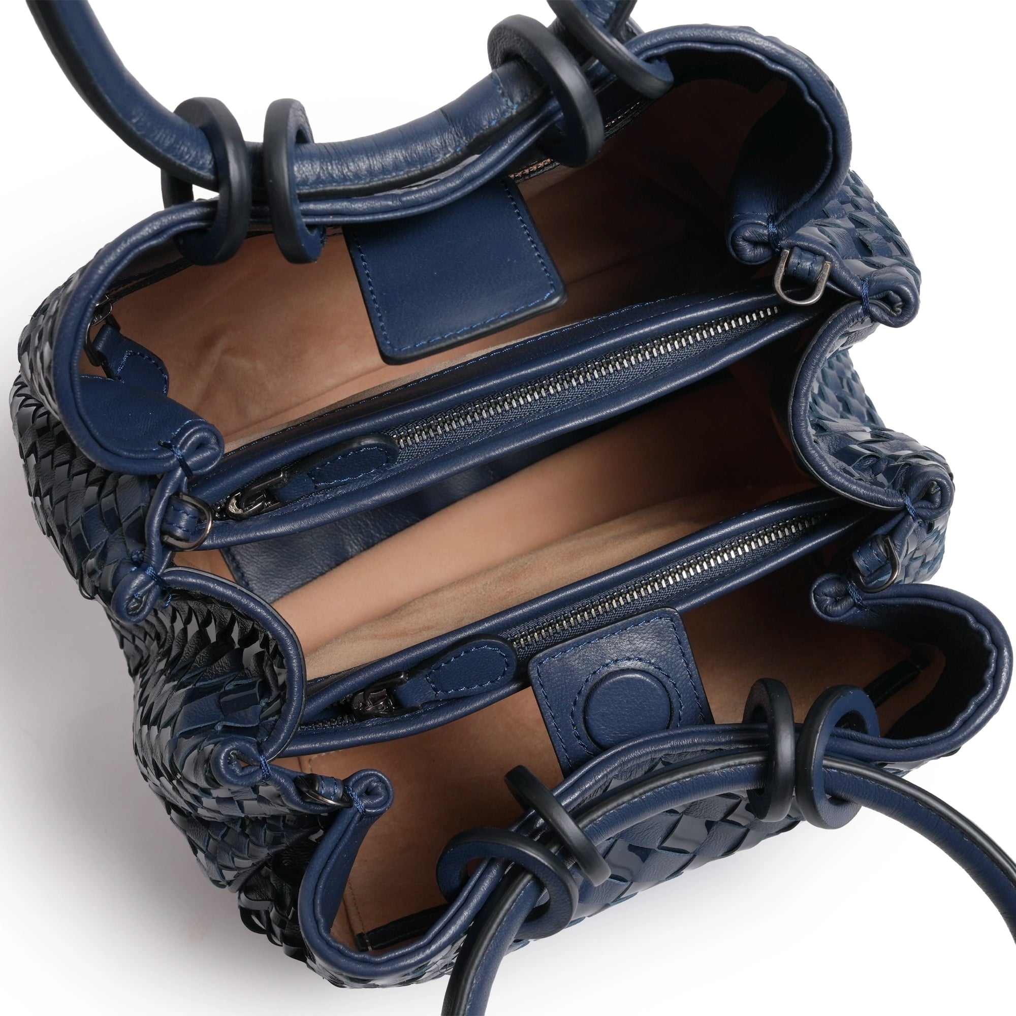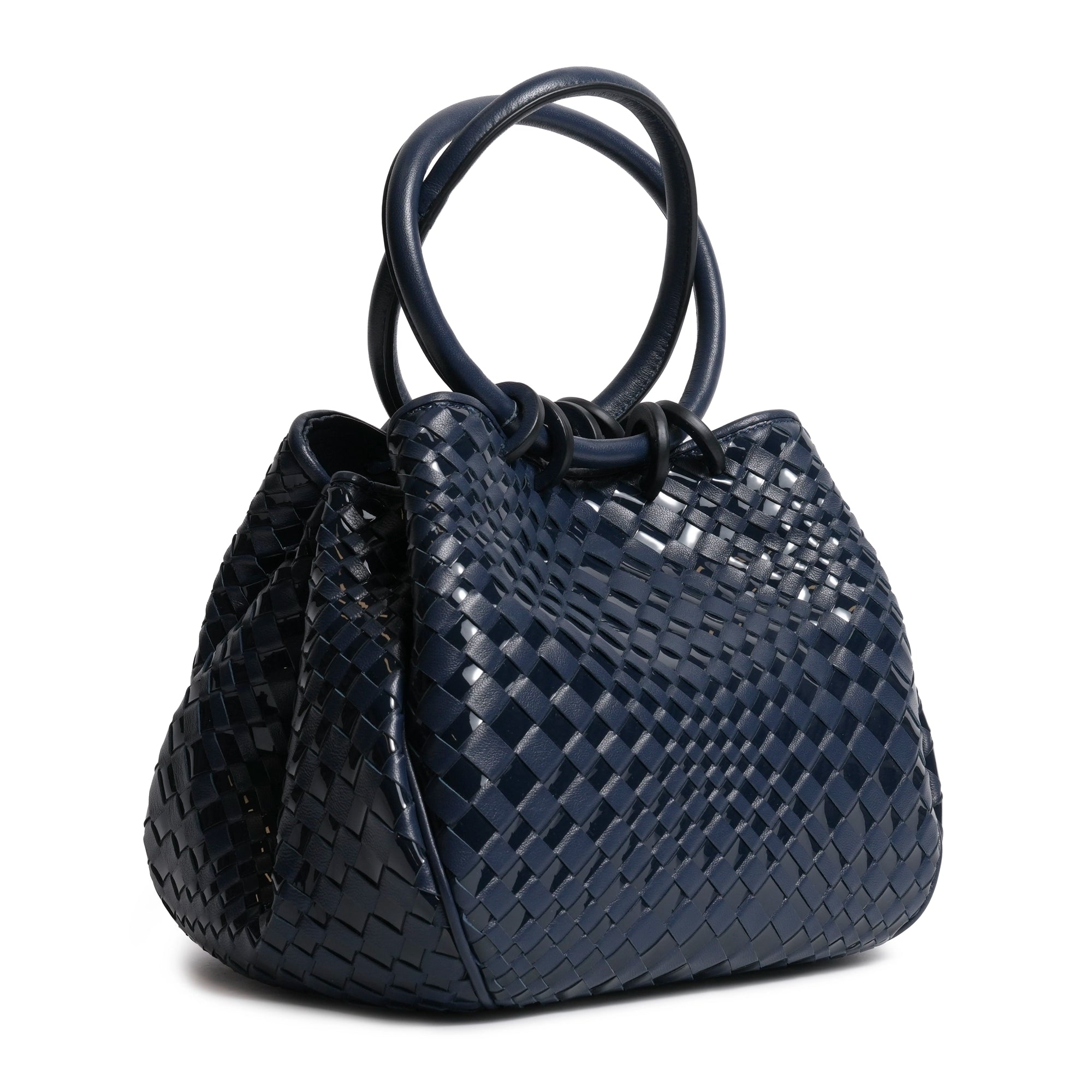 The Top Handle Intrecciato Optical Leather Bag in Nappa and Patent Carta da Zucchero (Deep Blue) is where Italian artistry meets modern geometry. Crafted in Florence, it features the signature intrecciato weave reimagined in an optical pattern that blends smooth Nappa leather with the luminous finish of patent leather.