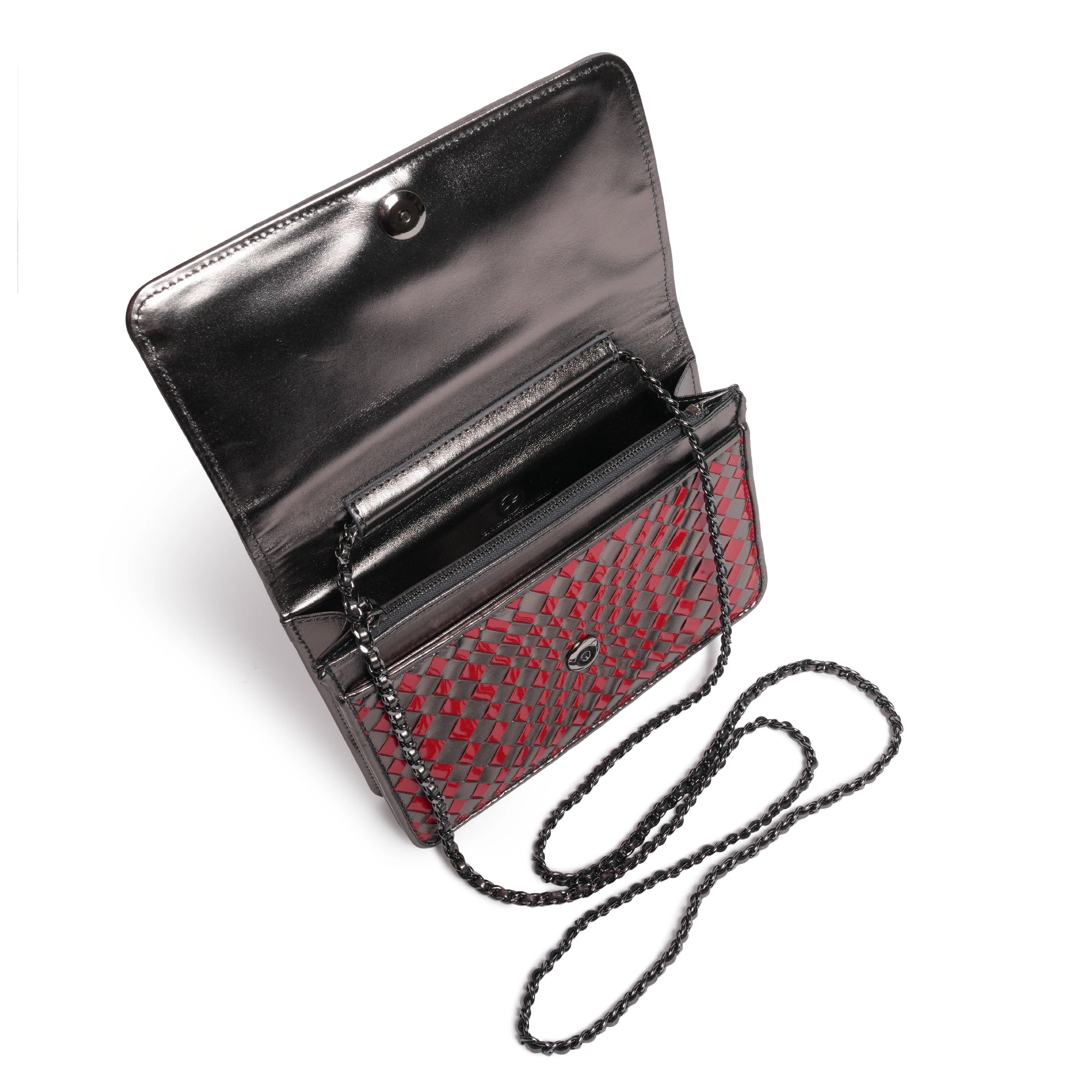 A statement of Italian craftsmanship and modern femininity, this intrecciato leather crossbody clutch is designed to stand out while remaining timeless. Handwoven in a striking gunmetal and red leather combination, the bag showcases the precision and artistry of traditional intrecciato techniques, reinterpreted with a bold, contemporary edge.