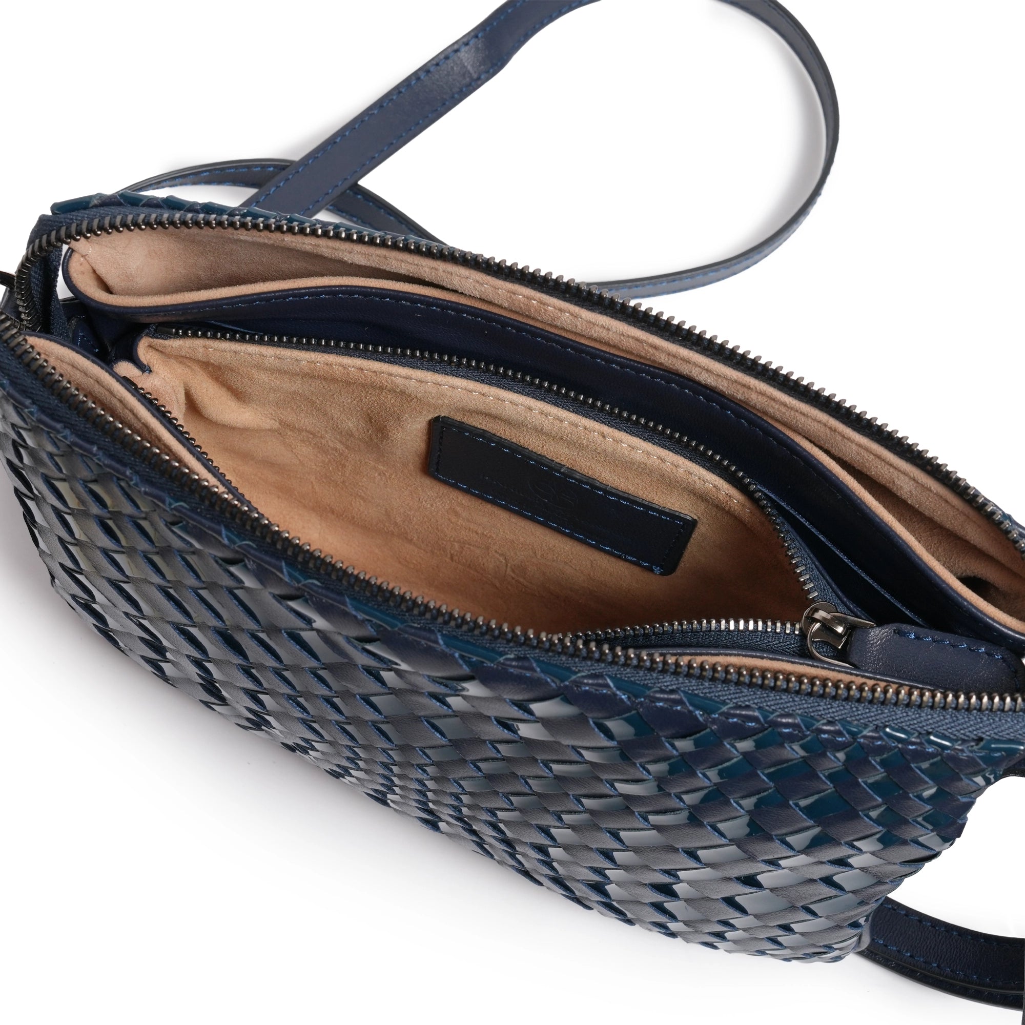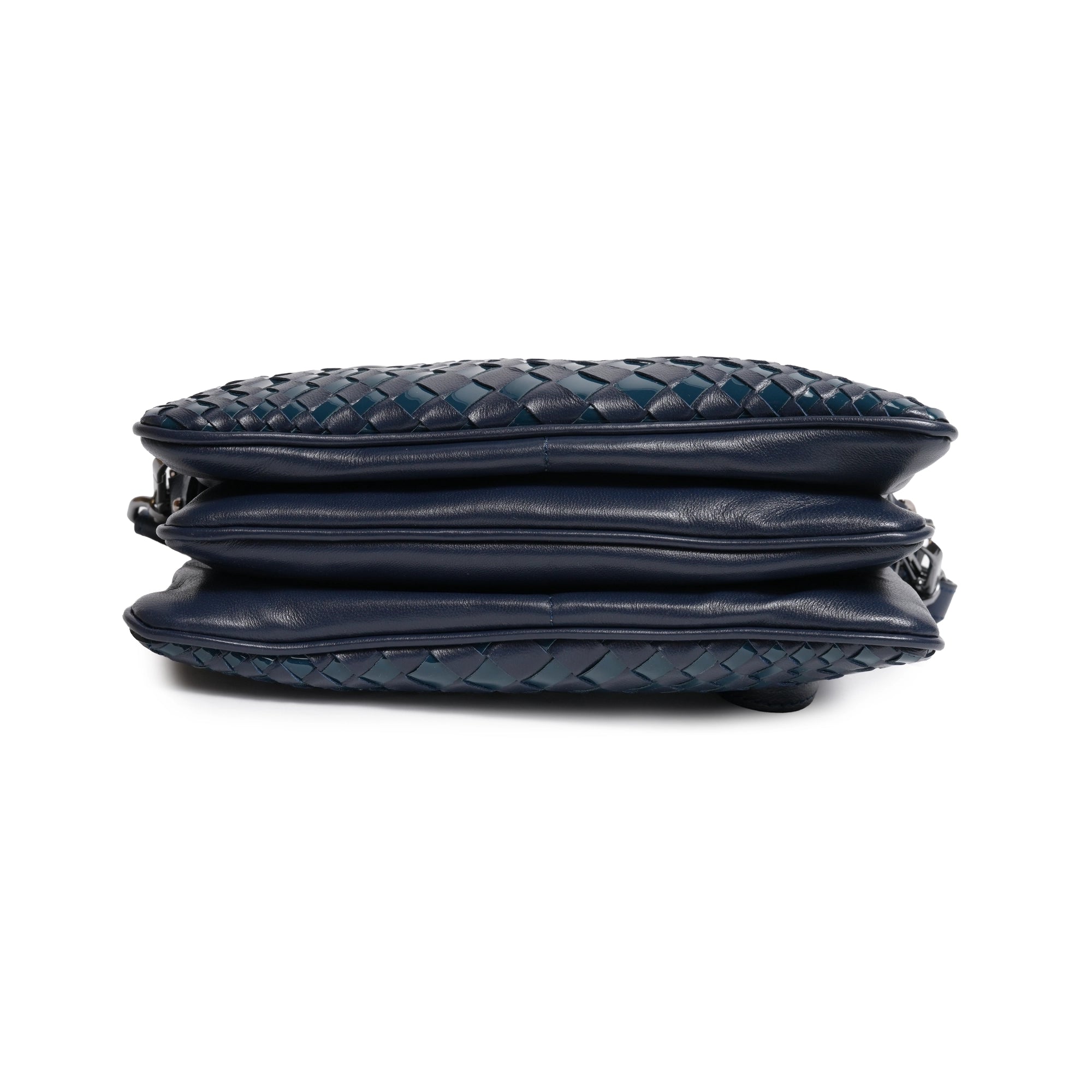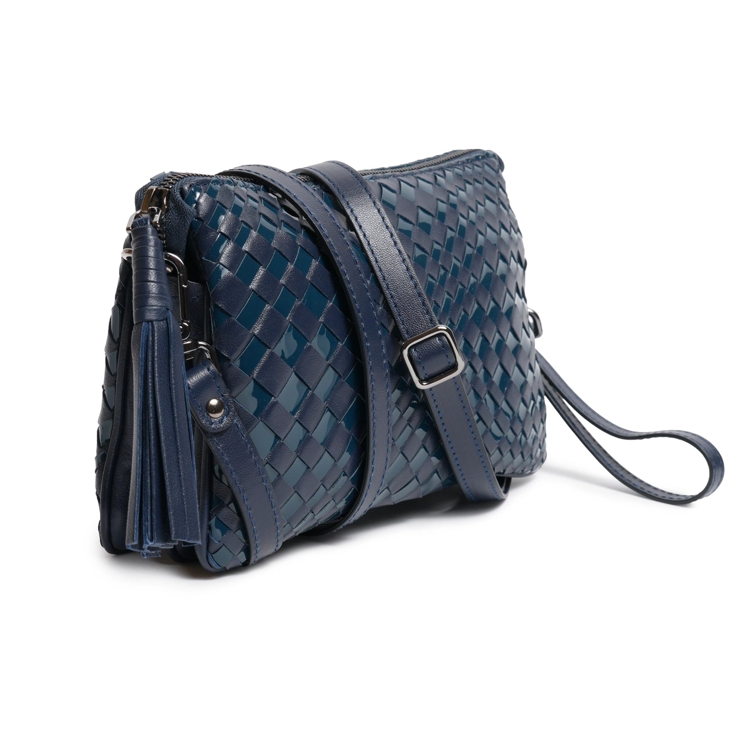 The Women's Intrecciato Leather Zippered Clutch in Optical Nappa and Patent Carta da Zucchero (Deep Blue) is a refined balance of craftsmanship and smart design. Handcrafted in Italy, this sleek accessory features the signature Intrecciato weaving technique reimagined with a bold optical pattern—giving a modern twist to a timeless classic.