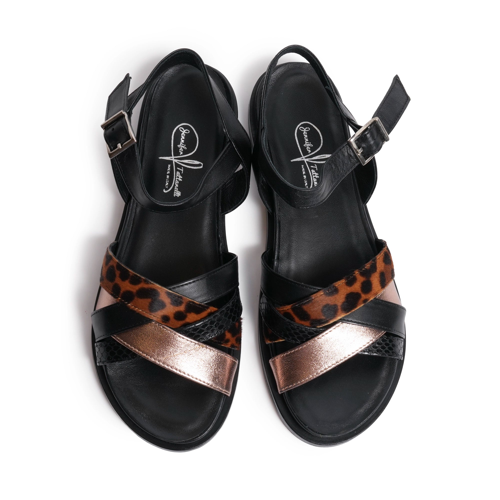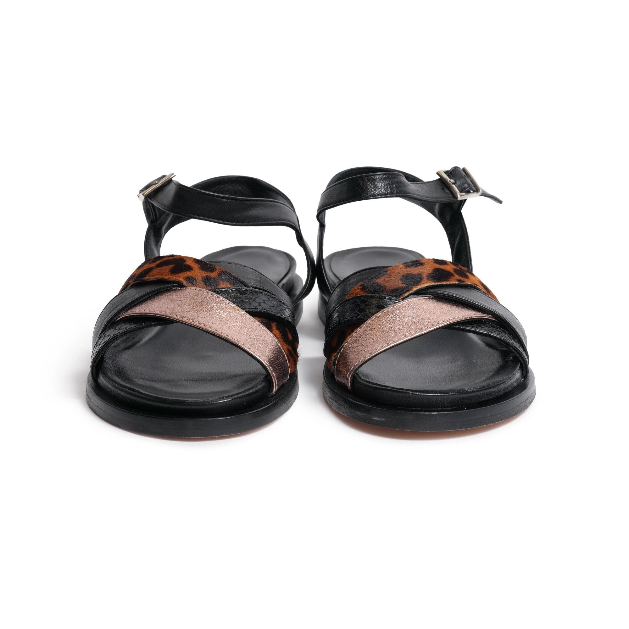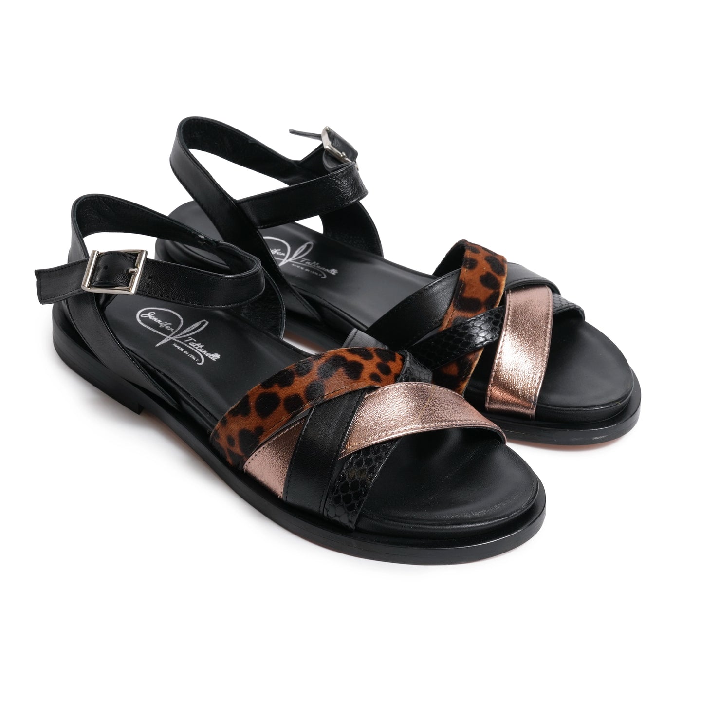 Women Ankle Strap Leather Sandal in Leopard Print and Black Nappa