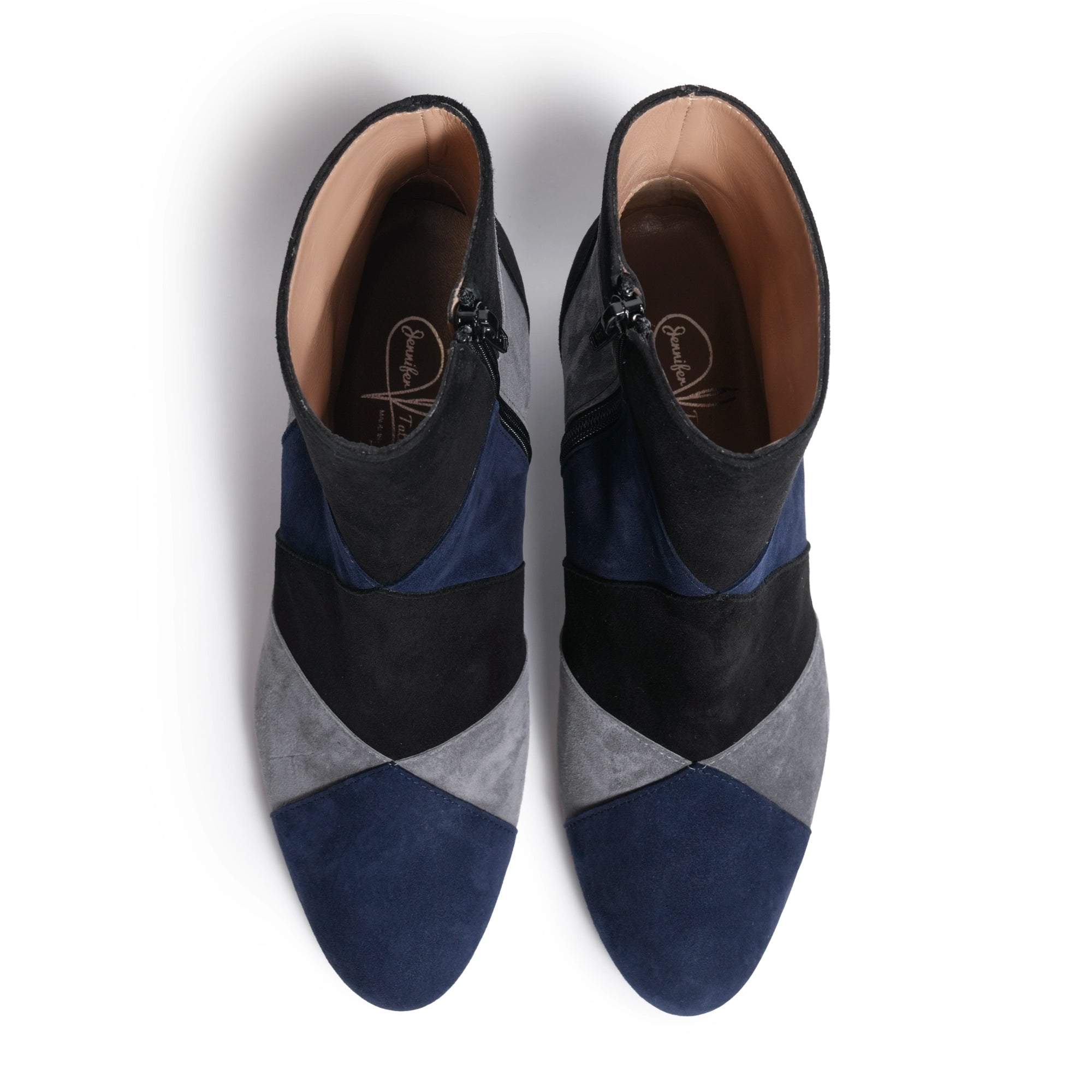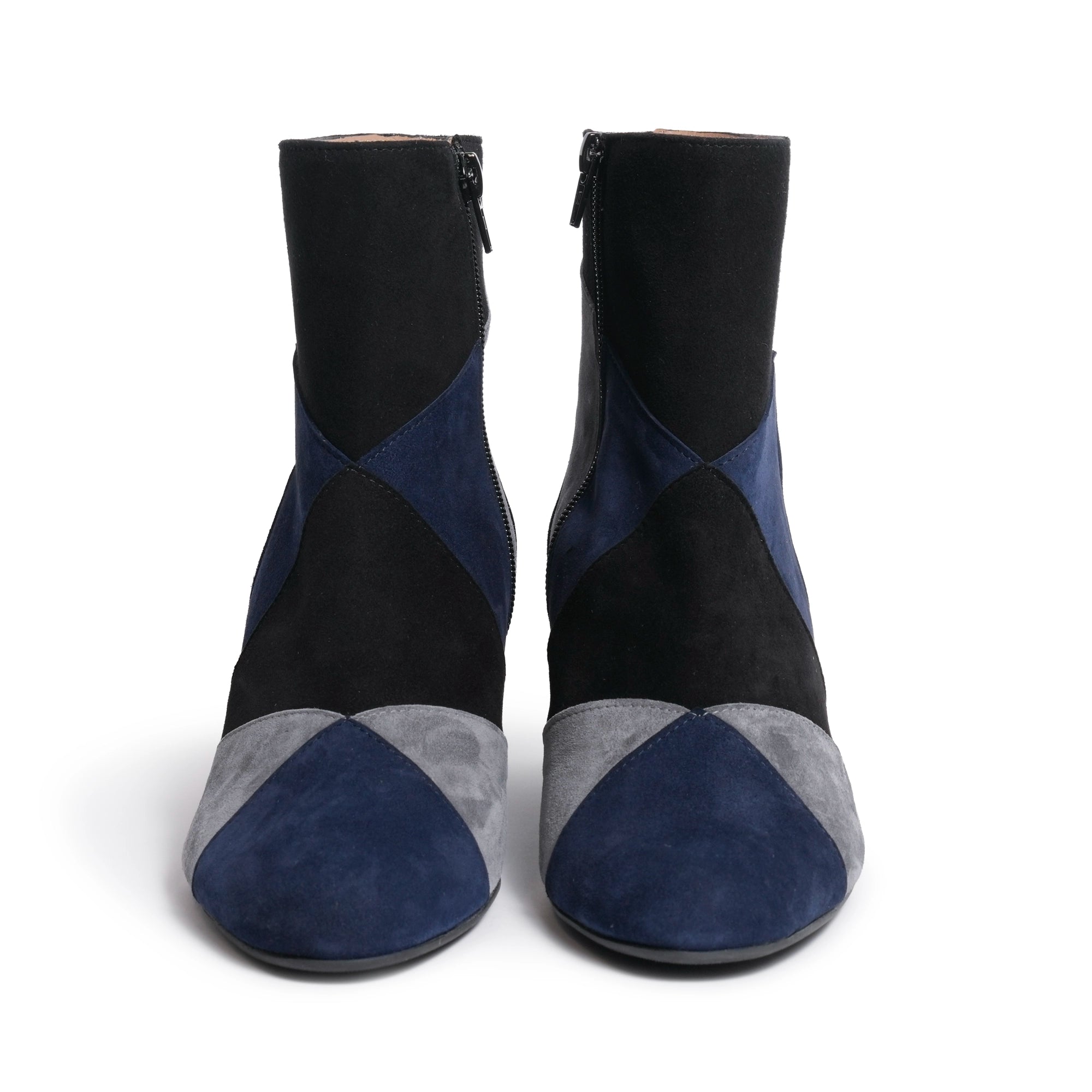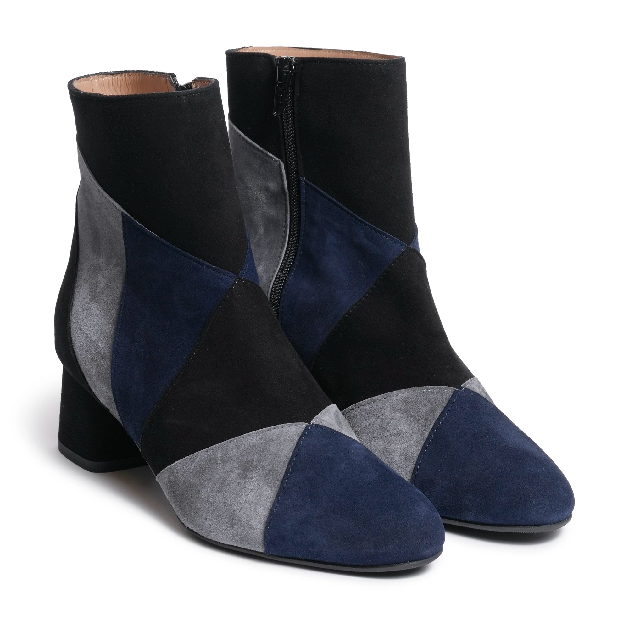 Expertly handcrafted in Florence, these suede leather booties combine three refined tones — Carta da Zucchero (Deep Blue), Charcoal Grey, and Black — in an elegant color-block pattern that adds dimension and sophistication.