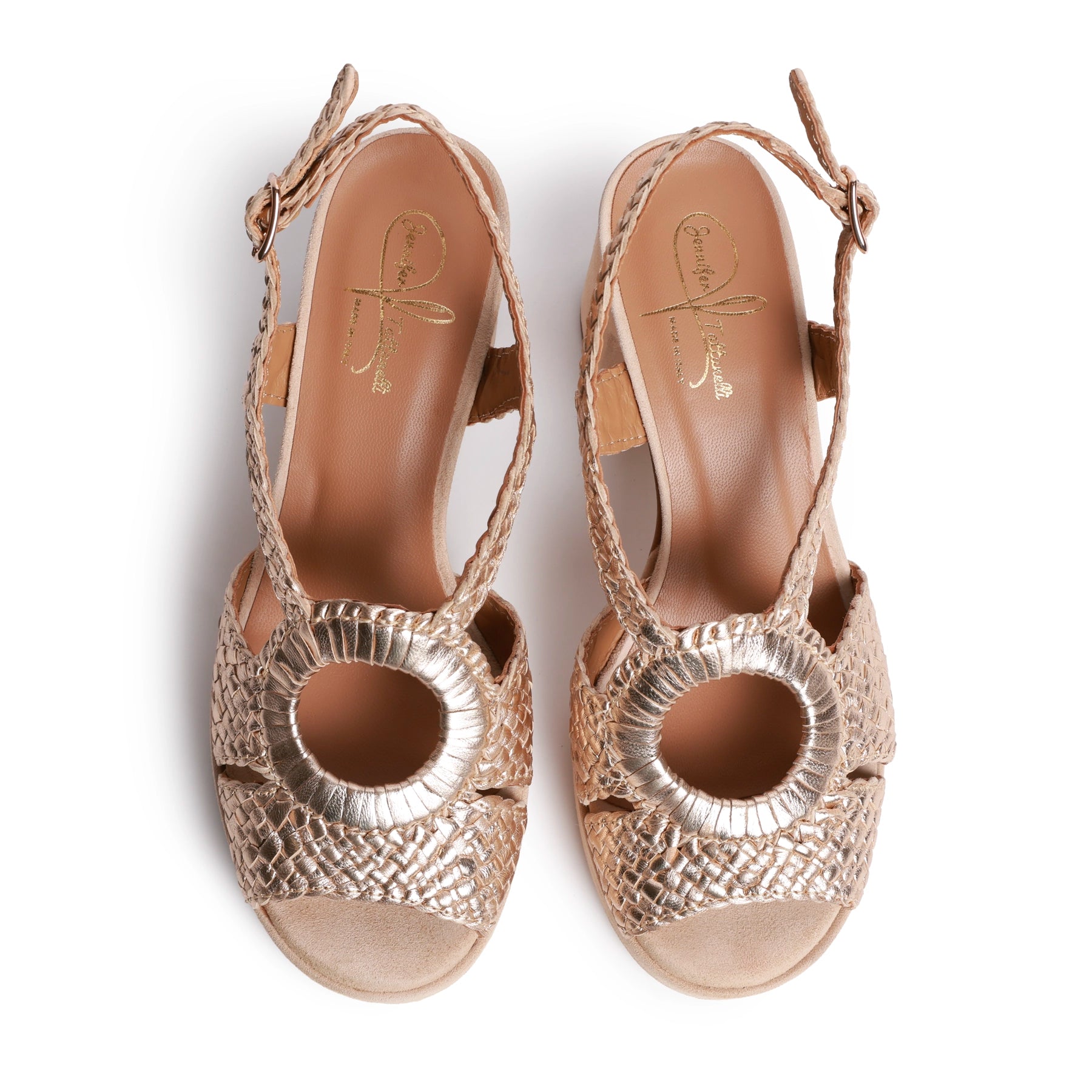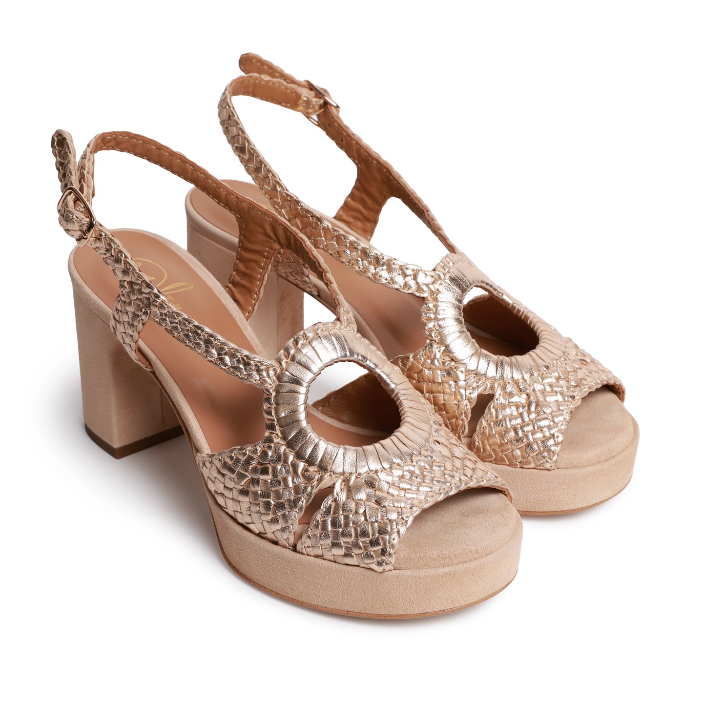 The softly cushioned leather insole provides lasting comfort, balanced by a sturdy block heel and subtle platform that add height without sacrificing stability. The laminated gold finish elevates both day and evening looks — equally striking styled with flowing summer dresses, tailored linen suits, or elevated resort wear.