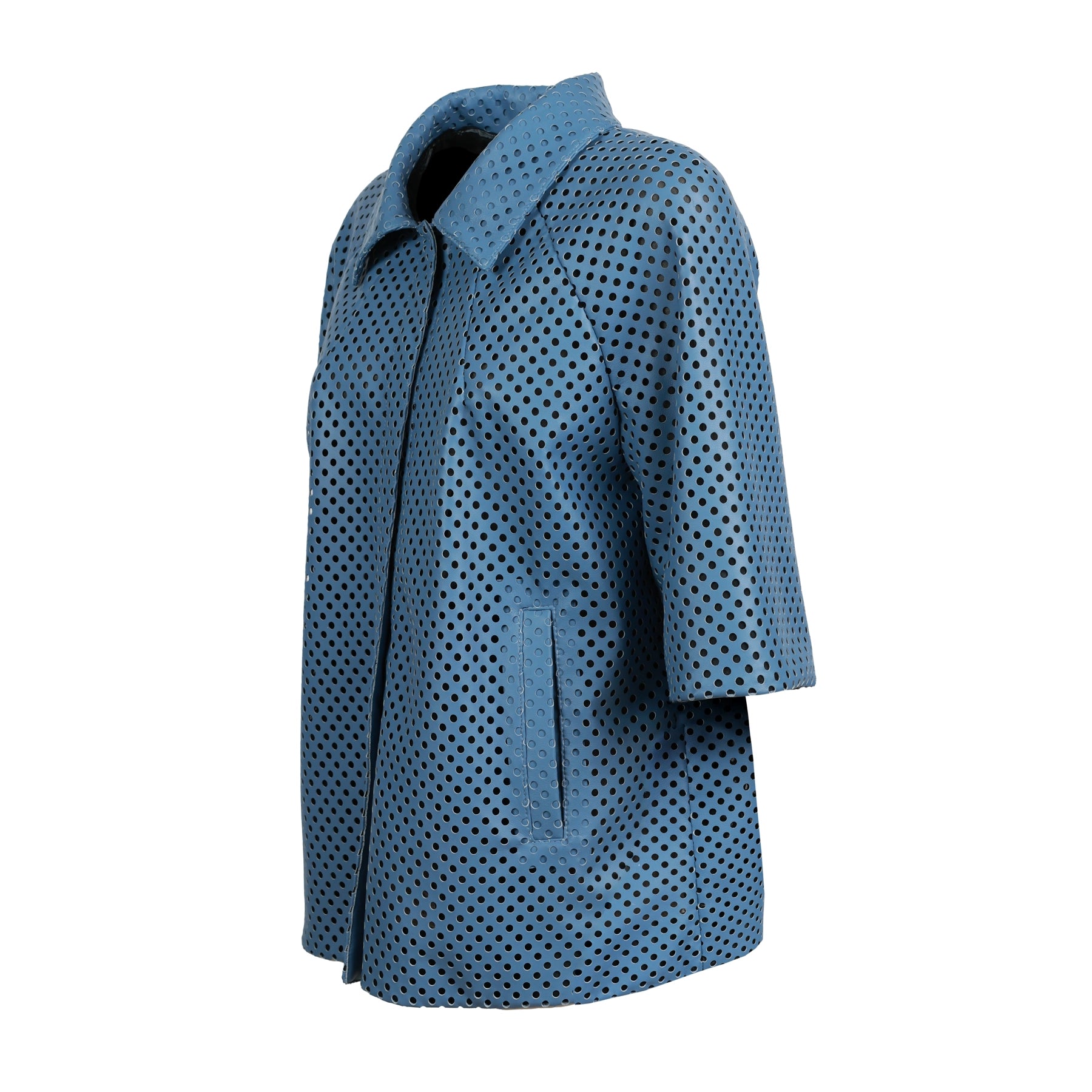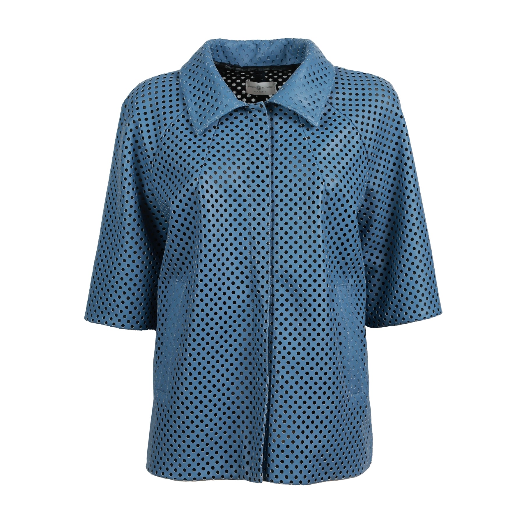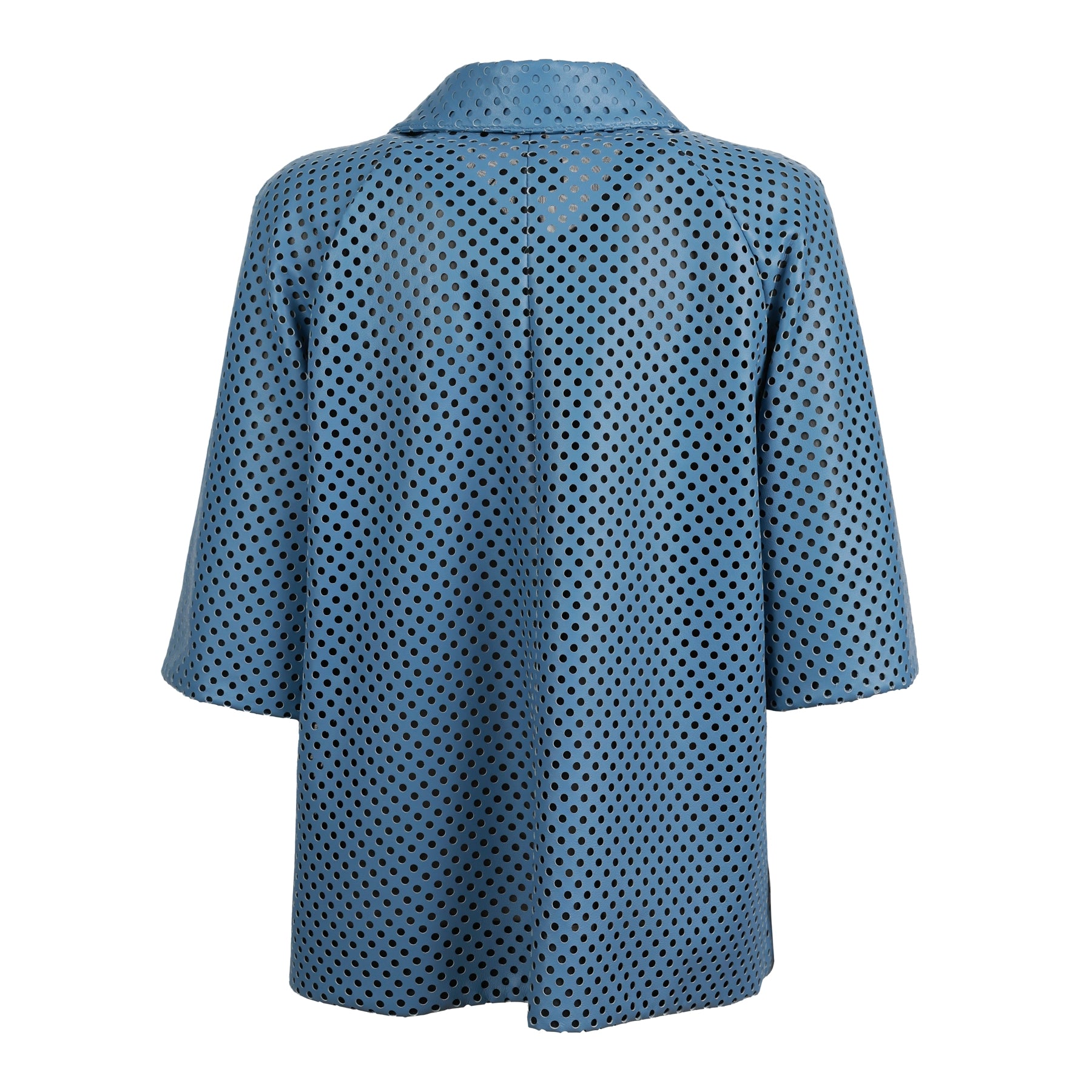 The silhouette is clean and modern, with a classic collar, three-quarter sleeves and discreet front closure that maintains a minimal aesthetic.